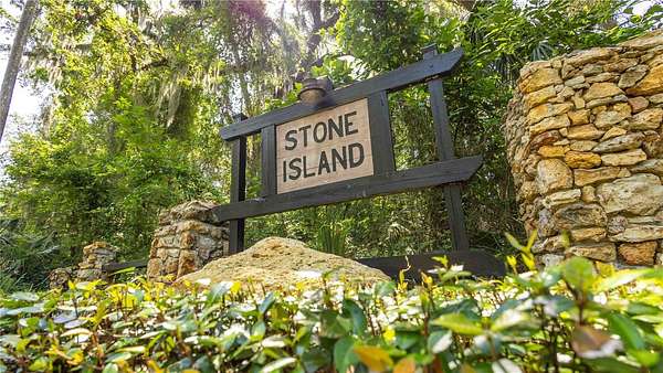 For an authentic Stone Island scenic experience: From I-4 East, take Exit 108. Turn left onto Debary Ave. In approximately one mile, turn right onto Main Street. Continue on Main Street as it veers left along Lake Monroe, becoming Lakeshore Drive. Turn right onto Stone Island Road. Turn right onto Stone Trail. Go over the wooden bridge, and then turn right onto Harbor Trail. Turn left on Sioux Trail. The lot will be the first on the right.