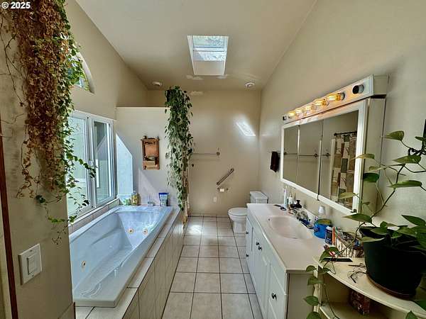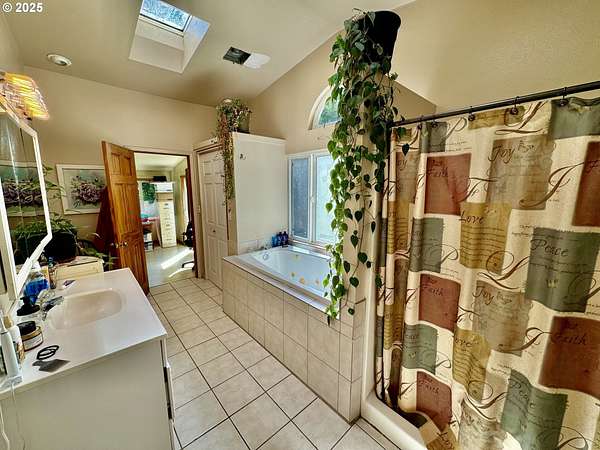 - Ceiling Fan, Laundry, Skylight, Soaking Tub, Tile Floor, Vaulted Ceiling, Vinyl Floor, Wallto Wall Carpet