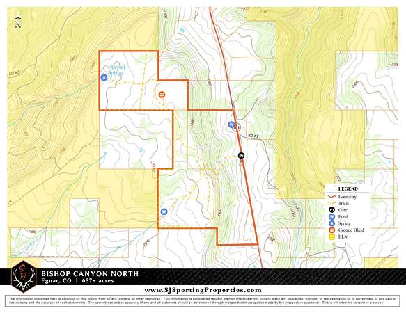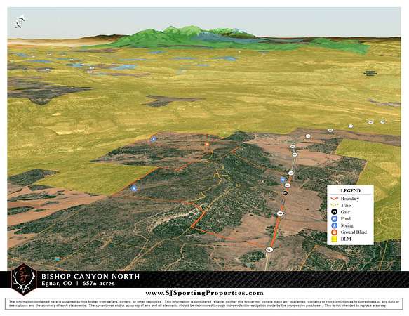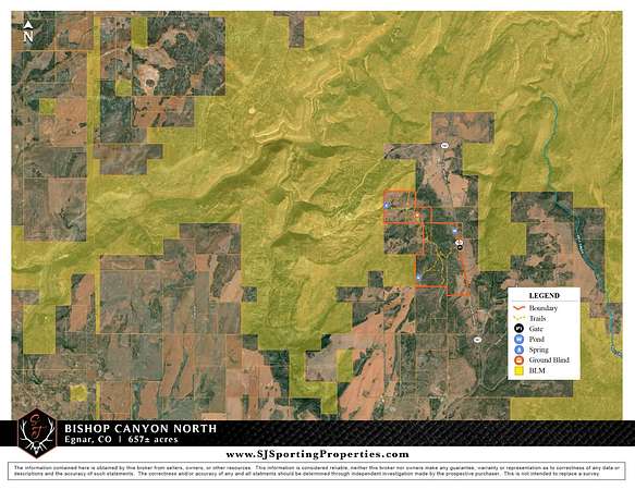 Bishop Canyon North is a 644± acre property nestled in the breathtaking landscapes of Southwestern Colorado, with the option to be combined with Billy Canyon South (632± acres). The property delivers stunning panoramic views of Colorado and Utah and sits adjacent to thousands of acres of BLM public land. This is a secluded property with diverse terrain-cliffs, draws, pinions, junipers, sagebrush, and native grasses-plus a private trail system and year-round access via county roads with power available. There is prime hunting in the area (GMU 711) and on the property, featuring B&C Mule Deer (resident and migratory, with 200"+ bucks harvested) and robust Elk herds (300"+ bulls, including migratory 350"+ from Utah). The property qualifies for Landowner Preference Program (LPP) Mule Deer vouchers, which can be sold, while Elk tags are OTC for 2nd and 3rd rifle seasons. Additional game includes mountain lion, black bear, turkey, and small game. Water sources on the property (seasonal dirt tanks and a year-round spring with pond), along with plenty of feed and bedding habitat, support thriving wildlife. Bishop Canyon North elevation spans 7,300-7,600 feet, and its framed by the La Sal, San Juan, and Abajo Mountains, Uncompahgre Plateau, and Disappointment Valley. The property features a diverse terrain of cliffs and draws, and is covered with pinions, junipers, sagebrush, native grasses. There is year-round access off Highway 141 (where power is located), has a private trail system within the property, and is partially fenced. The property is just hours from Arches, Canyonlands, Mesa Verde, and Glen Canyon. Nearby towns like Dove Creek (15-20 mins), Cortez (45 mins), and Durango (1 hr 25 mins) offer amenities, while Moab (1 hr 30 mins) and Telluride (2 hrs) add adventure. Bishop Canyon North is a beautiful hunter's paradise and a gateway to iconic Southwestern landscapes.