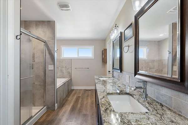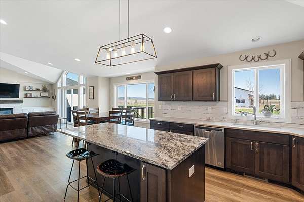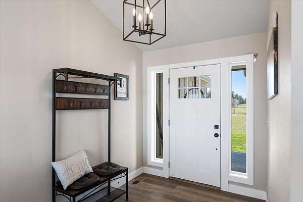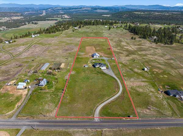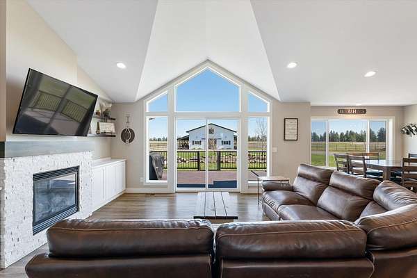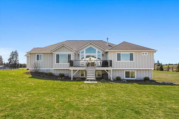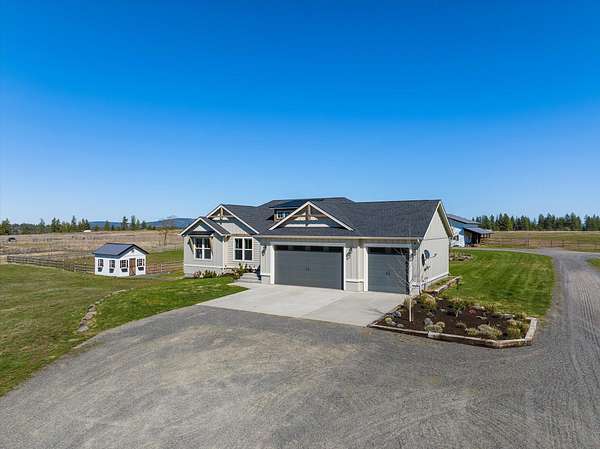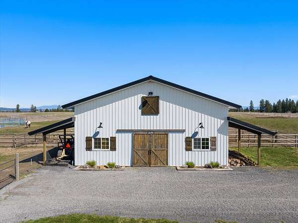 Welcome to your dream farmhouse retreat where modern comfort meets wide-open country living! Set on level acreage, this stunning rancher offers serenity and convenience, just minutes from downtown Spokane, northside, Airway Heights, and the Spokane Airport. Inside, a dramatic wall of floor to ceiling windows fills the open concept living space with natural light and showcases panoramic views. The gourmet kitchen features beautiful cabinetry, quartz countertops and stainless appliances. The main-level primary suite includes a luxurious bathroom with soaking tub and separate shower, double sinks and a walk-in closet. Main floor laundry. Fully finished walk-out basement with wet-bar and family room, workout space, bedroom and bathroom. Outdoors enjoy landscaped grounds, orchard trees, sprinkler system and multiple entertainment spaces. Equestrian ready 48x36 barn with lean-tos, 4 matted stalls, tack room, hay storage, fencing and a 100x200 outdoor arena, and a chicken house! This is truley a lifestyle home!