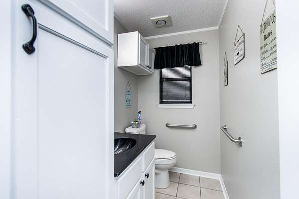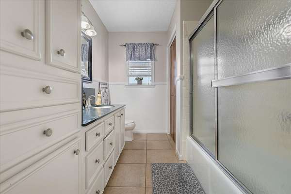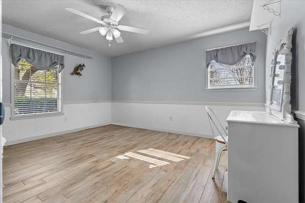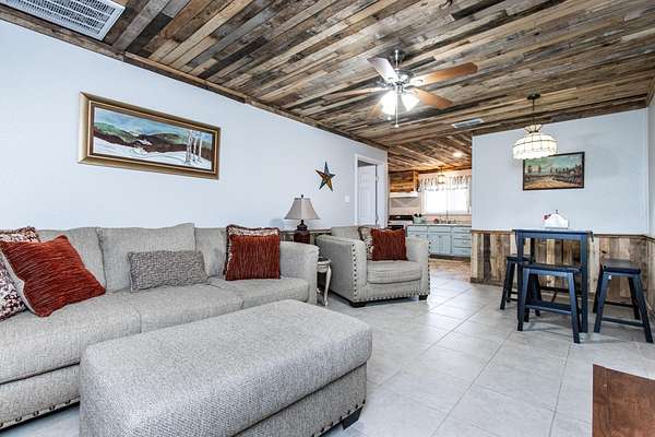 - Blinds, Ceiling Fan, Paneling, Shades/Blinds, Tile Flooring
