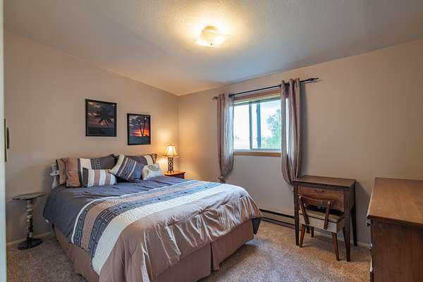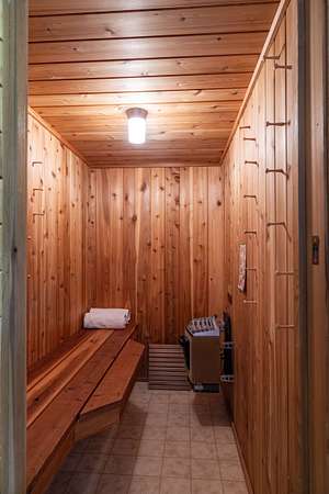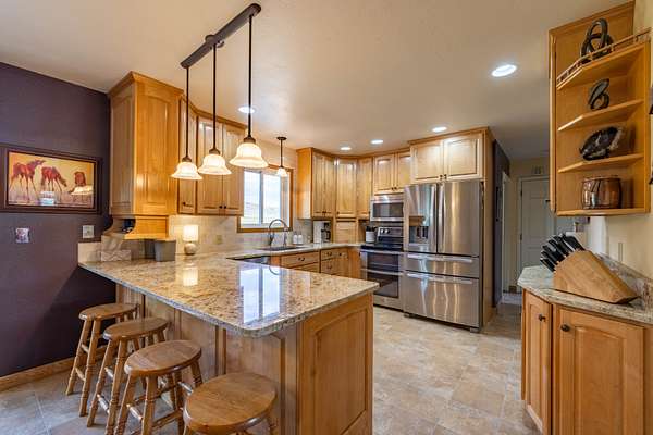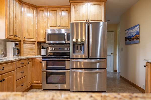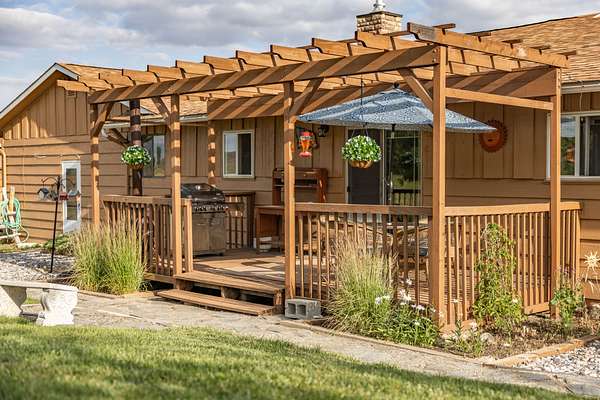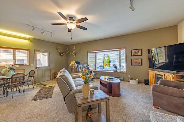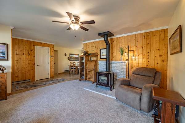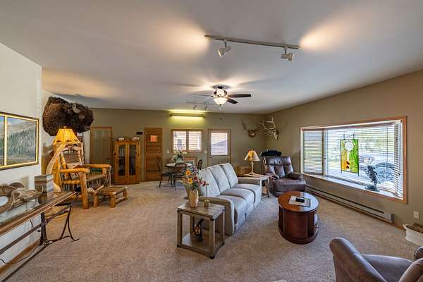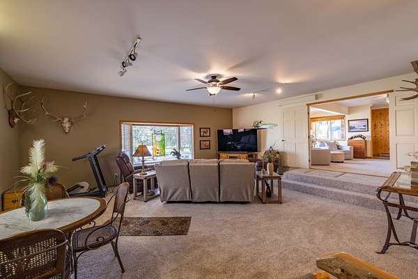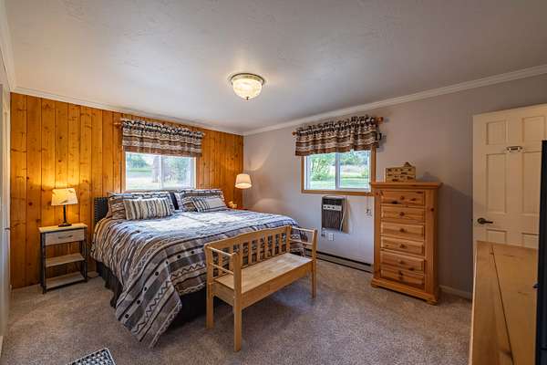 The spacious single level home features four oversized bedrooms and three full bathrooms, including a private sauna, the perfect spot to relax after a day outdoors. A charming covered front patio welcomes you in, overlooking a serene front yard shaded by mature trees and visited often by deer, pheasants, and local wildlife.
