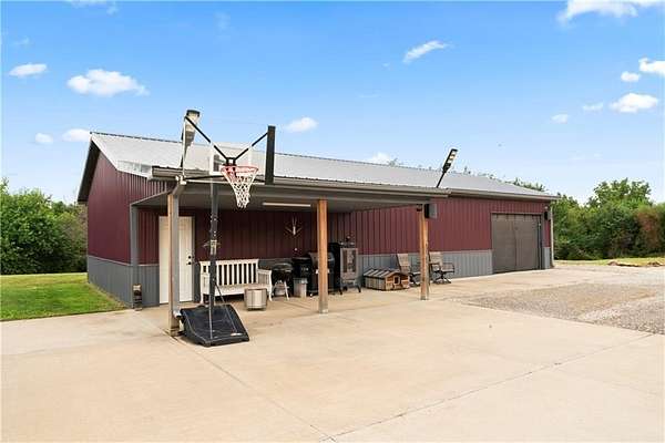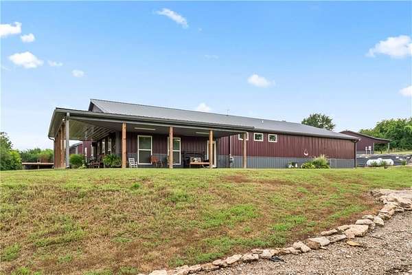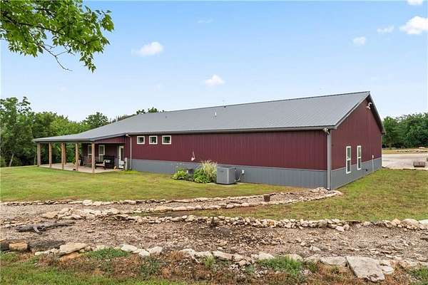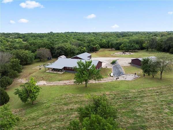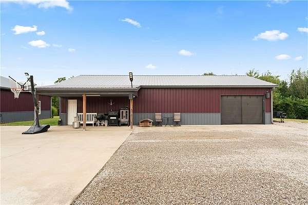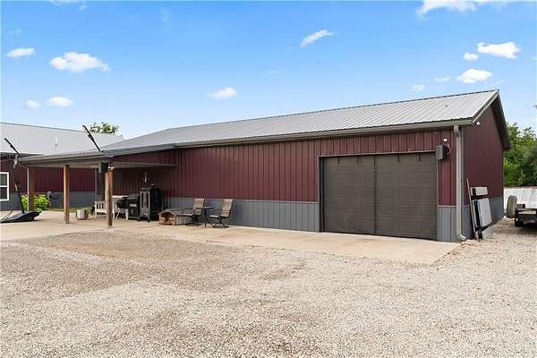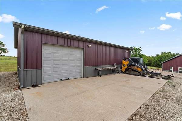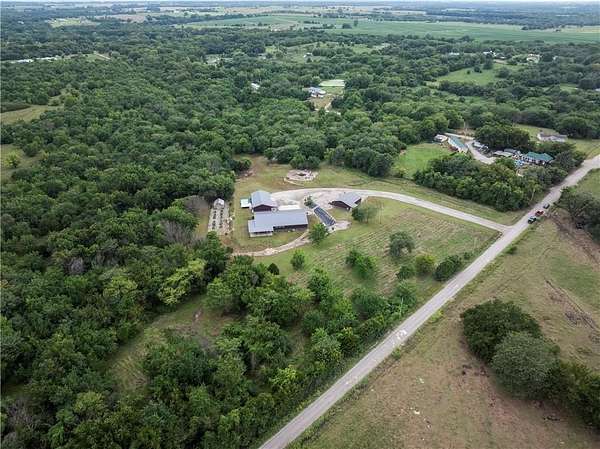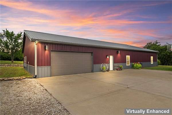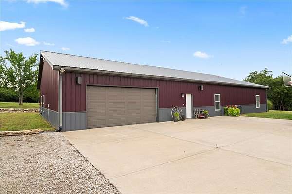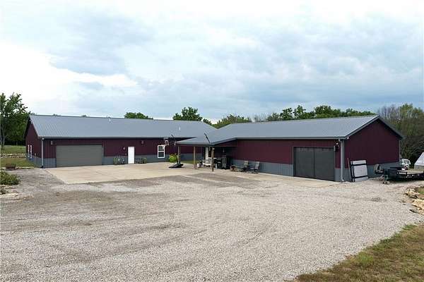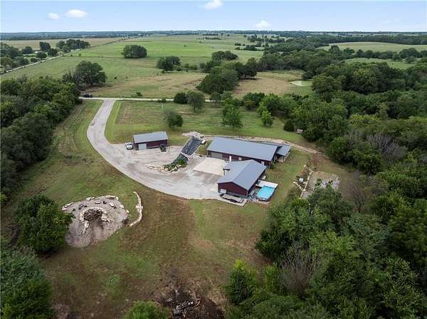 Tucked away on 45.5 wooded acres, just 40 minutes from Overland Park and less than 5 minutes from Drexel, this one-of-a-kind retreat delivers million-dollar views and unmatched privacy. The custom-built, maintenance-free home offers over 3,000 sq. ft. of thoughtfully designed living space, blending high-end comfort with the beauty of nature. A wraparound porch overlooks a wet-weather creek, mature timber, and an ever-changing backdrop of wildlife. Inside, the massive great room is perfect for gatherings, anchored by a striking gourmet kitchen built for entertaining. Quality craftsmanship is evident throughout, with 2x6 construction, spray foam insulation, 10 ft.. ceilings throughout, oversized doors, custom windows, and rich woodwork. The primary suite offers an oversized walk-in shower, dual sinks, and walk-in closet, while every room, including the oversized garage, feels spacious and inviting. Outdoors, enjoy your own private paradise with a custom fire pit and over two miles of trails for exploring. A 30x40 insulated metal shop with a concrete floor provides space for equipment or hobbies. For even more, the property includes a 30x55 private gym or recreation building with a kitchenette, full bath, and a large theater area, ideal for movie nights, workouts, or hosting friends. With wide-open skies, modern amenities, and complete seclusion, this is a rare opportunity to live the ultimate outdoor lifestyle, without compromise. Follow the winding driveway and discover your new sanctuary. Home is priced below appraised value.