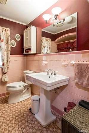 The 1949 residence includes five bedrooms--three on the main level, one in the lower level, and an in-law suite--along with two full bathrooms, a full basement, and a three-seasons porch positioned for sunset views. Original hardwood floors, an oversized midcentury bathroom, and curved steel kitchen cabinets--possibly Berger--highlight the home's enduring craftsmanship.
