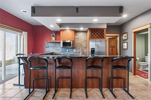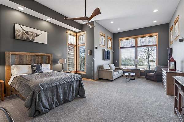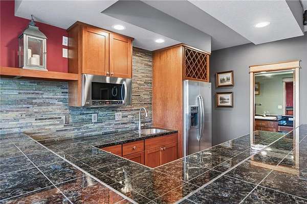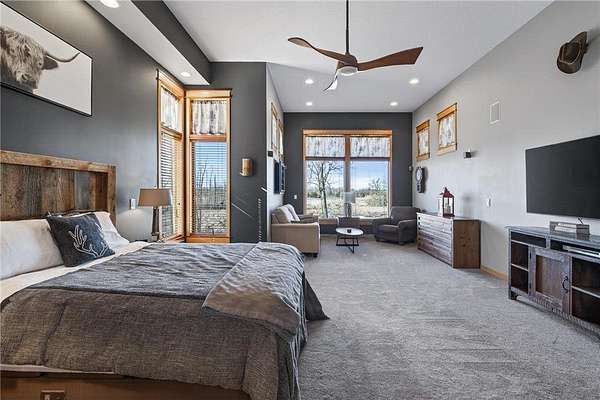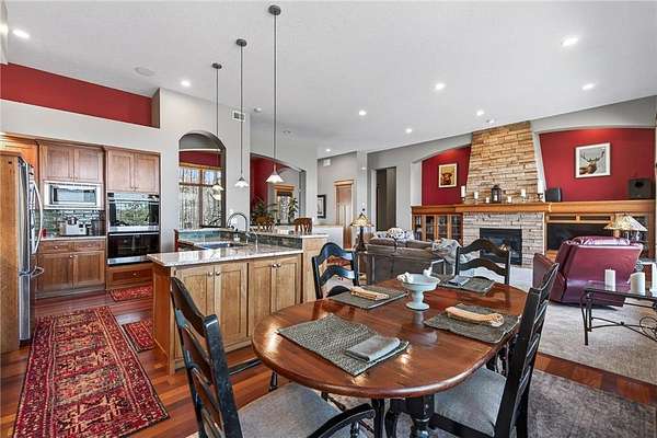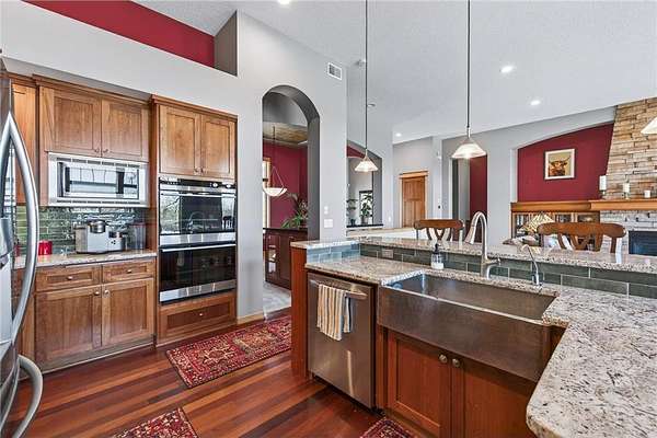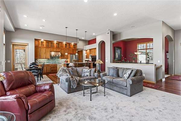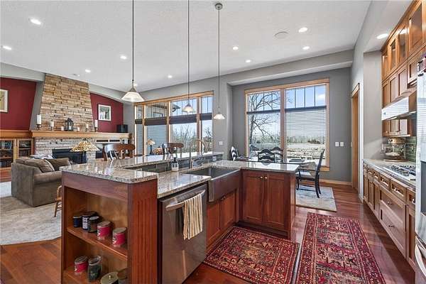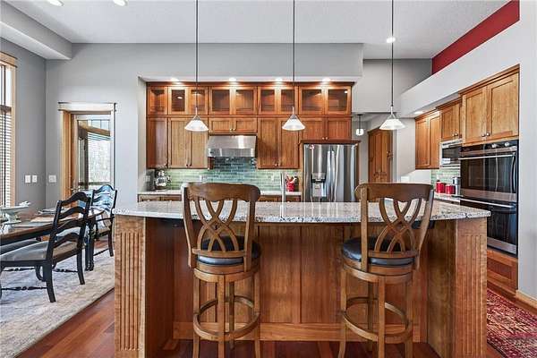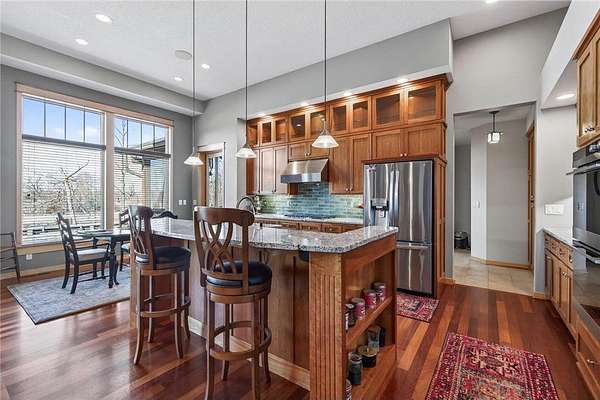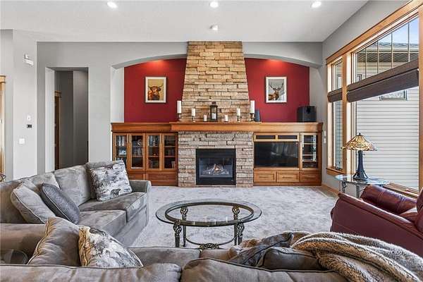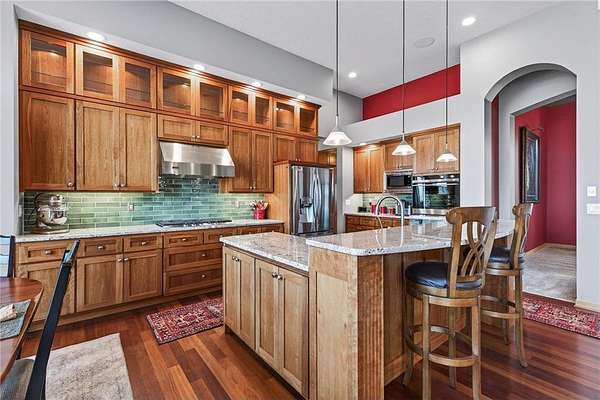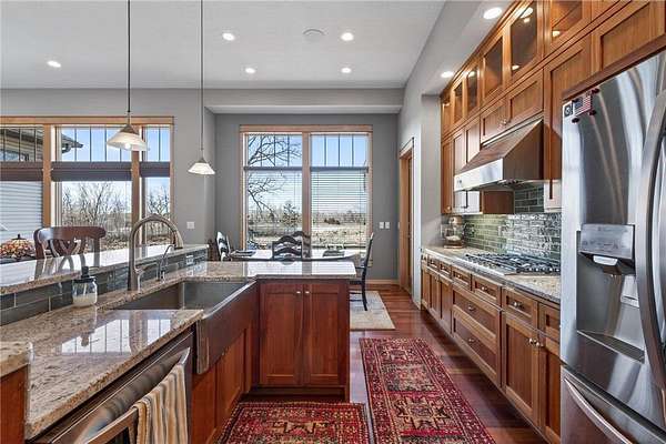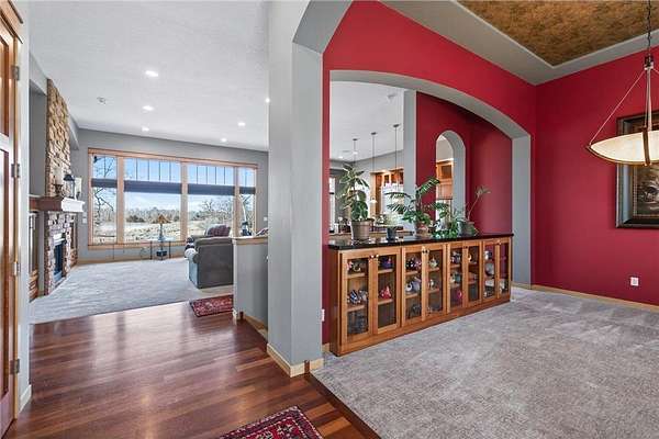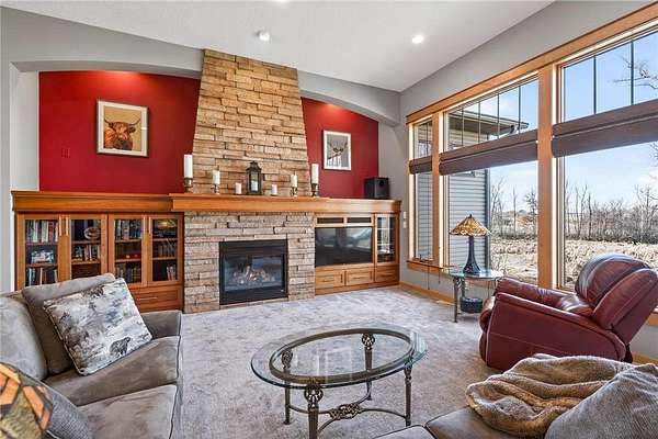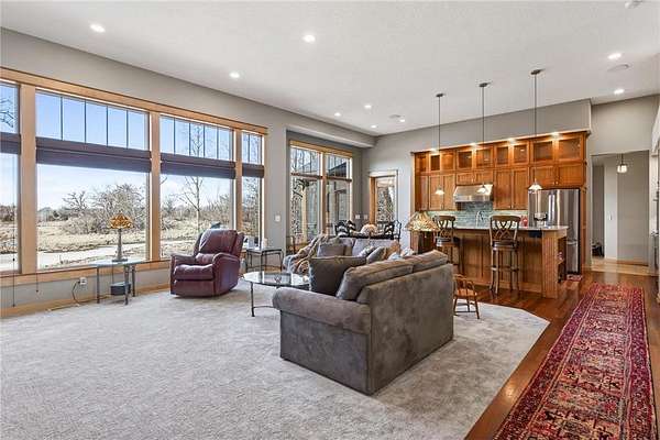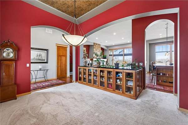 This turnkey walkout rambler delivers the kind of craftsmanship and finish detail that stops you the moment you walk through the door. Soaring 12-foot ceilings set the tone for an open, airy main level anchored by a stunning great room with custom built-ins, a gas fireplace, and panoramic views of the surrounding wetlands. Eight-foot cherry doors and hand-crafted millwork flow throughout, lending the home a warmth and intentionality you feel in every room.