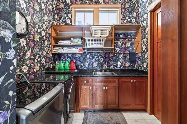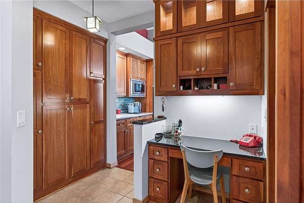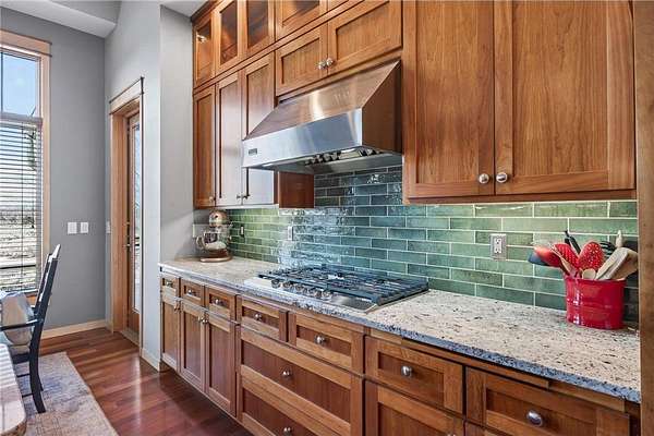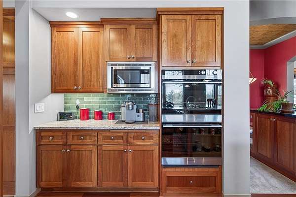 The renovated kitchen is both beautiful and functional, featuring granite countertops, a tiled backsplash, cherry cabinetry, double wall ovens, and a cooktop. A built-in Bluetooth stereo system lets you set the mood from the kitchen to the living room without missing a note.