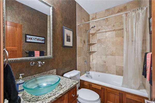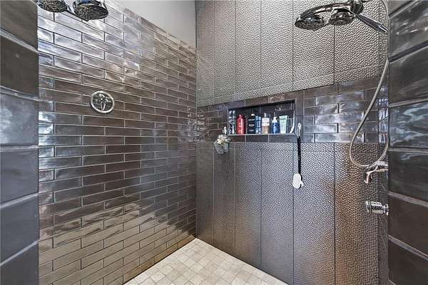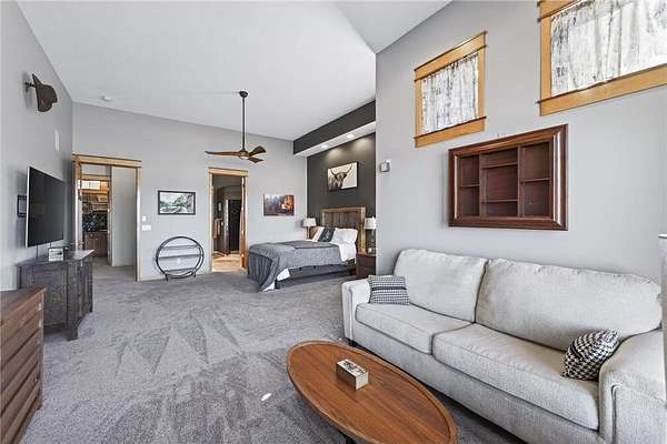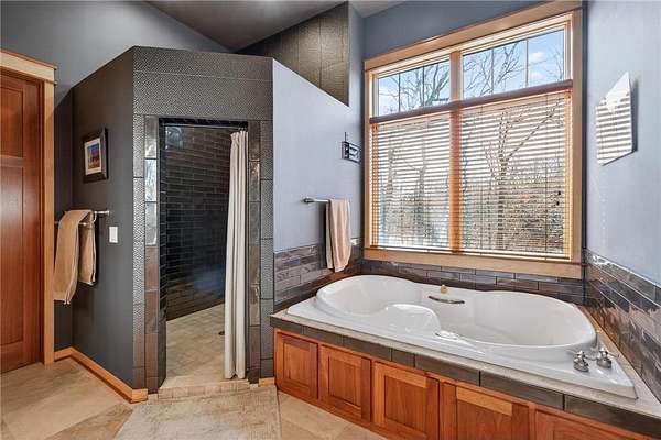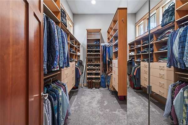 The main floor primary suite is a true retreat, complete with a sitting area and a spa-inspired bath featuring a jetted tub, a large two-person tiled walk-in shower, and a custom-organized walk-in closet that connects directly to the laundry room.