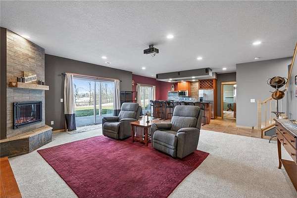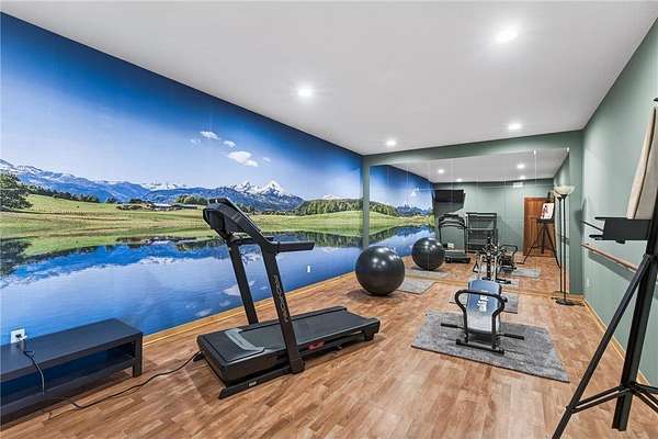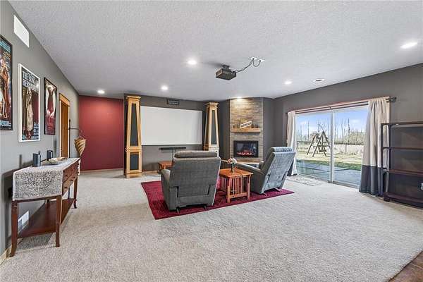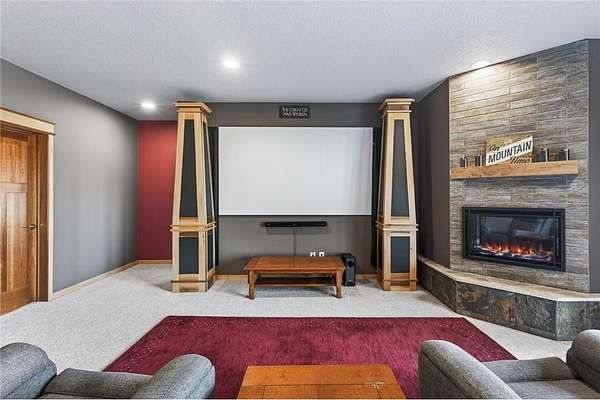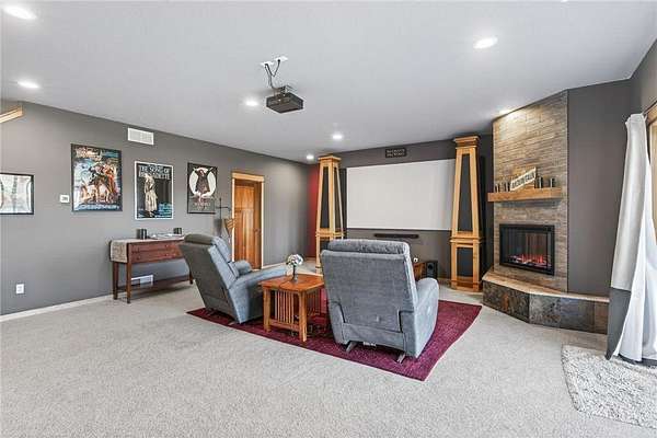 Downstairs, the walkout lower level is designed for both everyday living and elevated entertaining. In-floor radiant heat (boiler replaced 2024) keeps the space comfortable year-round, while a full kitchen and bar, electric fireplace, and a home theater with 5.1 surround sound make this level a destination in itself. Two generously sized ensuite bedrooms with private baths offer ideal accommodations for guests or multigenerational living. A dedicated workout room and hot tub-ready patio with TV wiring round out the lower level.