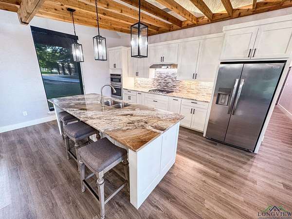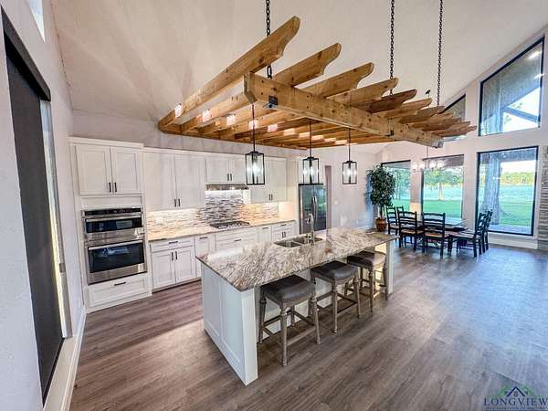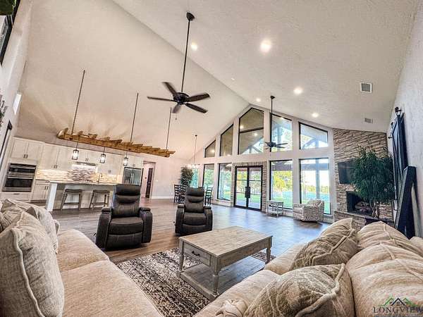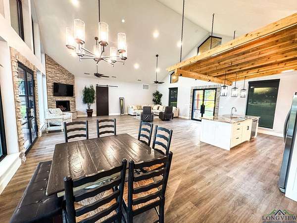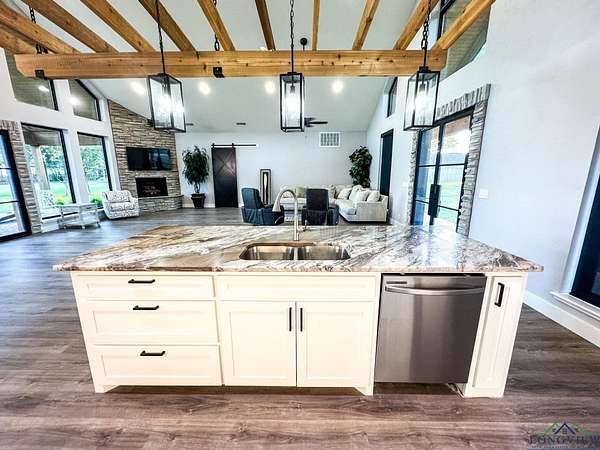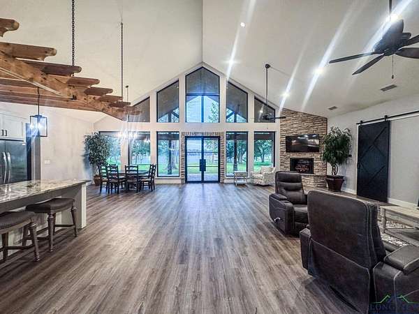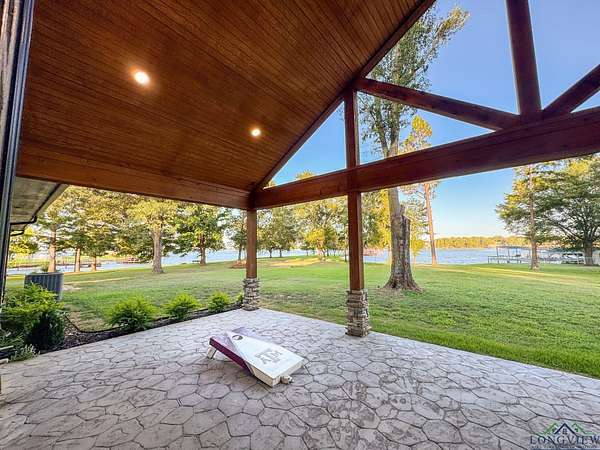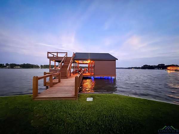 Over three stunning lakefront acres await your arrival at this breathtaking estate on the shores of Lake Bob Sandlin. Pass the grazing wildlife through the quiet neighborhood of Cherokee Trail and immerse yourself in lakeside luxury at this 2476 sq ft three bedroom, two bath home where rustic elegance meets everyday comfort. Situated perfectly on an exclusive, lush peninsula on one of Texas most esteemed lakes, approx. 780 ft of water frontage ensures plenty of room for the whole family to make memories to last a lifetime. The homes exterior blends hardy board with stone and wood beam accents, creating a warm, timeless welcome. A sprawling front yard shaded by pecan and towering trees sets the stage, while a brand-new driveway and large carport make arrivals effortless. Step inside to soaring ceilings and a living room filled with natural light, where grand lake views pour in through walls of glass. The open design invites you to relax or entertain, whether gathered around the bar area or cooking with brand new stainless steel appliances in a kitchen that has never been lived in. The three spacious bedrooms and two baths feature large walk-in tile showers, while the master suite elevates luxury with a walk-through closet custom fitted with built-in shelving. Outdoors, this property is a playground. Wander barefoot across cool grass, enjoy magical sunsets on the peninsula, or host games of volleyball and water sports with friends. The boathouse offers everything for lake life: a storage room, electronic boat and jet ski lifts, a bar with sink and grill, and a sundeck for soaking in the rays. A retaining wall wraps the shoreline, ensuring peace of mind while you fish with friends or take in the best views of Fourth of July fireworks. For projects or storage, a massive spray-foamed metal shop with three oversized roll-up garage doors and its own bathroom is perfect for boats, hobbies, or creating your own workspace. The grounds also feature a well shed and privacy with a mix of chain-link and wooden fencing. An automatic Mist Away outdoor insect spray system keeps the house, shop, and dock structures protected. For all your lake life needs round the corner to discover Big Als Barefoot Bay a newly redesigned lakefront hub with a store stocked with conveniences, a boat dock, a restaurant with live entertainment, and much more. This is more than a home; its a lifestyle where barefoot days, starlit nights, and lakeside fun are all right at your fingertips.