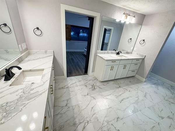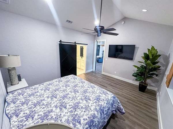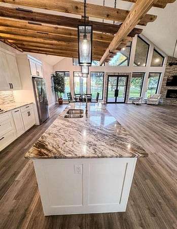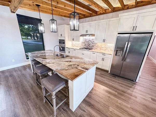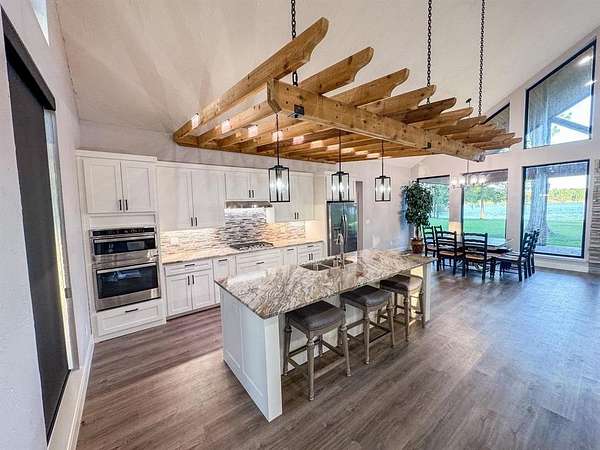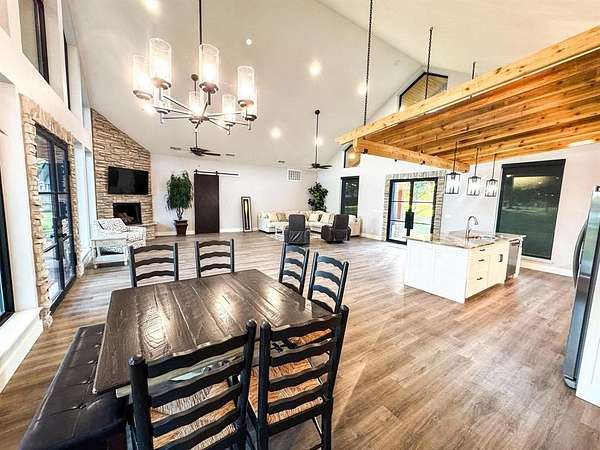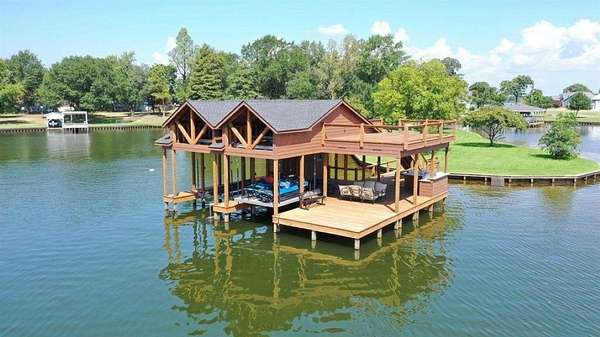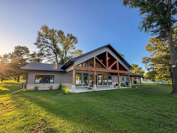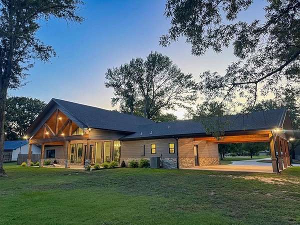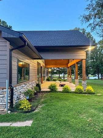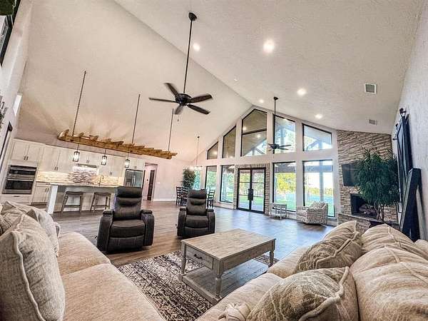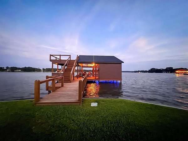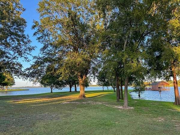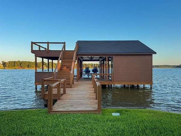 Over three stunning lakefront acres await your arrival at this breathtaking estate on the shores of Lake Bob Sandlin. Pass the grazing wildlife through the quiet neighborhood of Cherokee Trail and immerse yourself in lakeside luxury at this 2476 sq ft three bedroom, two bath home where rustic elegance meets everyday comfort. Situated perfectly on an exclusive, lush peninsula on one of Texas most esteemed lakes, approx. 780 ft of water frontage ensures plenty of room for the whole family to make memories to last a lifetime. The homes exterior blends hardy board with stone and wood beam accents, creating a warm, timeless welcome. A sprawling front yard shaded by pecan and towering trees sets the stage, while a brand-new driveway and large carport make arrivals effortless. Step inside to soaring ceilings and a living room filled with natural light, where grand lake views pour in through walls of glass. The open design invites you to relax or entertain, whether gathered around the bar area or cooking with brand new stainless steel appliances in a kitchen that has never been lived in. The three spacious bedrooms and two baths feature large walk-in tile showers, while the master suite elevates luxury with a walk-through closet custom fitted with built-in shelving. Outdoors, this property is a playground. Wander barefoot across cool grass, enjoy magical sunsets on the peninsula, or host games of volleyball and water sports with friends. The boathouse offers everything for lake life: a storage room, electronic boat and jet ski lifts, a bar with sink and grill, and a sundeck for soaking in the rays. A retaining wall wraps the shoreline, ensuring peace of mind while you fish with friends or take in the best views of Fourth of July fireworks. For projects or storage, a massive spray-foamed metal shop with three oversized roll-up garage doors and its own bathroom is perfect for boats, hobbies, or creating your own workspace. The grounds also feature a well shed and privacy with a mix of chain-link and wooden fencing. For all your lake life needs round the corner to discover Big Als Barefoot Bay a newly redesigned lakefront hub with a store stocked with conveniences, a boat dock, a restaurant with live entertainment, and much more. This is more than a home; its a lifestyle where barefoot days, starlit nights, and lakeside fun are all right at your fingertips.