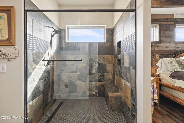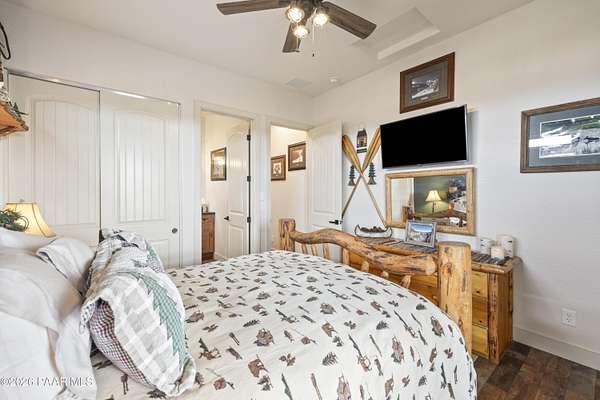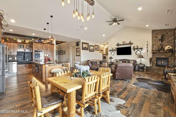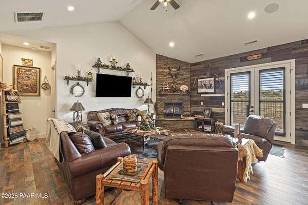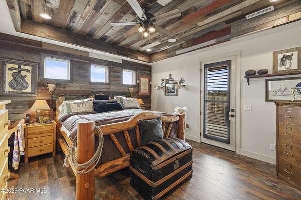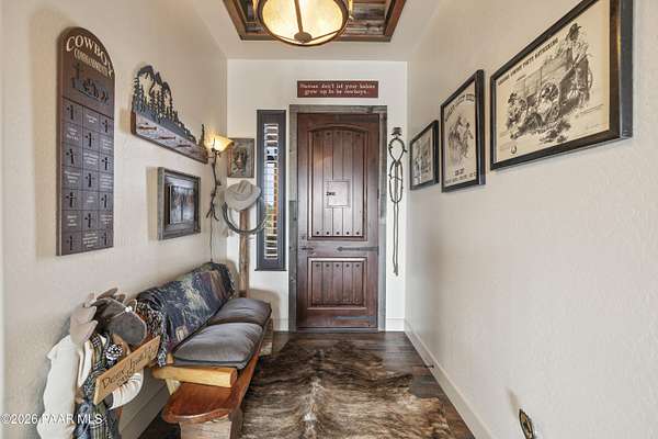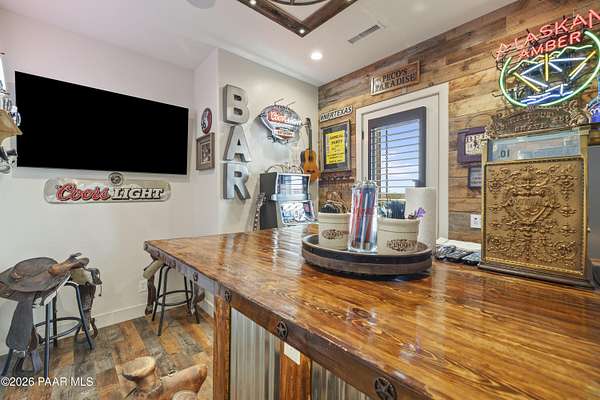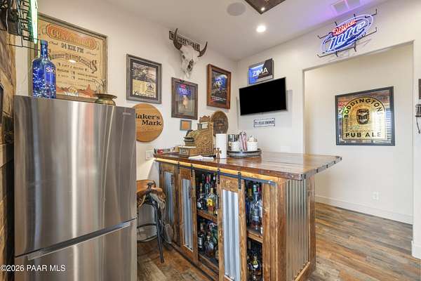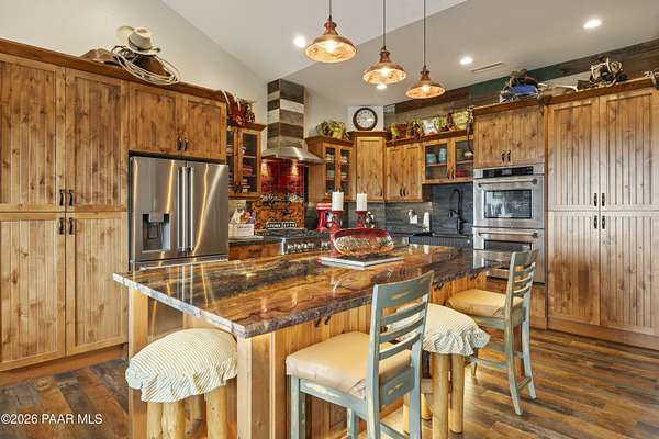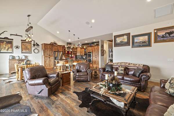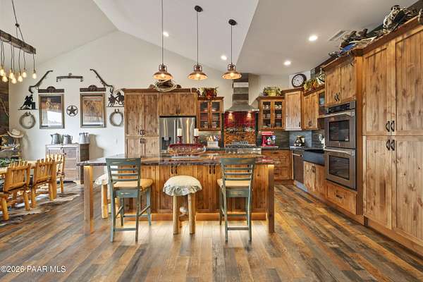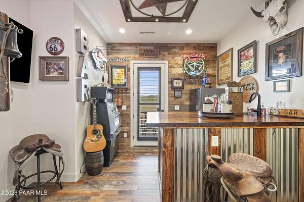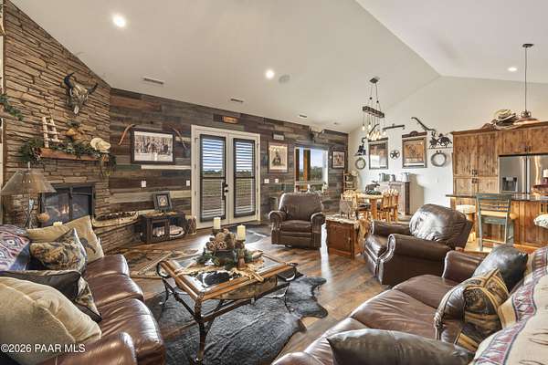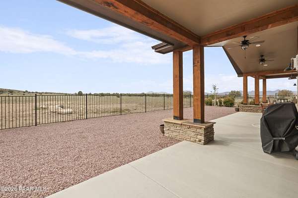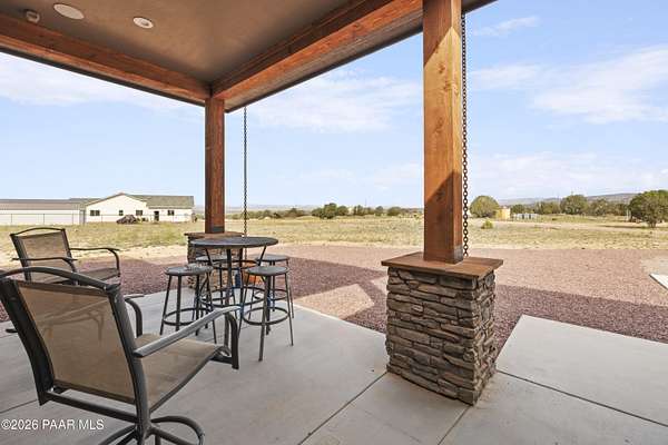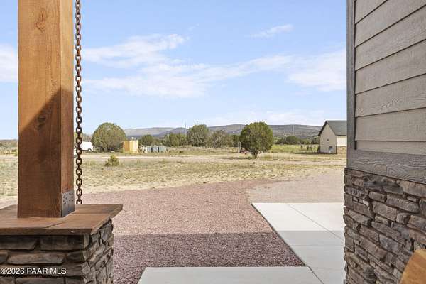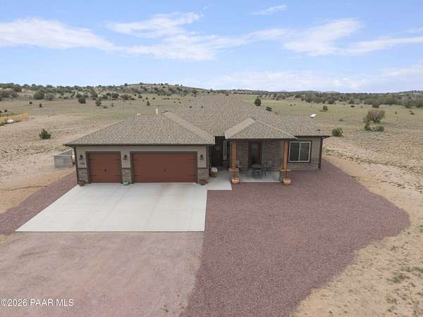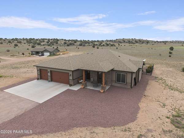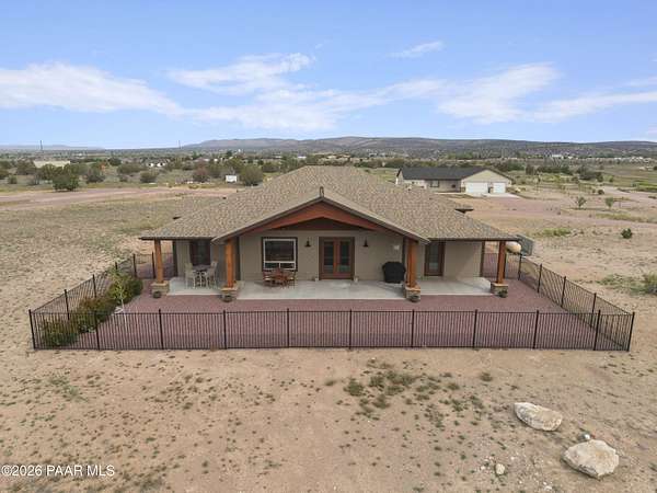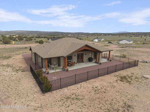 Set on 2.5 acres of wide-open Arizona landscape, this beautifully appointed ranch-style home offers panoramic views and room to roam. Featuring 4 bedrooms and 3 baths, the home showcases custom finished throughout, including rich wood flooring, thoughtfully selected countertops, tile, window coverings and lighting that reflect timeless Western charm. The upgraded kitchen is a chef's delight, equipped with high-end appliances and designed for both function and style. Guests will feel right at home in the private ensuite bedroom, perfect for extended stays. The versatile fourth bedroom is currently a bar/game room with direct outdoor access-ideal for entertaining. Step outside to a spacious backyard patio where you can take in endless views, with a fully fenced area for pets to roam freely. Zoned for horses, this property offers the flexibility to embrace a true rural lifestyle while remaining just 15 minutes from the Safeway in Chino Valley. Garage is wired for EV charging and surround sound throughout the house. A perfect blend of comfort, character and country living--don't miss this opportunity.
