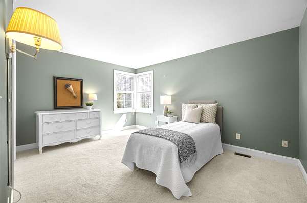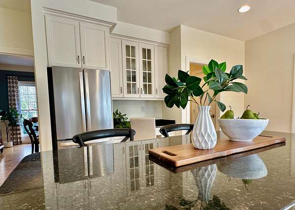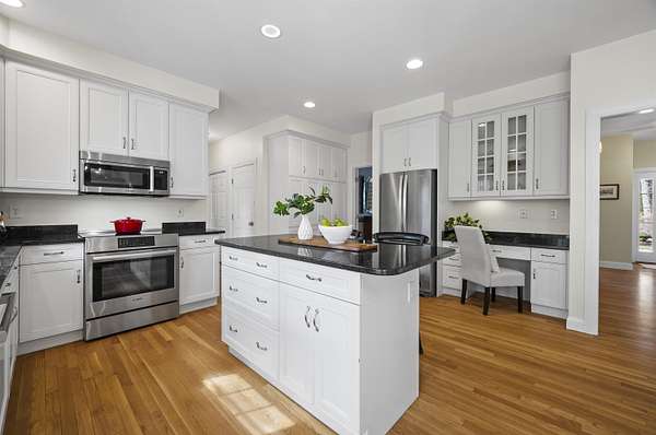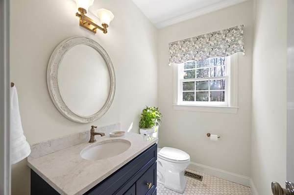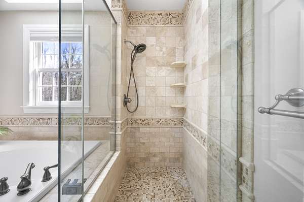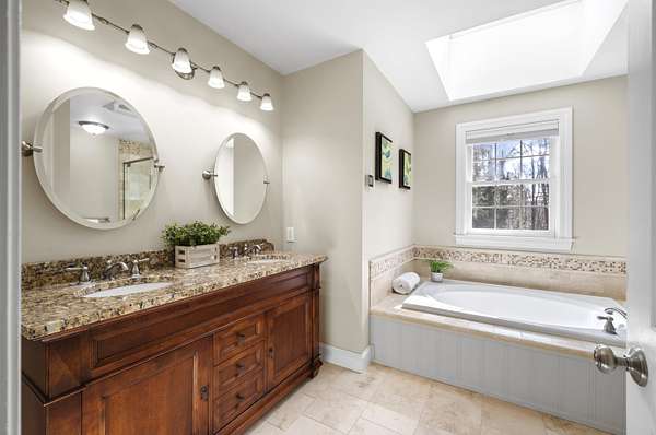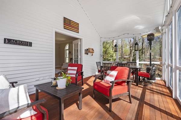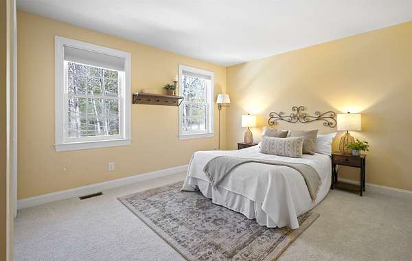 Tucked away in the woods on this secluded cul-de-sac this pristine Colonial home offers privacy on nearly 9 acres with all the convenience of quick access to the Village, top-rated schools, Rt 101 and 101A and all the shopping you could ask for! This well-kept 4 bed 4 bath home with 9ft ceilings features a bright kitchen with brand new appliances including induction range, hardwood floors, lovely granite counters and island as well as SO much storage! The welcoming family room is warmed by a newer Harmon wood stove that can heat the whole first floor and offers access to the most beautiful oversized screen porch that flows effortlessly to the large 2 tier mahogany deck. At the front of the house, sun fills the formal living room with floor-to-ceiling windows while the elegant dining room offers ample room for dinner parties that last for hours. A sizable office sits conveniently near the kitchen next to an updated powder room along with a purpose-built laundry room with handy access to the deck. Upstairs, a large primary suite includes a tidy reading nook, with room for a desk along with 2 walk-in closets and an updated bathroom with custom vanity, tiled shower and a large soaking tub ready for relaxing after a long day. 3 other well-sized bedrooms have loads of light, generous closets and are serviced by a full bathroom with shower and tub, skylight and tiled flooring. Your finished basement adds PLENTY of room for recreation and exercise while leaving space for a bright workshop and lots of storage. Don't miss the epoxy-floored garage complete with organizing system and smart garage doors and lights. Dual Propane and pellet back-up furnaces means 3 heat sources for minimal fuel consumption while central A/C completes the well maintained HVAC systems. Enjoy this great-school town with the peace of mind you get with a newer roof and meticulously kept systems. This is the One!