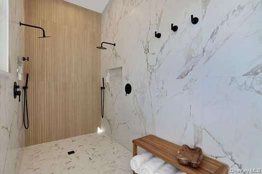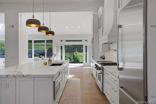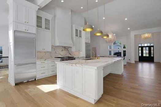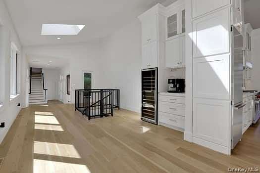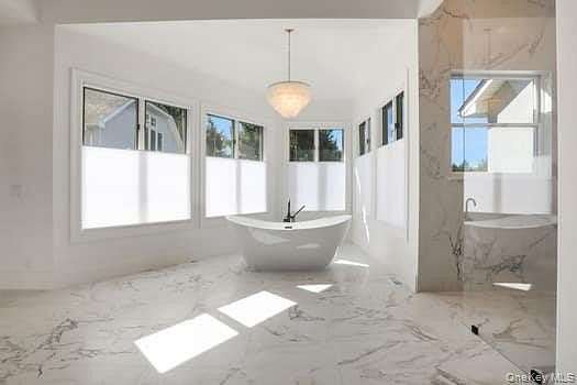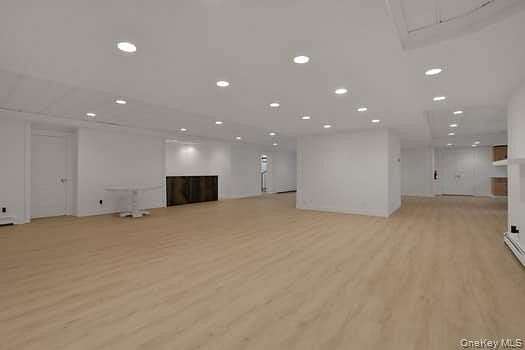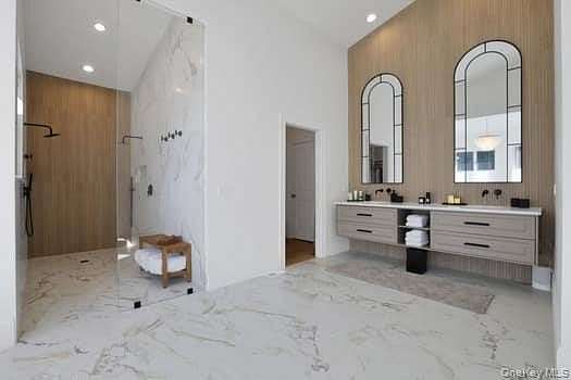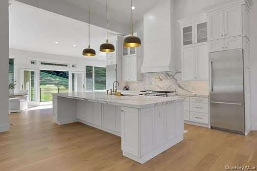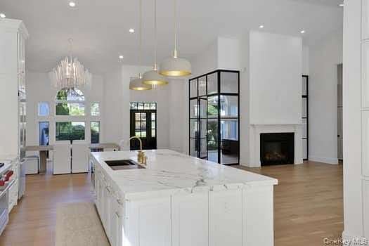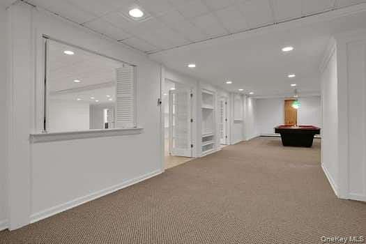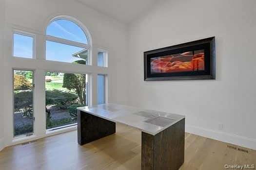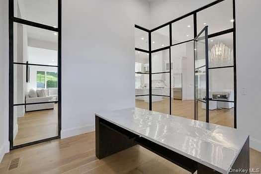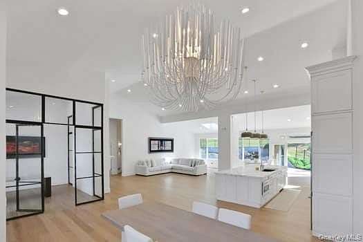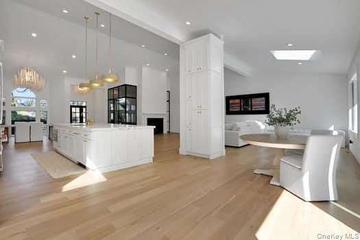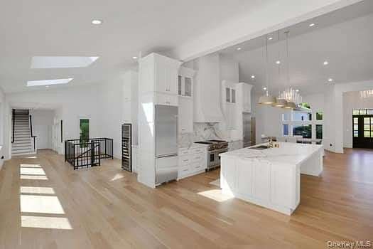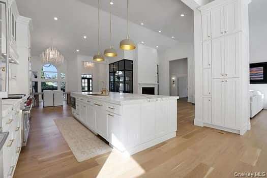 Set in the prestigious Scenic Hills development in the Town of Newburgh, with sought-after Marlboro Schools, this extraordinary 6,200 sq. ft. executive ranch offers a level of design and lifestyle rarely found in today's market. Combining breathtaking scale with single-level living, every inch has been crafted for elegance, comfort, and unforgettable entertaining. Inside, soaring 16-foot ceilings in the main living areas, dramatic skylights, 7 1/4 -inch white oak floors, casement windows, and designer recessed lighting set a striking tone. A glass-enclosed steel-framed office overlooks the living space, blending work and style seamlessly. The chef's kitchen is the centerpiece of the home: a 14-foot island, 48" Wolf stove with dual ovens, six burners, and griddle, double built-in Bosch refrigerators, Honed Calcutta countertops with 2" reveal & matching backsplash, and an impressive 4-foot Ruvati sink with all the bells and whistles and European custom faucets. Completing this dream kitchen are a built-in microwave, wine fridge, coffee bar, and custom cabinetry with wire mesh accents crowned by a 14-foot hood. The expansive great room features a 42" gas fireplace, creating a warm and welcoming setting for gatherings of any size. The primary suite is an oasis of comfort with abundant natural light, freestanding soaking tub, oversized walk-in shower with wet area, dual vanities, soaring ceilings, custom porcelain tile, and a private water closet. 3 additional bedrooms, a dedicated office, and four full bathrooms provide incredible flexibility for family and guests. For convenience and style, the home offers a designer laundry room with cabinetry and sink, a circle driveway with bluestone walkway, and a six-car heated garage with three-phase electric. The garages are thoughtfully placed on opposite sides of the house-one side featuring a four-car tandem design, the other an attached two-car garage for daily ease. The finished walkout lower level is like a home within a home-featuring a full bar, second kitchen, family room, office, full bathroom, game room, and abundant storage. It's the ideal retreat for in-laws, extended family, a private guest suite, or children's recreation. Outdoors, enjoy a gunite pool surrounded by a custom paver patio, a basketball court, lush mature landscaping, and 2.3 acres of privacy for everyday relaxation or grand-scale entertaining. Every upgrade has been considered along with all Anderson windows and doors & a whole-house generator This is more than a home-it's a rare lifestyle property where architectural brilliance meets modern comfort. With all the benefits of expansive single-level living, soaring ceilings, and estate-like grounds, this residence is truly one of a kind in the Hudson Valley market.