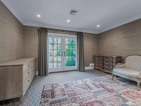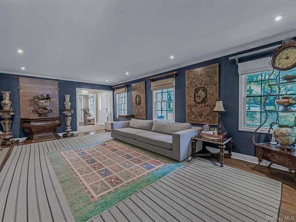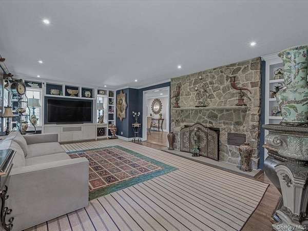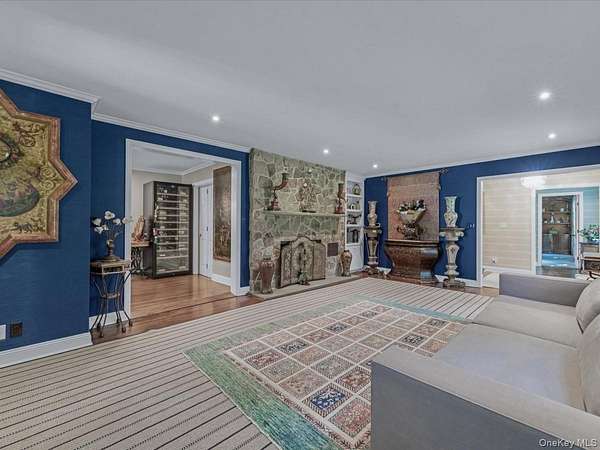 - The main wing features an expansive living room with fireplace, sophisticated millwork, and abundant natural light.