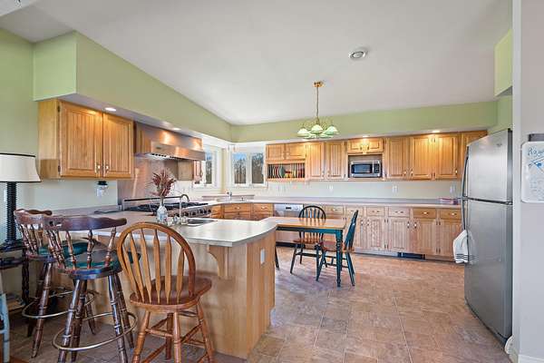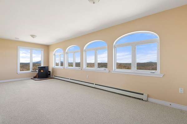 This two story home is perched high on a walkout basement with some of the most beautiful views of the Mount Katahdin range in the region. The basement has 2 garage bays, a large mechanical room and a full bath. Stairs from the basement enter the main level in the heated easterly facing sunroom. The sunroom's expansive glass floods the room with natural light and make for a very calming place to take in the morning sunrise and enjoy the first cup of coffee or tea. The open floor plan on the first floor flows into the livingroom and a large eat in kitchen with bar seating at the peninsula. The kitchen has a propane 48'' stainless steel dual oven stove, stainless steel fridge and a large walkin pantry. The hallway leads to the first floor laundry room, a couple more closets and the mountain side entry door. Two of the bedrooms are at the West end of the hall, both with their own bath, closet and amazing views of the Mount Katahdin range and Rush Pond. The second floor could be a completely seperate living space in itself. There is a spacious area at the top of the stairs with its own little kitchen space. There is a large bedroom with it's own dedicated bath and a walk in closet. All have the added benefit of the spectacular views of the mountains and Rush Pond. The home has multiple heating options and AC heat pumps to ensure year round comfort. There are currently chairlifts on both sets of stairs and will convey with the house. Located close to the snowmobile and ATV trails and only a couple miles off I-95. A beautiful place to call home or to use as a recreational getaway. This is a minimally traveled road with only a few other homes on the road. Remote rugged scenery but convenient access to multiple towns in the area. Here to help with any additional questions you may have. Schedule a visit today.
