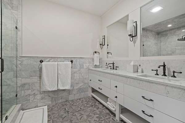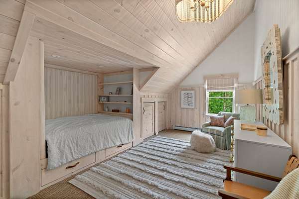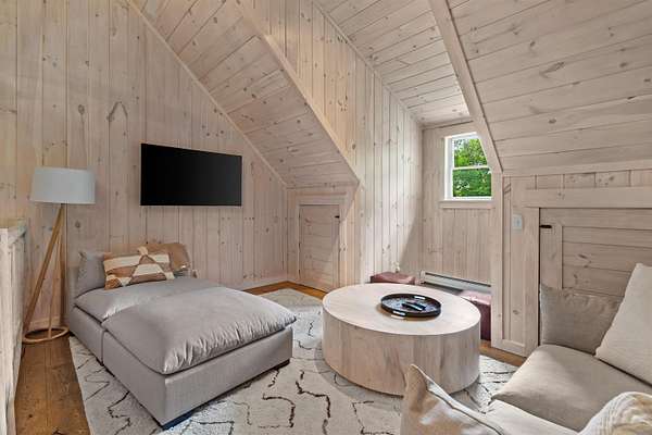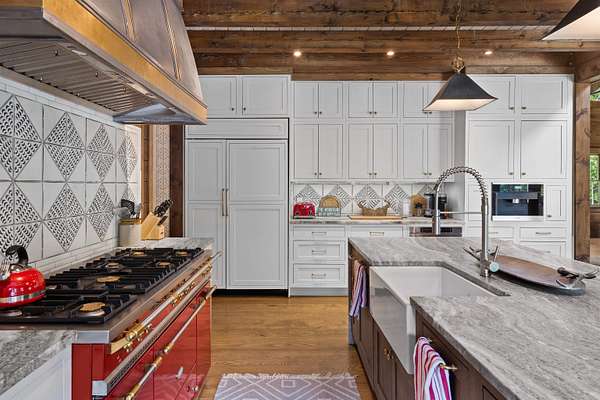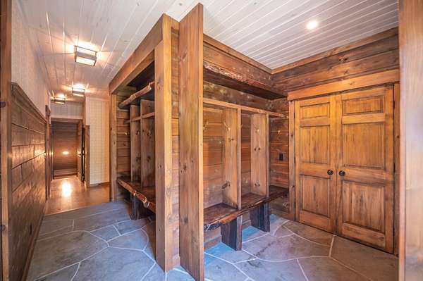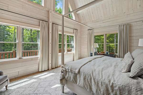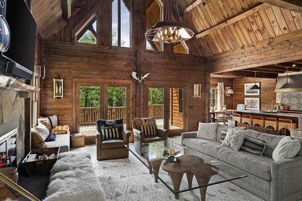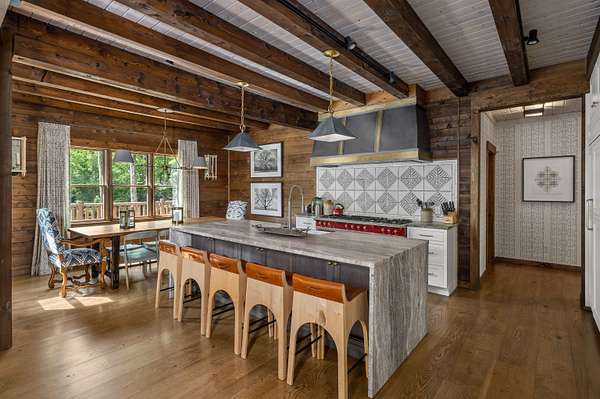 This custom built 2018 log home, designed by RH Log Works and Hilderbrand Interiors, offers the ultimate in sophistication and luxury. Featured in Better Homes and Gardens, New England Home and Country Home magazines, this 5 bedroom, 4.5 bathroom sanctuary (plus extra bunk room) is nestled on 2.2 wooded acres with a river running alongside. Just 4 minutes from Hermitage Club and 10 minutes from Mt Snow. The 5,110 square feet of meticulously designed living space seamlessly blends modern elegance with timeless log cabin charm including a kitchen with Lacanche Citeaux range, tile backsplash, and custom steel-and-brass hood, great room with stunning stone fireplace, guest bath, primary suite with vaulted ceilings, custom bath with double vanity and walk-in shower, additional first floor guest room, with en suite bath, second floor with two bedrooms and a full bath, with additional loft space, lower level family room with 9 foot ceilings, game room, wet bar, bunk room and bath, and bonus bunk space, as well as laundry room. The exterior includes custom masonry, back stone patio, hot tub, front and rear porches, and extensive custom lighting. Throughout the home, custom cabinetry, premium finishes, and impeccable craftsmanship are evident, ensuring an unparalleled level of luxury. Whether you are looking to entertain, unwind after a day on the slopes, or simply enjoy the beauty of mountain living, this exceptional residence provides it all. Being offered furnished and turn key.