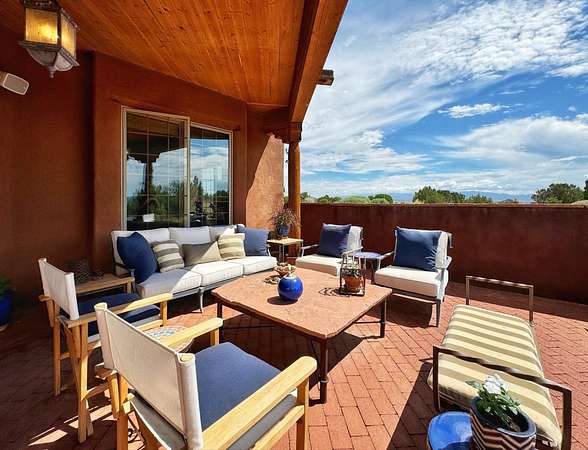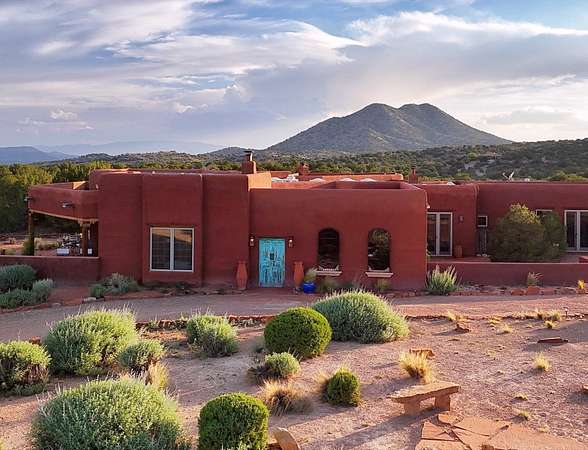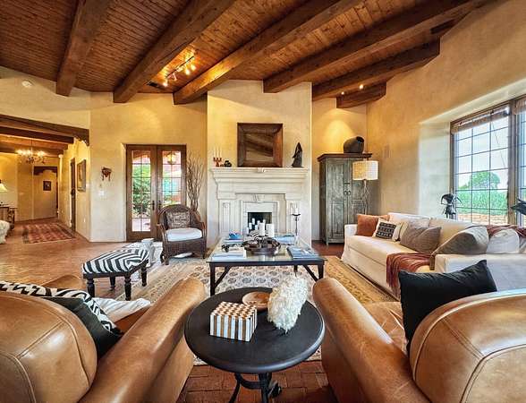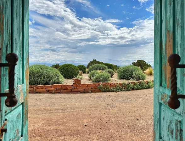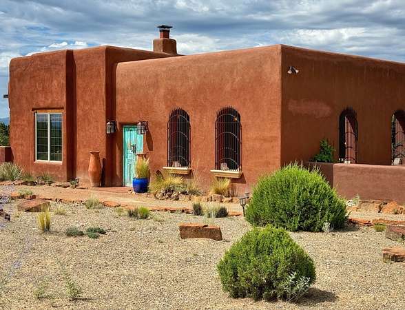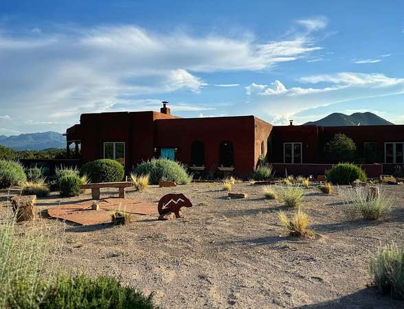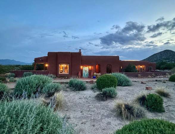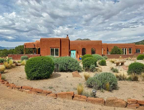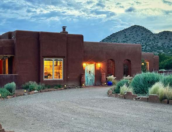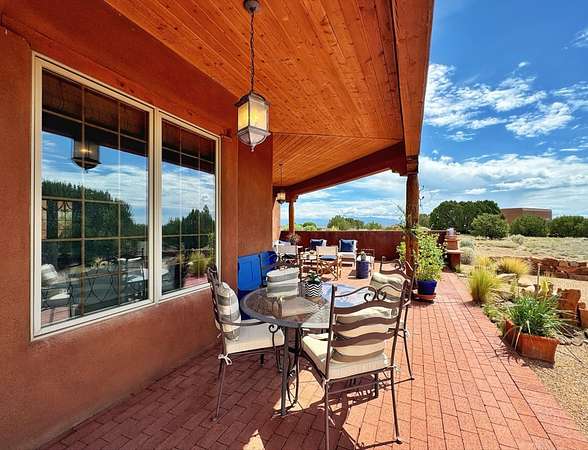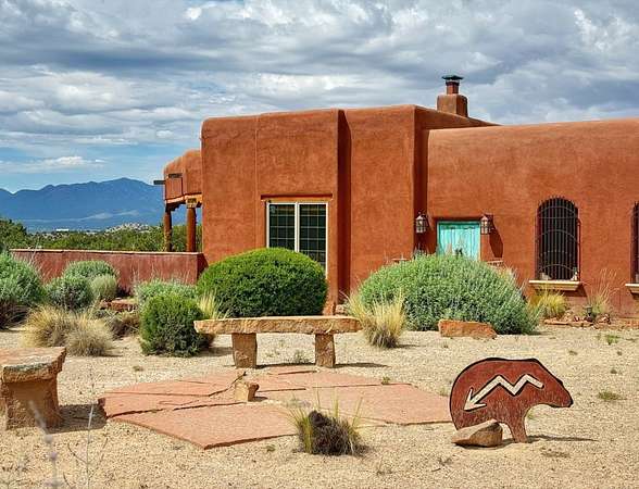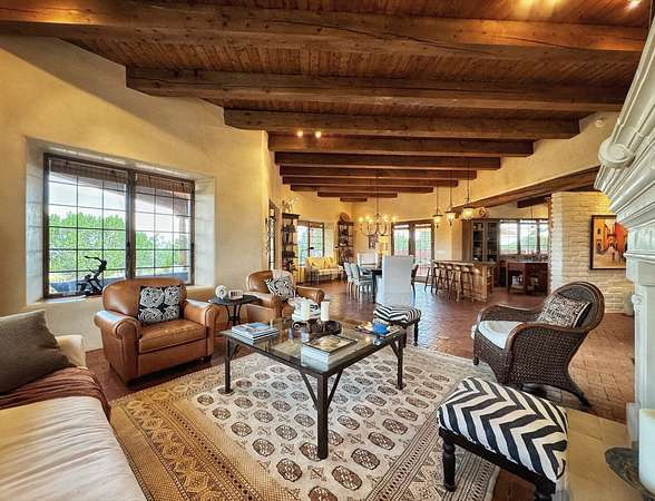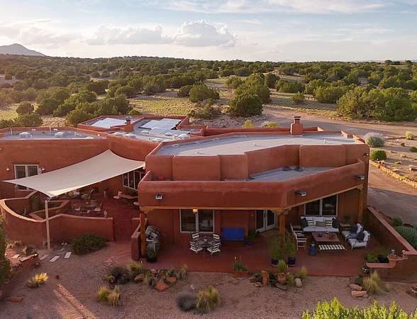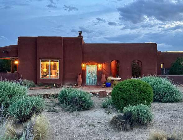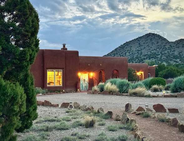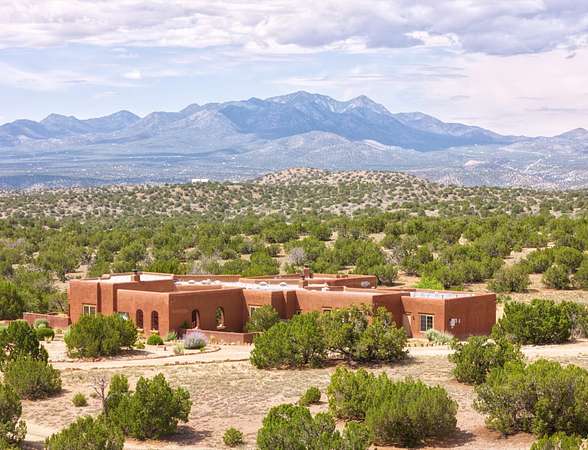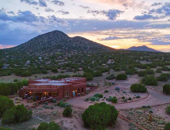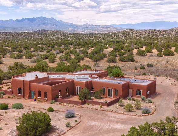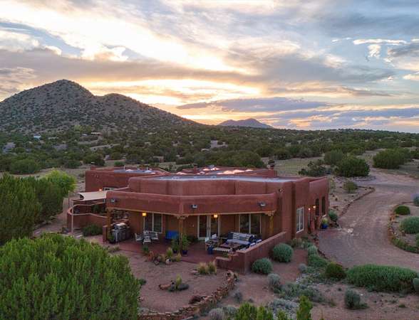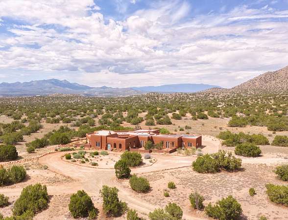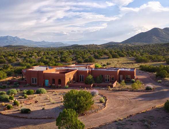 Luxurious single-level custom-built home in Silver Hills Ranch, just 20 mins from Santa Fe & 50 mins from Albuquerque International Sunport. Set on 14.37 acres adjacent to BLM and county open space, the property offers ample room to build equestrian facilities and accommodates up to 7 horses. The 3,360 sq ft main home-recently re-stuccoed-is paired with an 820 sq ft adobe casita-both enjoying 360 degrees panoramic views of the Galisteo Basin, Cerrillos Hills, Sangre de Cristo, Sandia & Ortiz Mountains. The main home features 3 bedrooms, office/library, & 3 bathrooms (2 full, 1- 3/4), and welcomes you through a spacious courtyard with antique mesquite doors. Inside, the foyer features an exposed brick accent wall that adds character and warmth. The great room boasts soaring ceilings with wood beams & tongue-and-groove planks. A chef's kitchen offers Viking Pro appliances, alder cabinetry, honed granite & slate countertops, dual islands, custom hood, & two sinks (granite farm & copper). The primary suite includes a spacious walk-in closet and a luxurious full bathroom with dual marble sinks. Additional features include a library/flex room, media room, & 3 wood-burning fireplaces w/gas starters. Elegant finishes include herringbone brick & fossilized stone floors, hand-troweled plaster walls & Pella Architect Series windows. Seven sets of elegant 8-foot Pella French doors open effortlessly to five serene patios and courtyards, providing expansive outdoor living spaces perfect for entertaining, relaxing, and enjoying breathtaking panoramic views. Modern comforts: central A/C, in-floor radiant & forced-air heating, built-in fridge & whole-home stereo. Eco-friendly features include 24 solar panels, 500-gal propane tank, & 3 rainwater-harvesting cisterns. The casita offers stylish modern finishes & a 3/4 bath-ideal for guests. Located in a desirable neighborhood w/low HOA fees & sensible CC&Rs. A rare blend of luxury, functionality & sustainability in an unmatched natural setting.