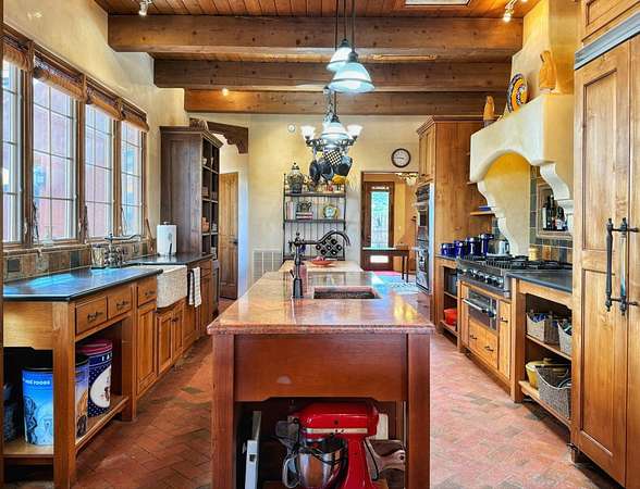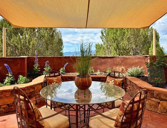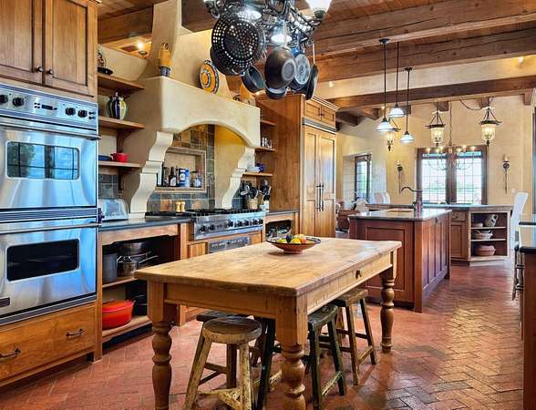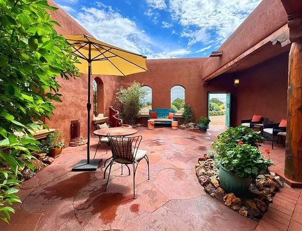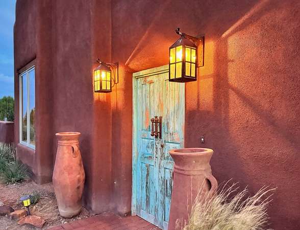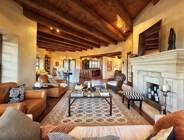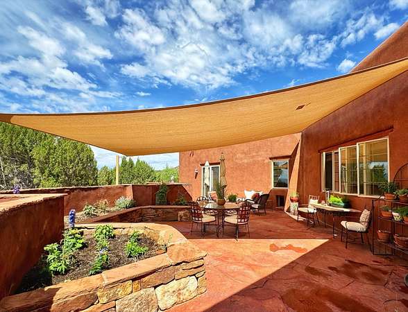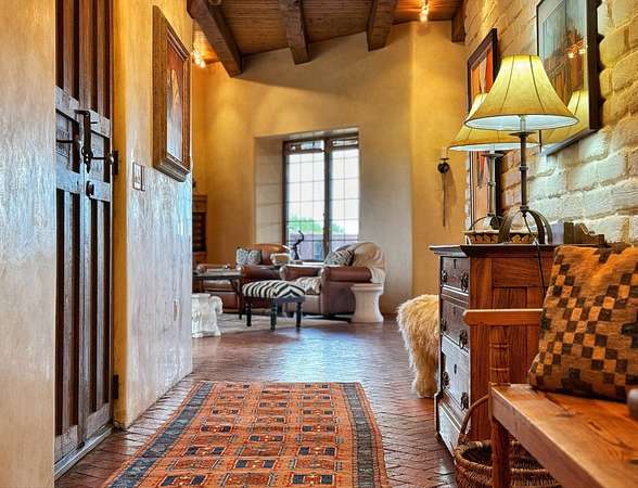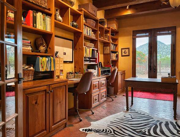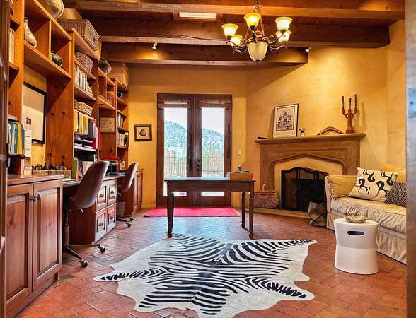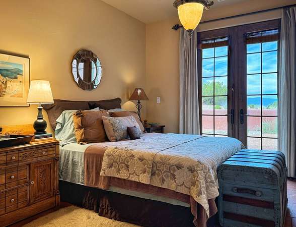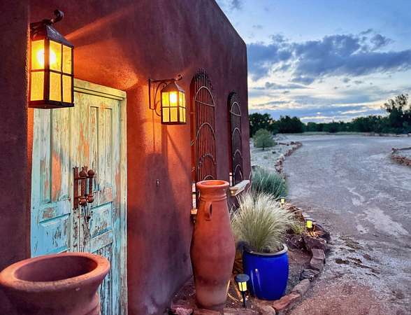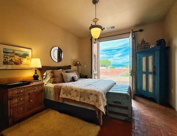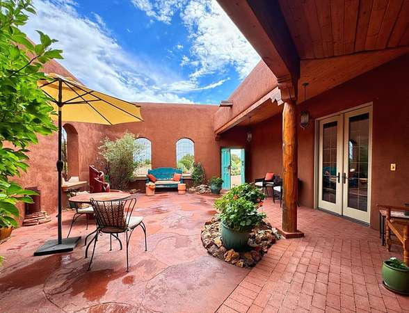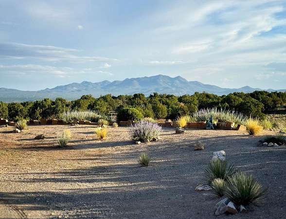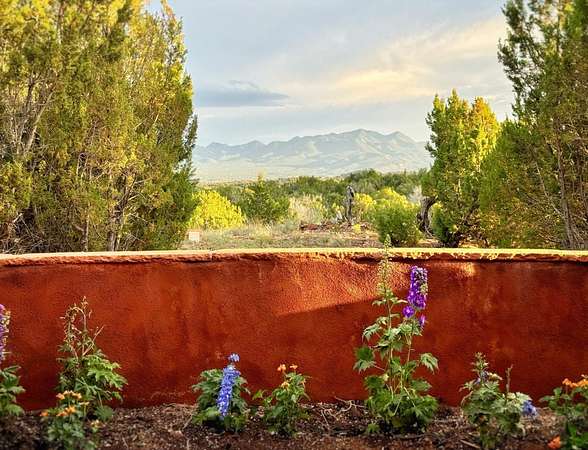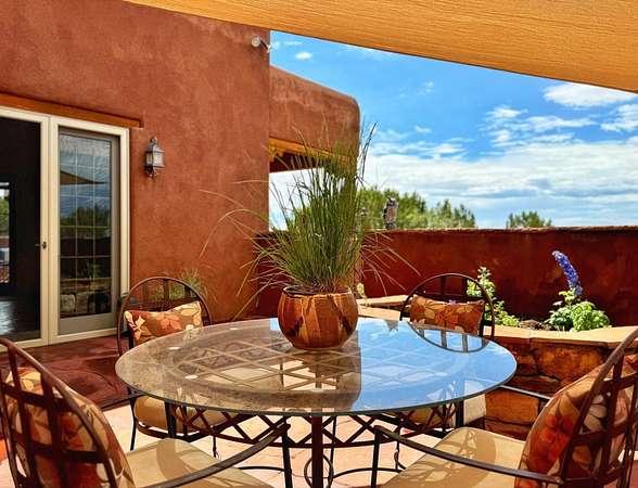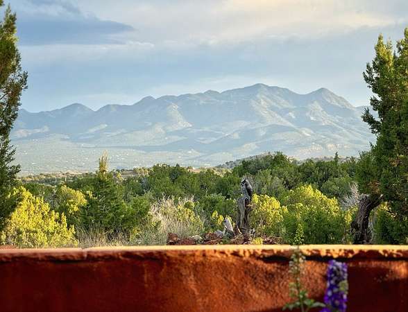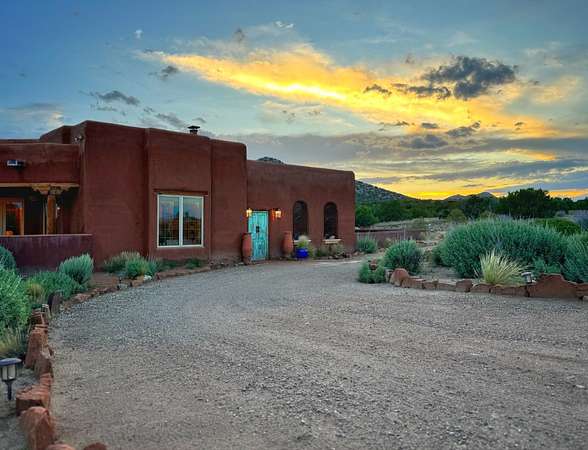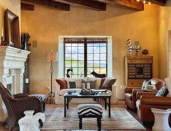 Luxurious single-level custom-built home in Silver Hills Ranch, just 20 mins from Santa Fe & 50 mins from Albuquerque International Sunport. Set on 14.37 acres adjacent to BLM and county open space, the property offers ample room to build equestrian facilities and accommodates up to 7 horses. The 3,360 sq ft main home-recently re-stuccoed-is paired with an 820 sq ft adobe casita-both enjoying 360 degrees panoramic views of the Galisteo Basin, Cerrillos Hills, Sangre de Cristo, Sandia & Ortiz Mountains. The main home features 3 bedrooms, office/library, & 3 bathrooms (2 full, 1- 3/4), and welcomes you through a spacious courtyard with antique mesquite doors. Inside, the foyer features an exposed brick accent wall that adds character and warmth. The great room boasts soaring ceilings with wood beams & tongue-and-groove planks. A chef's kitchen offers Viking Pro appliances, alder cabinetry, honed granite & slate countertops, dual islands, custom hood, & two sinks (granite farm & copper). The primary suite includes a spacious walk-in closet and a luxurious full bathroom with dual marble sinks. Additional features include a library/flex room, media room, & 3 wood-burning fireplaces w/gas starters. Elegant finishes include herringbone brick & fossilized stone floors, hand-troweled plaster walls & Pella Architect Series windows. Seven sets of elegant 8-foot Pella French doors open effortlessly to five serene patios and courtyards, providing expansive outdoor living spaces perfect for entertaining, relaxing, and enjoying breathtaking panoramic views. Modern comforts: central A/C, in-floor radiant & forced-air heating, built-in fridge & whole-home stereo. Eco-friendly features include 24 solar panels, 500-gal propane tank, & 3 rainwater-harvesting cisterns. The casita offers stylish modern finishes & a 3/4 bath-ideal for guests. Located in a desirable neighborhood w/low HOA fees & sensible CC&Rs. A rare blend of luxury, functionality & sustainability in an unmatched natural setting.
