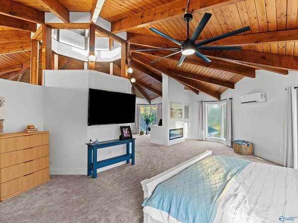 This exceptional Lake Guntersville estate offers three spacious bedrooms and two baths, all featuring oversized layouts, highlighted by an exquisite master suite complete with a private fireplace. A second fireplace anchors the living room, adding warmth and elegance to the home's inviting living spaces. Situated on over an acre in a quiet neighborhood, the property provides abundant privacy and serene surroundings, with stunning lake views perfect for watching beautiful sunsets. The estate includes a separate, guest house with two bedrooms and one bath, ideal for visitors or extended family, along with a four-car garage and a private boathouse for effortless lake living