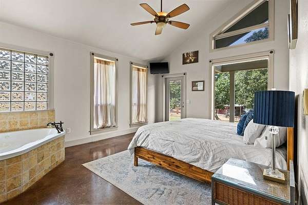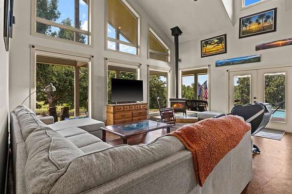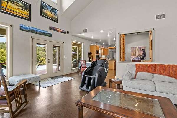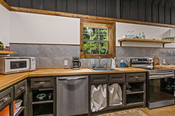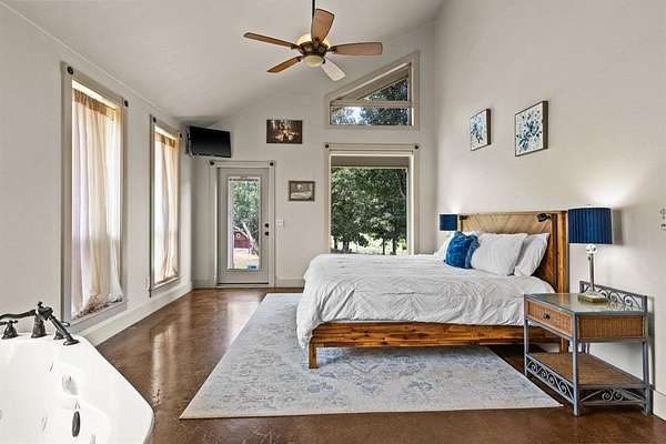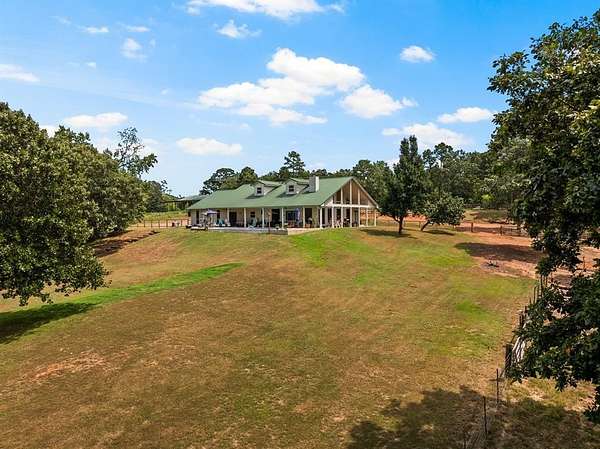 Turn-key income-producing Airbnb retreat featuring two homes and exceptional amenities on 24.46 private acres. The custom 4BD, 4BA main home offers 20 ft ceilings, floor to ceiling windows, open living with wood burning stove, and a chef’s kitchen with granite countertops and gas cooktop island. The primary suite includes a jetted tub, oversized shower, and custom closet.