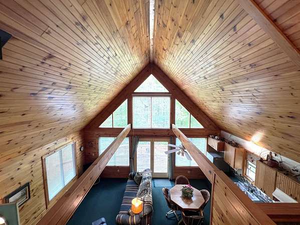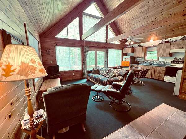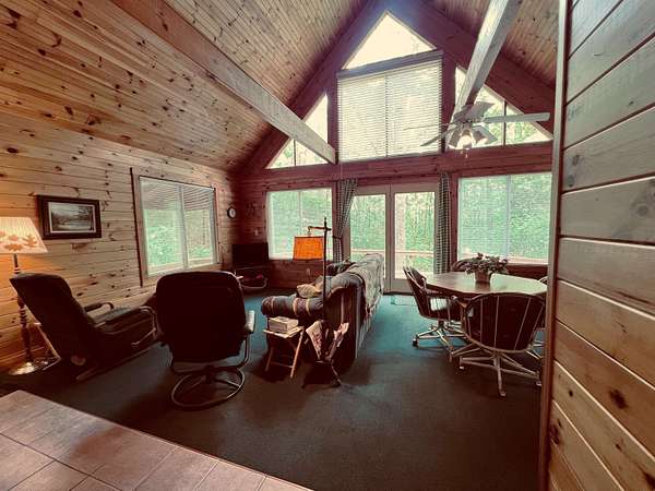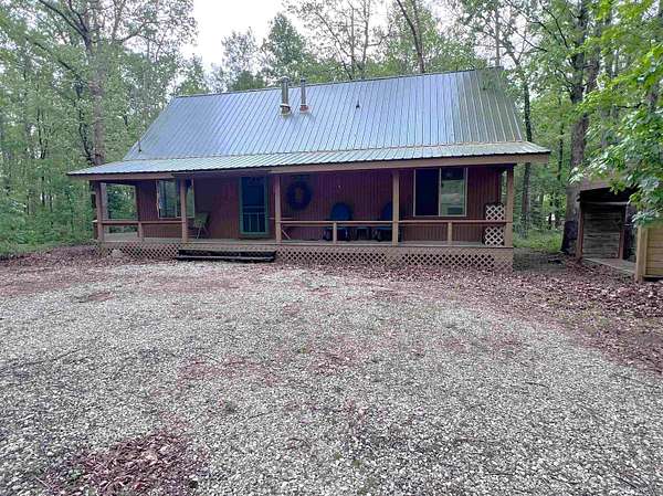 Tucked just outside of Mountain View, this cabin sits on 3.04 wooded acres, offering privacy while still being minutes from the Square, local dining, and music. Inside features 2 bedrooms, 2 baths, plus a spacious loft overlooking the main living area—ideal for additional sleeping, a home office, or cozy retreat. Vaulted wood ceilings and a wall of windows bring in natural light and frame the surrounding trees, creating that true cabin feel. The open living, kitchen, and dining area flows easily for gathering, complete with a wood-burning stove for added warmth and charm. Step outside to the covered porch along the front and left side—perfect for morning coffee or relaxing evenings in a peaceful setting. A detached 2-car garage/shop adds functionality, while the acreage offers room to explore. Great as a full-time home, weekend getaway, or investment opportunity in the Ozarks.