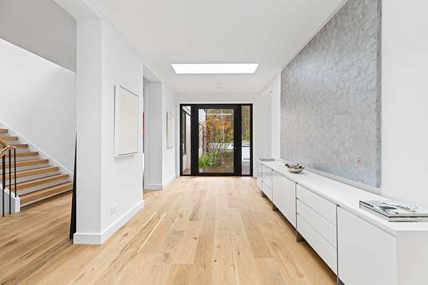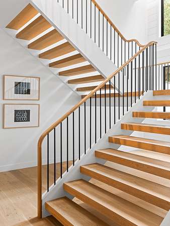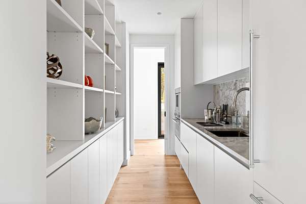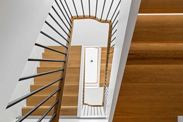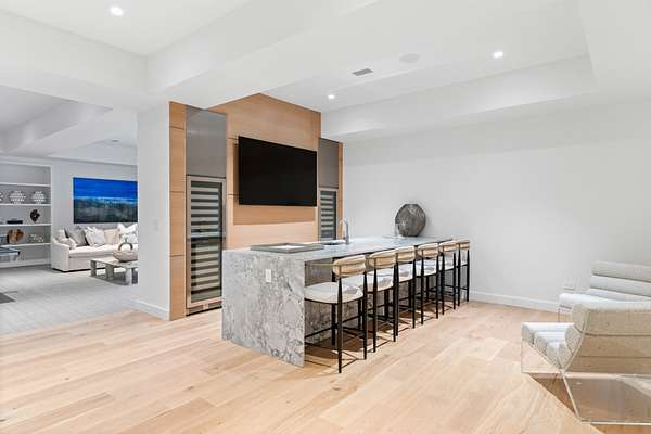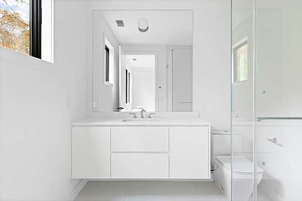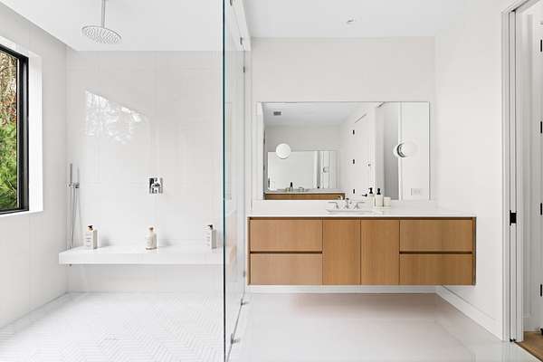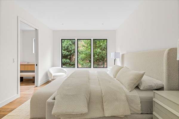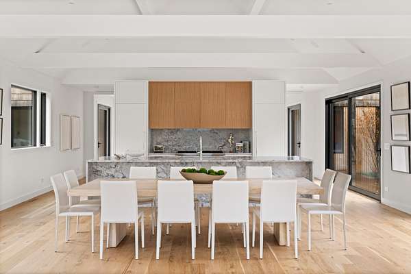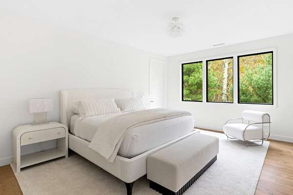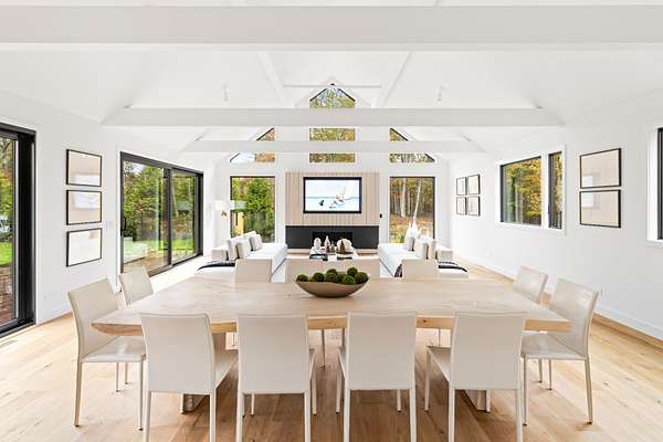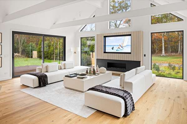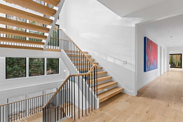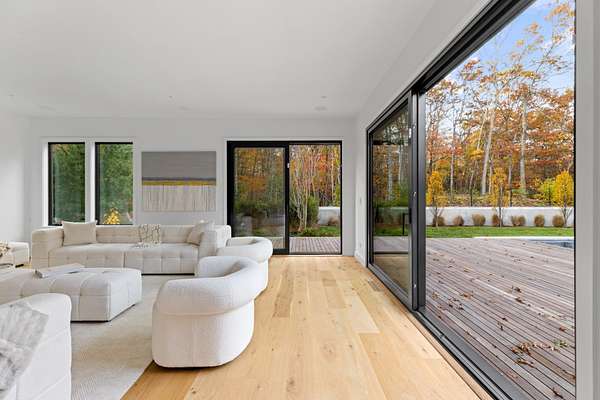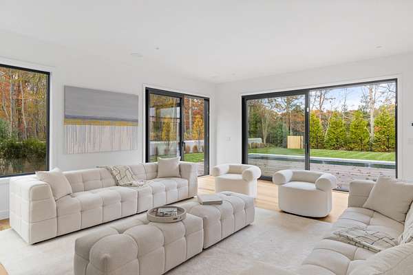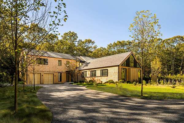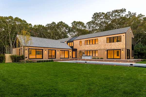 Paying homage to Amagansett's agrarian heritage, Twin Barns, meticulously built by ModBarns in collaboration with Nathan Lynch Design, comprises an 8 bedroom, 8.5 bath shingled modern farmstead style home adorned with exceptional outdoor spaces including a heated, salt water, 50-foot gunite pool with spa and sundeck, surrounded by mahogany decking and an outdoor kitchen, and set on a thoughtfully landscaped 2.08 acres in Amagansett's Bell Estate, mere minutes from ocean beaches and Amagansett Square. Clad in custom milled 24-inch Alaskan yellow cedar 'Royal' shingles that weather silver with age and accented with impeccable vertical cedar slats, standing seam metal, and black aluminum finishes, stunning details inside and out characterize this modern interpretation of a twin-gabled barn. The perpendicular wings of the home allow for abundant natural light from ample fenestration which frame gorgeous landscape vignettes ranging from specimen European hornbeams, crepe myrtles, and limelight hydrangeas to creeping red fescue meadows to the original pine, oak, and American holly trees ringing the property, all curated by The Timeless Gardener. An oversized glass pivot door opens on the entry foyer, awash with light from frameless skylights above, which highlights the lovely texture of the European-style 8-inch white oak floors used throughout. The airy great room with vaulted 18-foot ceilings and exposed pinned-rafters houses the gourmet, eat-in kitchen with island seating, dining area, living room with linear gas-burning fireplace, and an exceptionally well-appointed prep kitchen. The elevated kitchen has custom frameless and handleless cabinetry by Mark Frappied Design, Superwhite Quartzite countertops with a waterfall island, and top of the line appliances by Thermador. With effortless indoor-outdoor flow, Reynaers Masterpatio lift & slide doors lead to the pool area with cool to the touch, sandblasted Turkish Blue Luxe marble and mahogany decking with concealed fasteners and integrated LED lights. A second living room or attached pool cabana overlooks the rear grounds, pool and grill area, accompanied by a venetian plaster gas fireplace. The first-floor primary suite has a luxurious bath with California Faucets' knurled-plating-details, custom cabinetry with routed handles, concealed vents, solid surface freestanding bath tub, and curbless shower with integrated tile-drains. An en suite guest bedroom, powder bath with Roman clay limewash finish and integrated stone sink, mudroom, laundry, and heated two-car attached garage equipped with EV charging complete the main level. The show stopping open-riser staircase with sculptural white oak handrail and cast iron balusters, is framed by a contiguous 40-foot wall of glass and skylights. The upstairs contains four en-suite bedrooms, including a primary suite, and a laundry room with dual LG laundry towers. The extravagant primary suite offers a cathedral ceiling clad in 10-inch shiplap, Venetian plaster fireplace, dual custom closets, and an impressive bath with a recessed outdoor shower balcony, solid surface freestanding bath tub, heated shower floors, heated bench, and radiant heated floors. The expansive and bright finished lower level, complete with engineered European white oak flooring and wall paneling, features a theatre, gym, sauna, wine bar, recreation room, and two en suite bedrooms. The theatre is fully sound proofed with tiered seating, Dolby Atmos Sound, Epson 4K projector, 130-inch invisible frame screen, Klipsch audio with Kevlar drivers, and a Lutron automated shade. The wine bar features two Summit Wine Towers with 4 zones of climate control and a 320-bottle capacity, XO Clear Diamond ice maker, Bosch dishwasher, and ample seating. This is a rare opportunity to own a compelling, modern new construction defined by bespoke design and flawless execution, just minutes from the beaches, farm stands, and timeless charm of Amagansett.