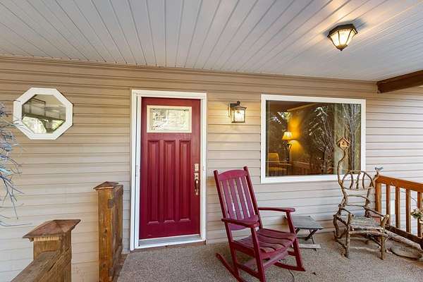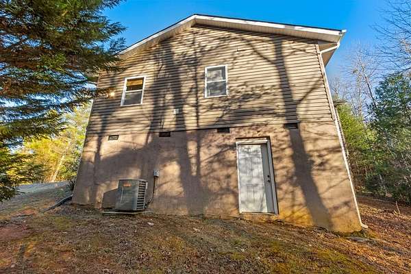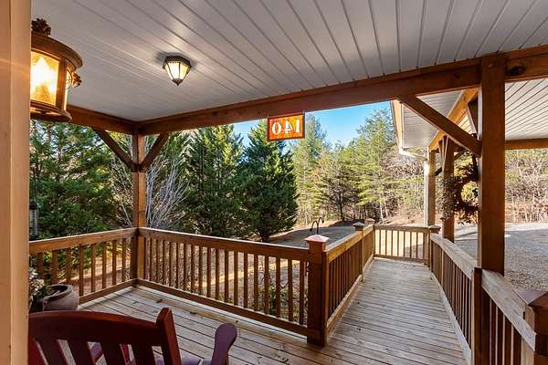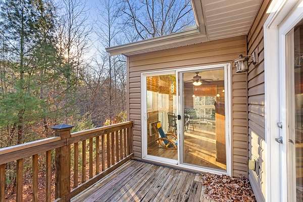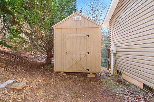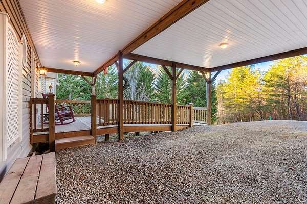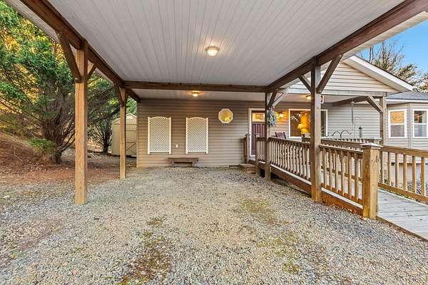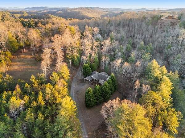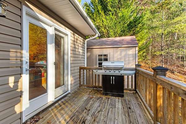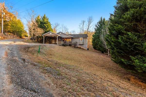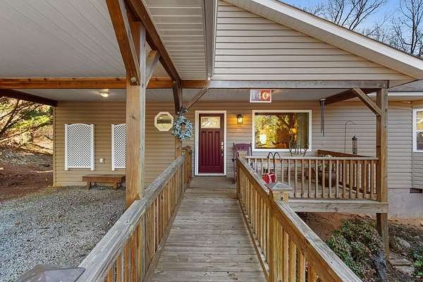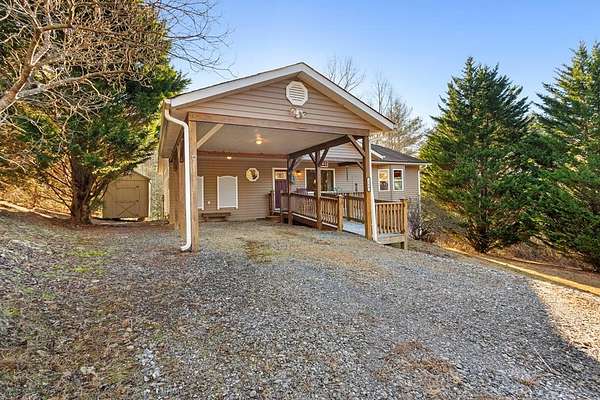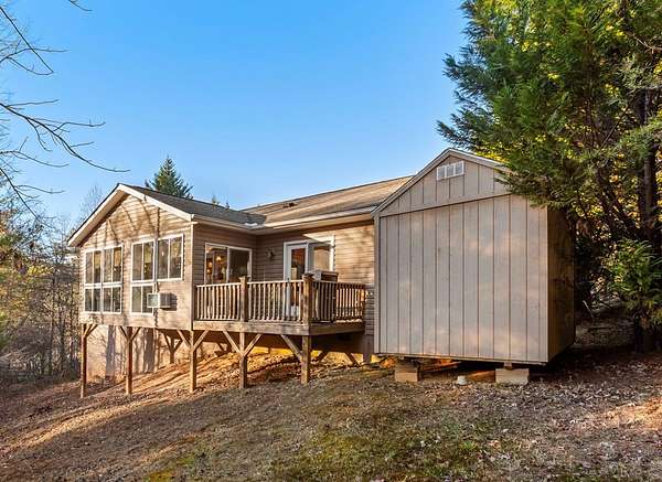 Nestled on 2 lots making 2.70 +/- private, wooded acres, this inviting single-level home offers comfort, space, and thoughtful design in a peaceful natural setting. A short gravel driveway leads directly to the attached single carport, complete with a convenient ramp that guides you to the welcoming front porch. Inside, the Great Room serves as the heart of the home, featuring warm wood floors, a vaulted wood ceiling, and a striking corner stacked-stone gas log fireplace that creates a cozy yet open atmosphere. The adjacent kitchen is well appointed with abundant cabinetry, granite counter space, a center island, matching stainless steel appliances, a pantry, and a breakfast area. Two sets of glass doors flood the kitchen with light and open into a bright, spacious sunroom, which in turn provides access to the deck. The split-bedroom layout ensures privacy. The Master Suite is tucked away on one side of the Great Room and has a vaulted ceiling, a large walk-in closet, glass doors to the deck, and an en suite bathroom with a jetted tub and separate step-in shower. On the opposite side of the home, a hallway leads to the guest bedroom with laundry connections and a built-in ironing board, and the guest bathroom. Also located on this hall is a generous bonus room with French doors, a bay window, and built-in bookshelves, providing endless opportunities for use. A large crawlspace underneath the house and an outbuilding provide ample storage and additional utility, completing this versatile and serene property. A scenic drive from downtown Murphy, and close to Lake Hiwassee, this sweet home is waiting for you!