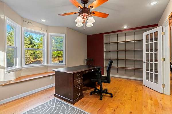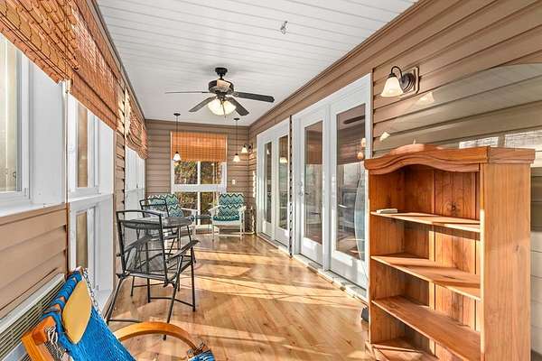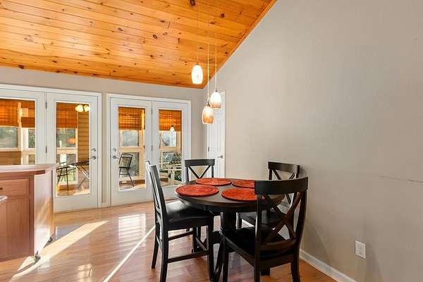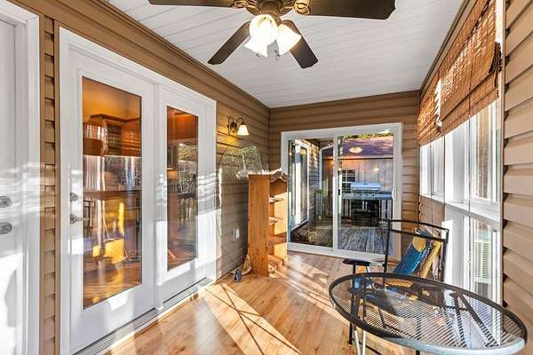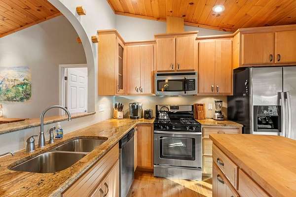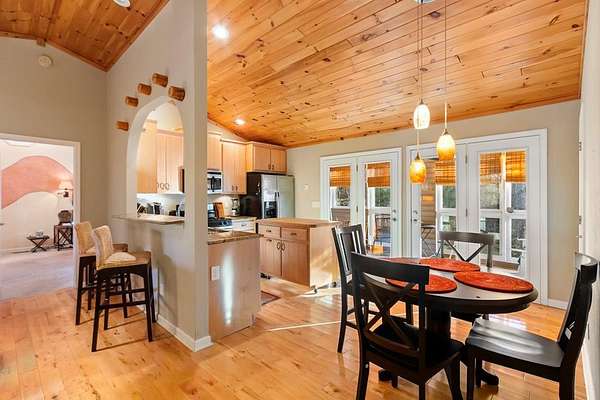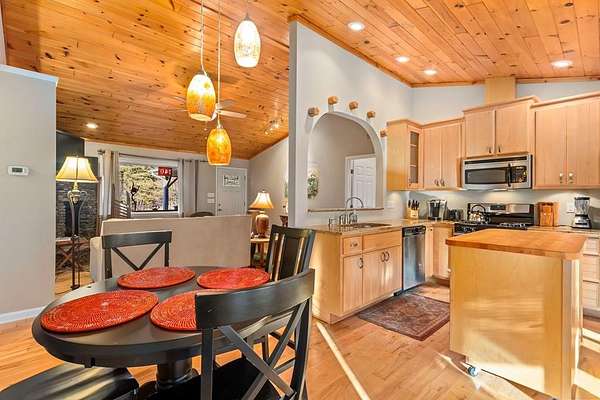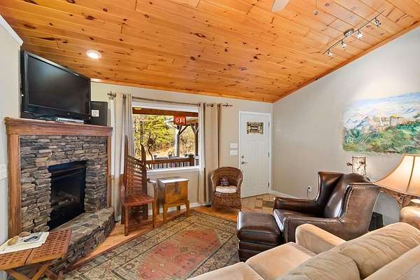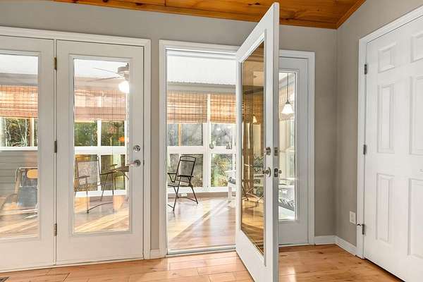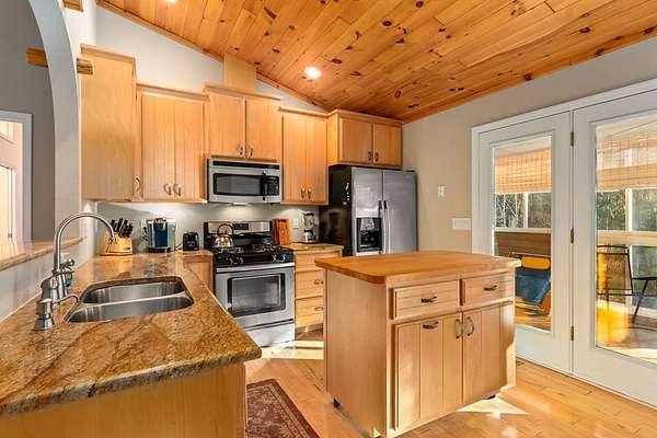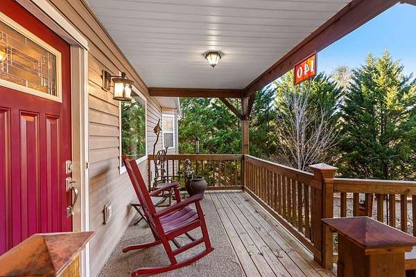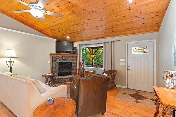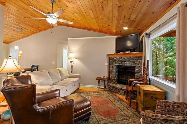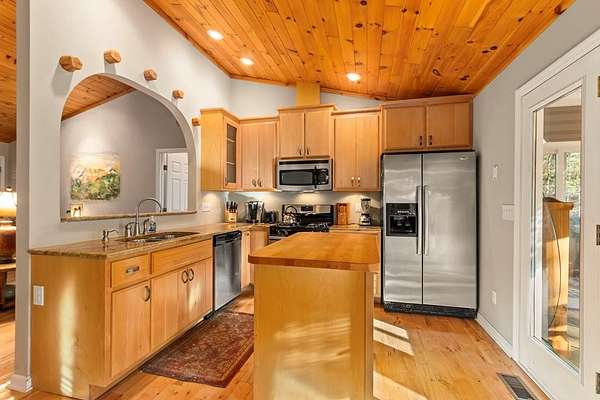 Nestled on 2 lots making 2.70 +/- private, wooded acres, this inviting single-level home offers comfort, space, and thoughtful design in a peaceful natural setting. A short gravel driveway leads directly to the attached single carport, complete with a convenient ramp that guides you to the welcoming front porch. Inside, the Great Room serves as the heart of the home, featuring warm wood floors, a vaulted wood ceiling, and a striking corner stacked-stone gas log fireplace that creates a cozy yet open atmosphere. The adjacent kitchen is well appointed with abundant cabinetry, granite counter space, a center island, matching stainless steel appliances, a pantry, and a breakfast area. Two sets of glass doors flood the kitchen with light and open into a bright, spacious sunroom, which in turn provides access to the deck. The split-bedroom layout ensures privacy. The Master Suite is tucked away on one side of the Great Room and has a vaulted ceiling, a large walk-in closet, glass doors to the deck, and an en suite bathroom with a jetted tub and separate step-in shower. On the opposite side of the home, a hallway leads to the guest bedroom with laundry connections and a built-in ironing board, and the guest bathroom. Also located on this hall is a generous bonus room with French doors, a bay window, and built-in bookshelves, providing endless opportunities for use. A large crawlspace underneath the house and an outbuilding provide ample storage and additional utility, completing this versatile and serene property. A scenic drive from downtown Murphy, and close to Lake Hiwassee, this sweet home is waiting for you!