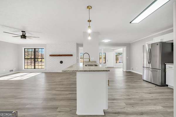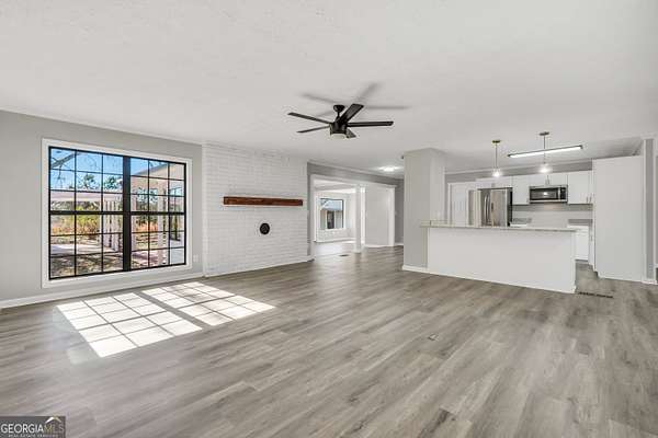 Welcome to this beautifully renovated 4-bedroom, 3-full-bath home set on a spacious, private lot with mature trees and a long driveway offering plenty of parking. The charming exterior and detached garage/workshop add both curb appeal and functionality, perfect for storage, hobbies, or extra vehicles. Inside, you'll find a bright, open-concept layout featuring wide-plank flooring, neutral designer tones, and modern lighting throughout. The fully updated kitchen is the heart of the home, showcasing white shaker cabinetry, granite countertops, stainless steel appliances, and a large center island ideal for entertaining. The kitchen flows seamlessly into expansive living areas, including a cozy living room with a painted brick fireplace and abundant natural light. A sun-filled bonus room with large windows provides the perfect space for a second living area, home office, or relaxing retreat. The spacious primary suite offers a spa-like bathroom complete with dual vanities, ample storage, a soaking tub, and a separate walk-in shower. Additional bedrooms are generously sized, with three full bathrooms thoughtfully designed for comfort and convenience.Move-in ready and thoughtfully updated, this home offers modern living with timeless charm in a peaceful setting-an exceptional opportunity you won't want to miss.