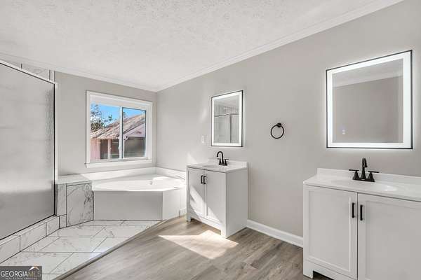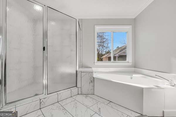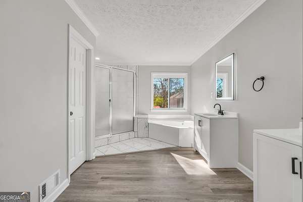 - Double Vanity, High Ceilings, In-Law Floorplan, Master On Main Level, Roommate Plan, Separate Shower, Soaking Tub, Split Bedroom Plan, Tile Bath, Vaulted Ceiling(s), Walk-In Closet(s)
