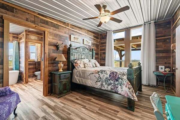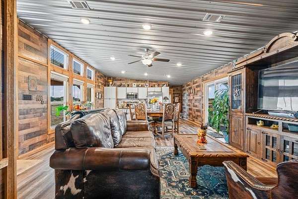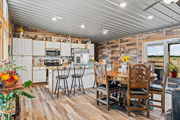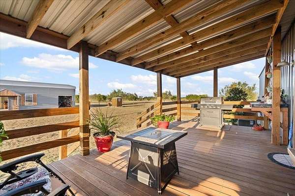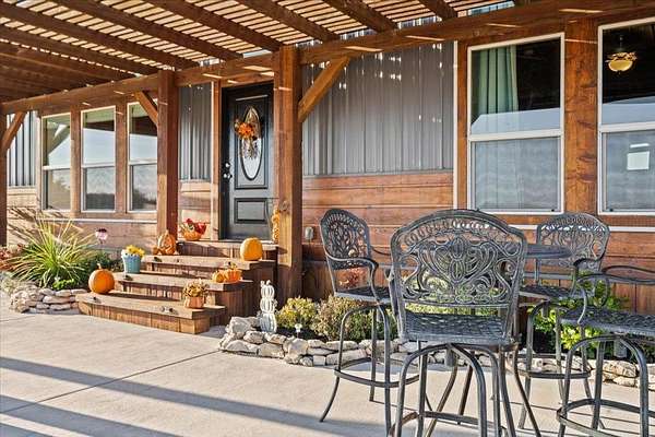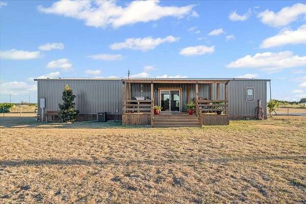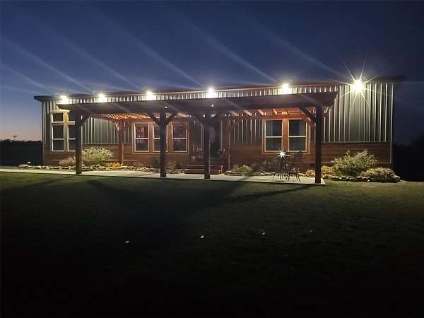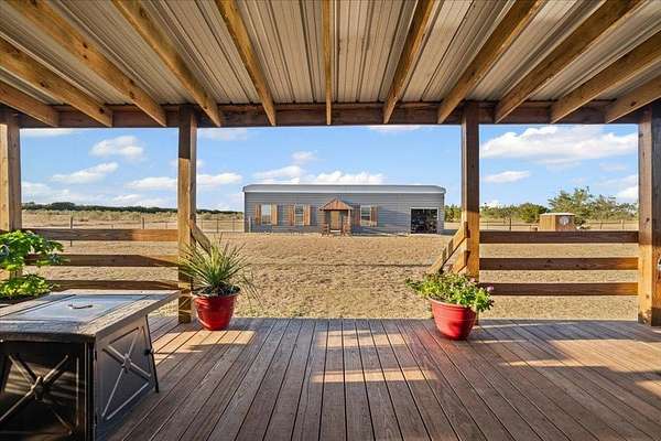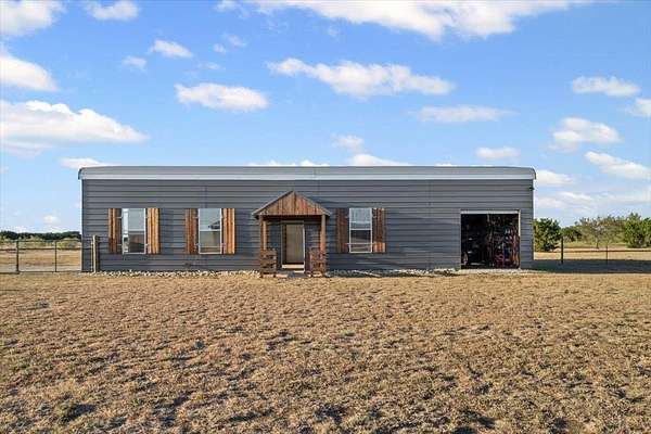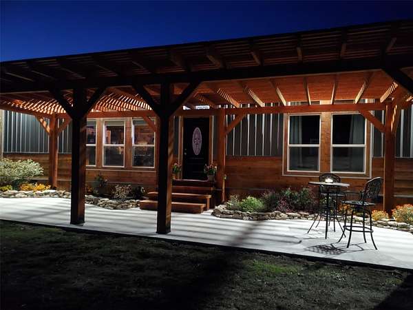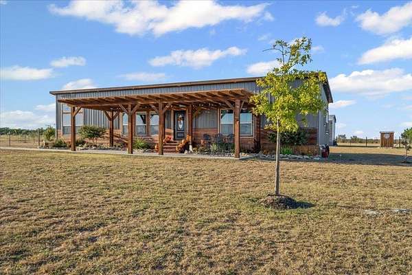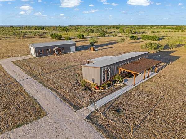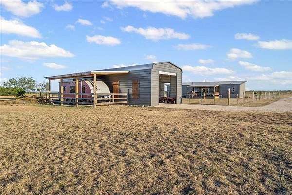 Imagine waking up to the peaceful sounds of nature, surrounded by breathtaking views, cattle, and rolling hills on this AG-exempt property. This stunning 2-bedroom, 2-bathroom home sits on over 5 acres of picturesque land with a half acre fenced in yard around the house, offering a serene retreat from the hustle and bustle of city life. The interior boasts an open-concept kitchen, dining, and living area perfect for entertaining. A large center island/breakfast bar, stainless steel appliances, abundant cabinetry, and recessed lighting complete the kitchen. The primary suite is a relaxing oasis, featuring a lovely front yard view and an en-suite bathroom with a soaking tub, separate tile shower, and dual vanities. With 1,188 square feet of living space, this home offers a perfect blend of rustic elegance and modern comfort. The property itself is a nature lover's paradise, with several trees, including Oaks, Cherry, Dogwood, and Magnolia, creating a stunning landscape. A 40' x 17' cedar pergola marks the front entrance, while the covered 12' x 24' back deck with outdoor lighting is perfect for unwinding and taking in the views. Additional features include a 20' x 30' RV cover behind the massive 20' x 60' x 16' detached garage. The property attracts abundant wildlife, and is minutes from the charming town of Lampasas, with its shops and restaurants. You'll also be within a short drive of Austin and Fort Hood. Designed for efficiency and durability, the home features dual-pane windows and is well-insulated, making it a comfortable retreat year-round. This charming mini barndo welcomes all creatures great and small - bring your horses, goats, chickens, and furry friends to enjoy the peace and quiet of the countryside. Surrounded by nature's beauty, abundant wildlife, and breathtaking starry skies, this haven offers the ultimate retreat.