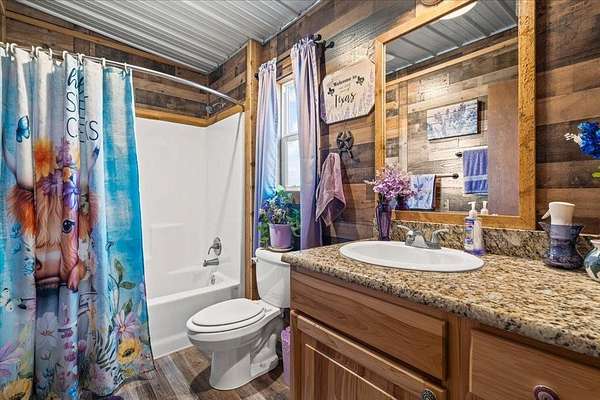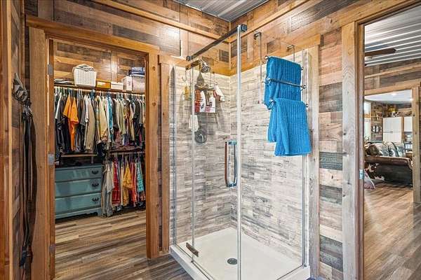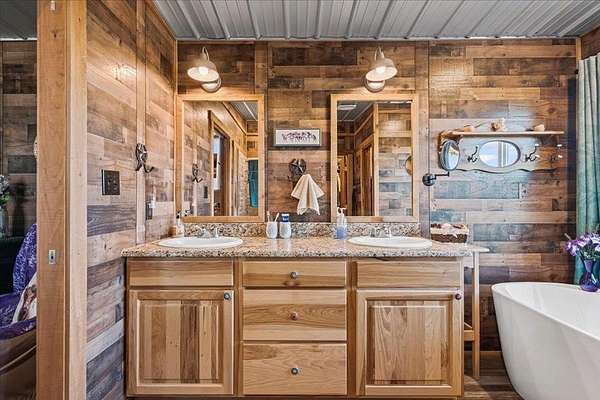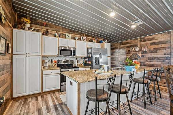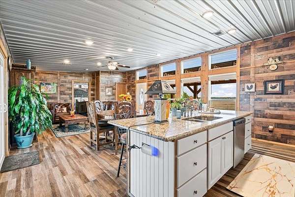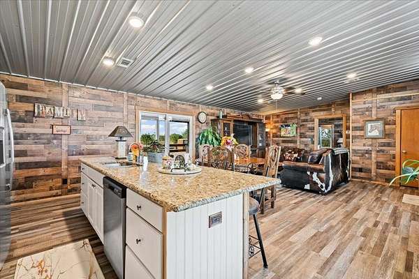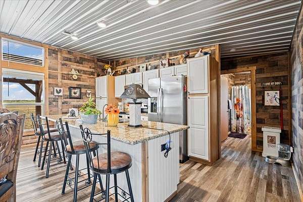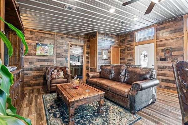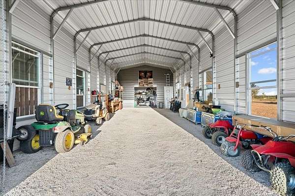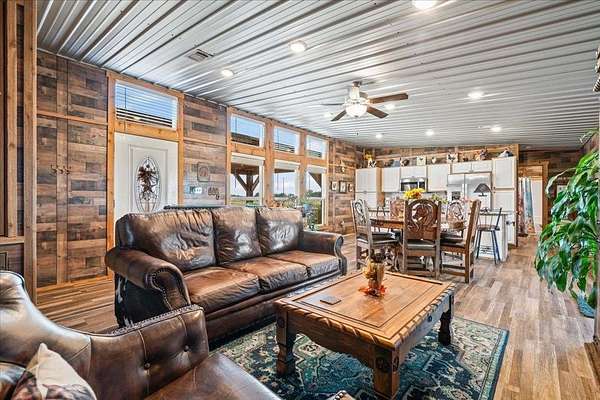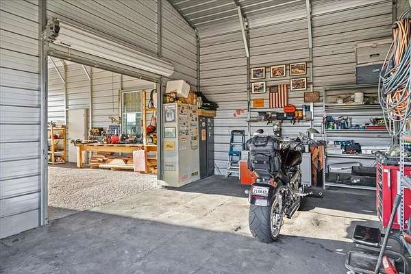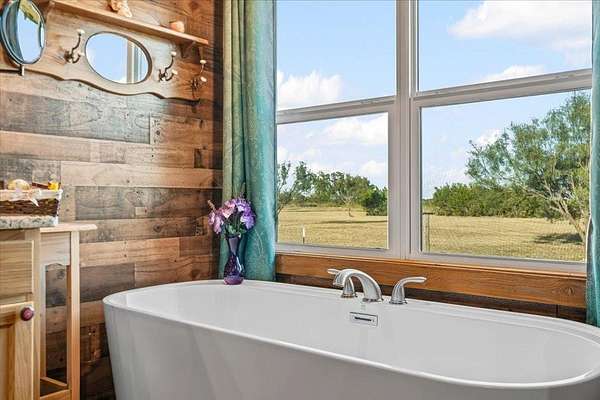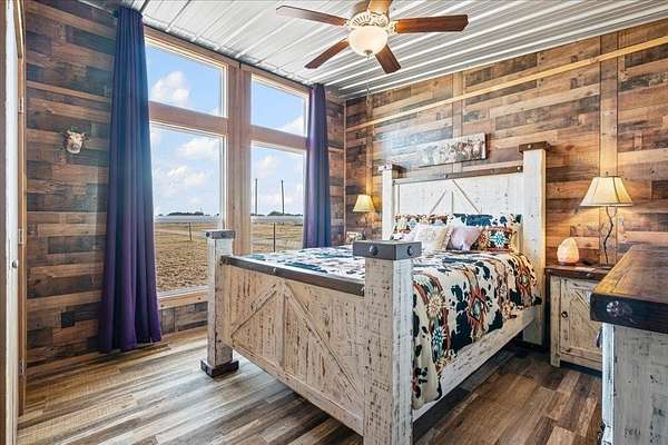 Imagine waking up to the peaceful sounds of nature, surrounded by breathtaking views, cattle, and rolling hills on this AG-exempt property. This stunning 2-bedroom, 2-bathroom home sits on over 5 acres of picturesque land with a half acre fenced in yard around the house, offering a serene retreat from the hustle and bustle of city life. The interior boasts an open-concept kitchen, dining, and living area perfect for entertaining. A large center island/breakfast bar, stainless steel appliances, abundant cabinetry, and recessed lighting complete the kitchen. The primary suite is a relaxing oasis, featuring a lovely front yard view and an en-suite bathroom with a soaking tub, separate tile shower, and dual vanities. With 1,188 square feet of living space, this home offers a perfect blend of rustic elegance and modern comfort. The property itself is a nature lover's paradise, with several trees, including Oaks, Cherry, Dogwood, and Magnolia, creating a stunning landscape. A 40' x 17' cedar pergola marks the front entrance, while the covered 12' x 24' back deck with outdoor lighting is perfect for unwinding and taking in the views. Additional features include a 20' x 30' RV cover behind the massive 20' x 60' x 16' detached garage. The property attracts abundant wildlife, and is minutes from the charming town of Lampasas, with its shops and restaurants. You'll also be within a short drive of Austin and Fort Hood. Designed for efficiency and durability, the home features dual-pane windows and is well-insulated, making it a comfortable retreat year-round. This charming mini barndo welcomes all creatures great and small - bring your horses, goats, chickens, and furry friends to enjoy the peace and quiet of the countryside. Surrounded by nature's beauty, abundant wildlife, and breathtaking starry skies, this haven offers the ultimate retreat.