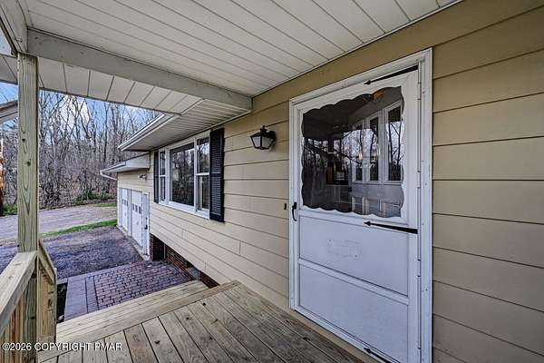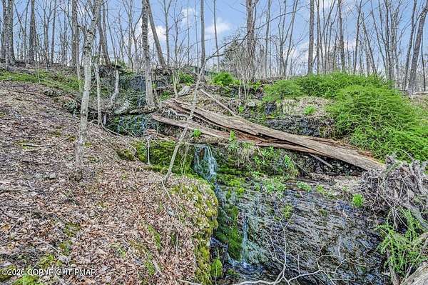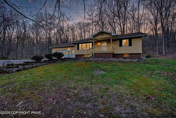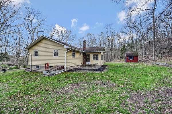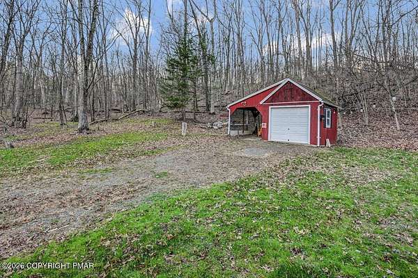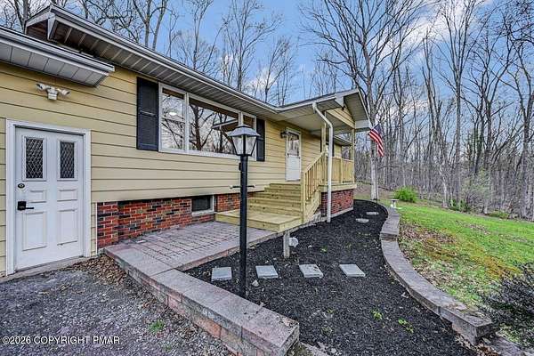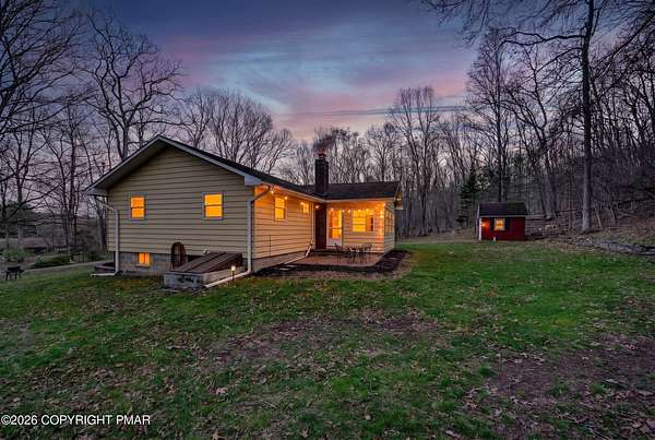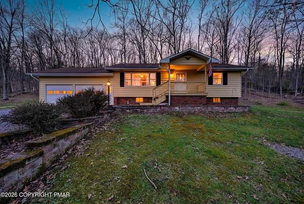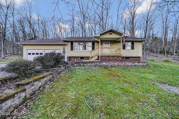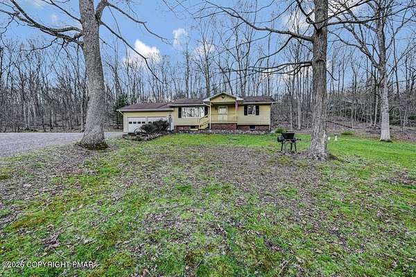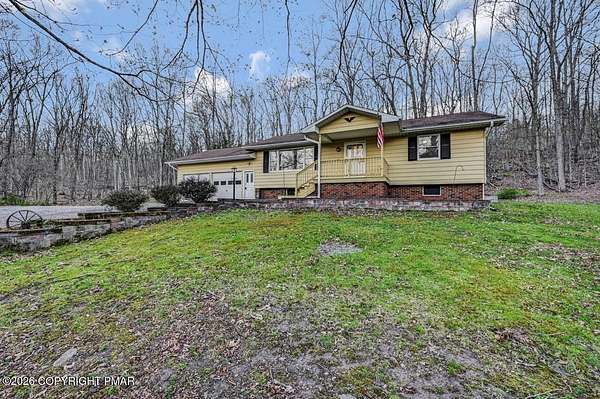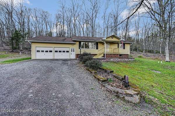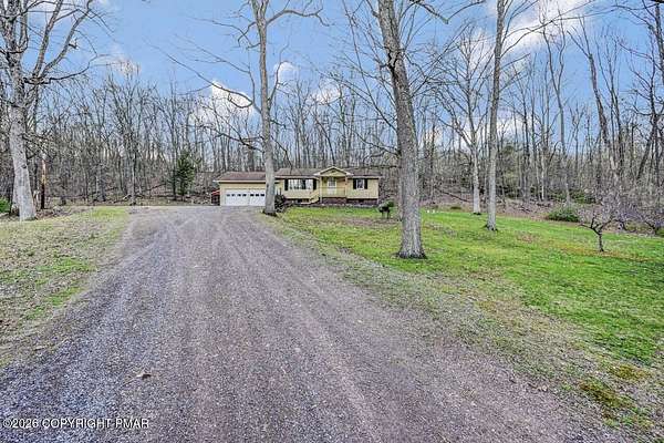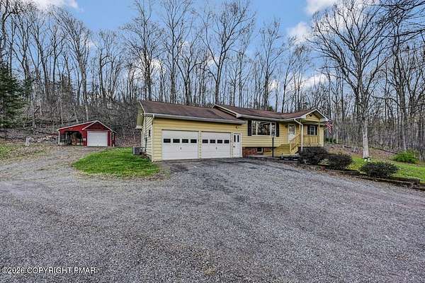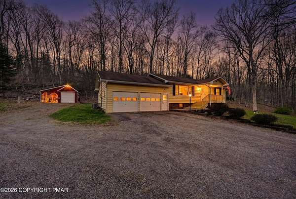 Rare Opportunity To Own 4.75 Acres Of Stunning Waterfront Property In The Poconos, Complete With A Picturesque Waterfall And Flowing Creek Running Alongside The Land! This Charming Ranch Home Offers Two Bedrooms And One Full Bath On The Main Level, Along With A Spacious Living Room And An Eat In Kitchen Dining Area Combination That Opens To A Bright Three Season Room And Paver Patio, Perfect For Relaxing And Entertaining While Enjoying The Scenic Setting. Additional Features Include An Attached Two Car Garage Plus A Detached One Car Garage With Lean To For Extra Storage Or Equipment. The Partially Finished Basement Offers Tremendous Potential With A Workshop Style Full Bath, Wood Stove, Laundry Hookup, And Plenty Of Room For Hobbies Or Future Expansion. Main Floor Stackable Laundry Hookup Is Also Available, Along With Convenient Attic Storage. A Truly Rare Find Offering Acreage, Water Features, Garages, And Endless Possibilities In A Beautiful Pocono Setting!