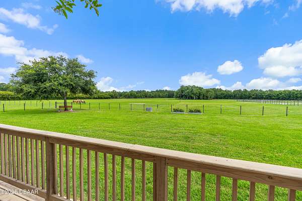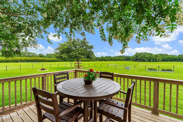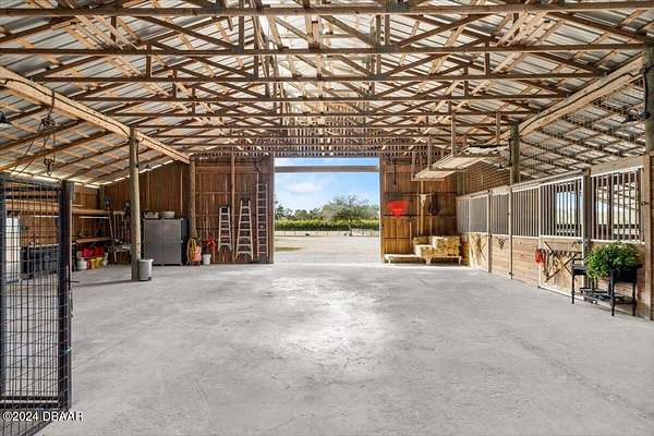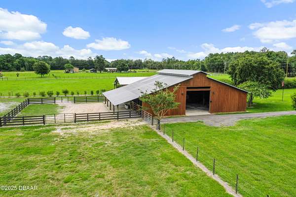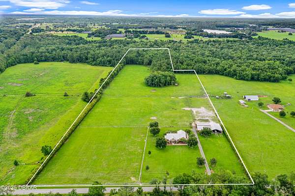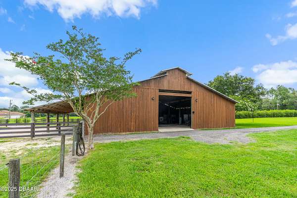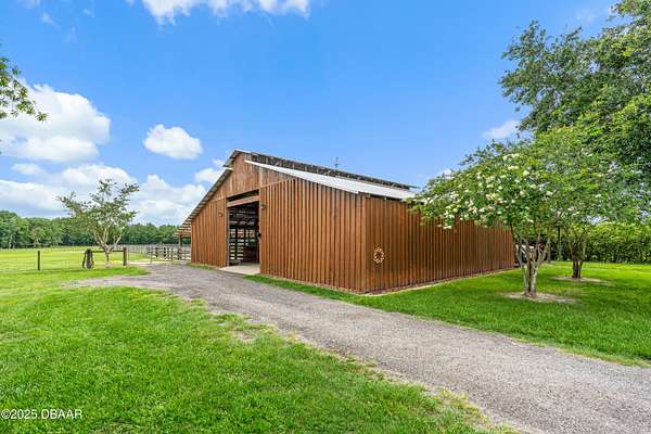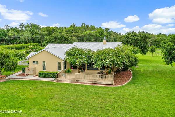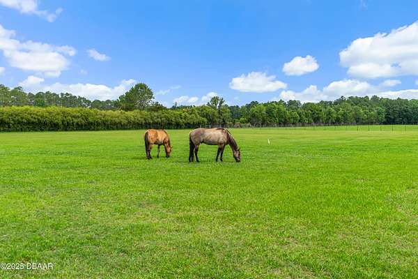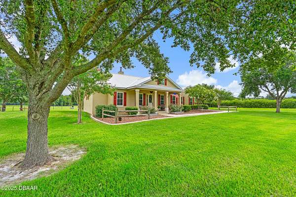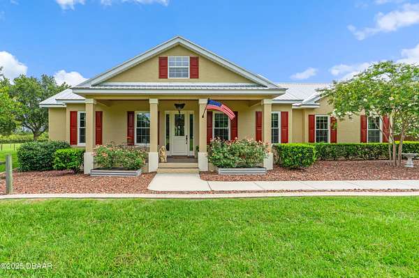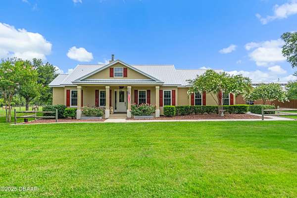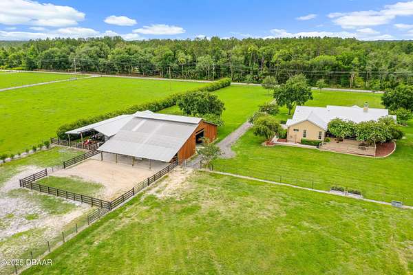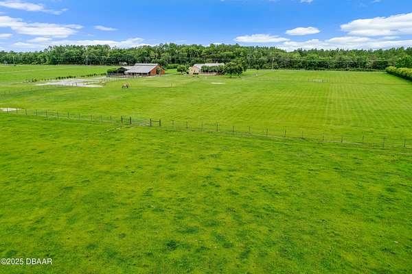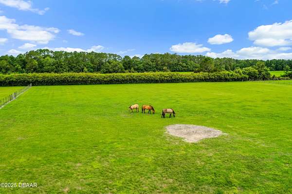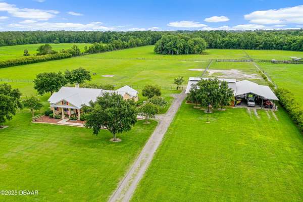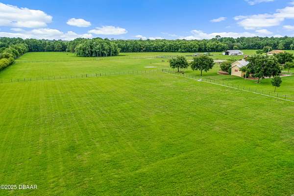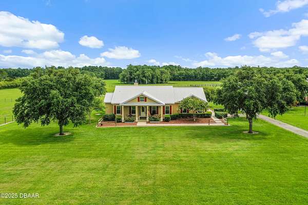 Welcome to 140 Little Brown Church Road-an equestrian's dream property tucked behind a solar-powered gate in the heart of Pierson, FL. This meticulously maintained 25-acre farm is designed for both the horse enthusiast and those seeking a peaceful rural lifestyle, just 10 minutes to town conveniences and 45 minutes to the beach. The land is fully fenced and cross-fenced with five pastures, each offering water access via seven underground hookups. A water wheel irrigation system keeps both yard and grazing areas green. The 48*72 metal wrapped, concrete-floored barn is a standout feature, complete with three horse stalls, tack room, workshop, water, and electric. Two pole barns (12*60 and 24*60) offer additional covered space for equipment or shaded turnout. Just minutes from Deep Creek Stables and Lake George State Forest, riders will enjoy access to thousands of acres of trails for pleasure riding, training, and community events. The area is well-known for its strong equestrian culture, including local barrel racing clubs and horse-friendly trailheads throughout Volusia County. The ranch-style home is equally impressive with a one-owner, move-in ready residence adorned with a 2018 metal roof, new (2023) Low-E windows, and a full suite of upgrades. Inside, enjoy 10-ft ceilings, engineered wood floors, a wood-burning fireplace with stone surround, and abundant natural light through French doors leading to a screened-in patio with tongue-and-groove pine ceiling. From there, step onto a 25x25 deck overlooking your pastures which are ideal for sunset dinners or morning coffee. The eat-in kitchen features granite counters, solid maple cabinetry, and all new appliances (2024). A spacious dining area makes entertaining a breeze. The primary suite boasts a luxurious walk-in shower, dual sinks, and a large walk-in closet. All bedrooms include walk-ins, and the oversized laundry room offers a sink, coat closet, and pantry. Additional highlights: pest tube system, whole house vacuum, whole house generator, surround sound wiring, and a new water softener and filtration system (2024). The garage includes a hurricane-rated door and sliding screen doors. Plus, you'll find cable in every room and access to fiber-optic internet, a rural luxury with high-speed connectivity. This property is truly a rare find for equestrian buyers and is beautifully maintained, perfectly located, and ready for both you and your horses. Bring your boots, bring your dreams. Square footage received from tax rolls. All information recorded in the MLS intended to be accurate but cannot be guaranteed.