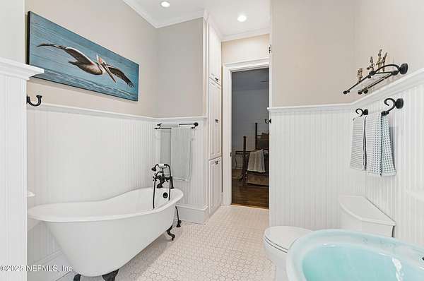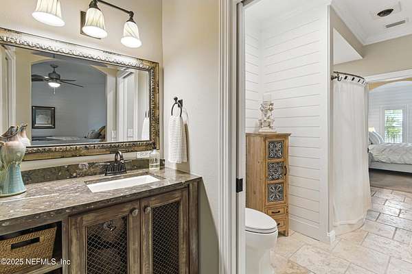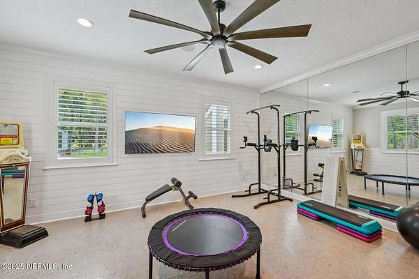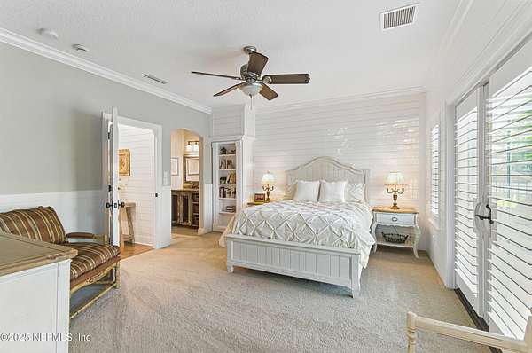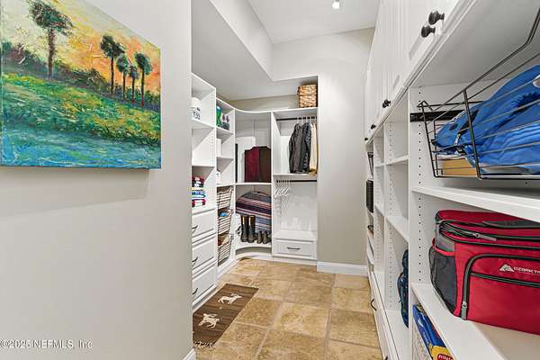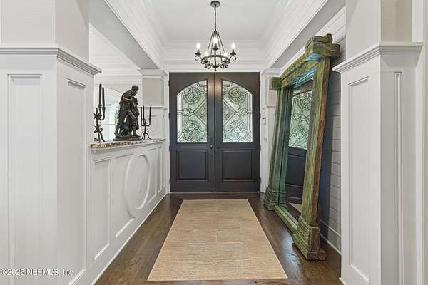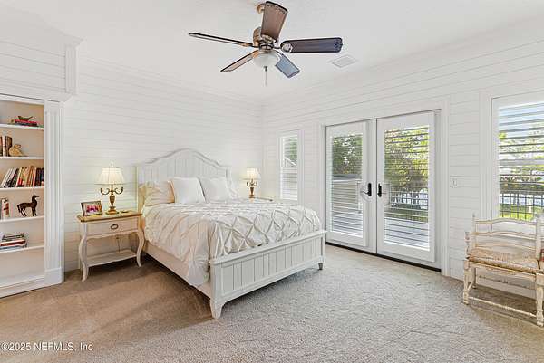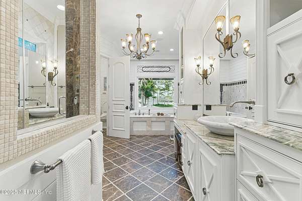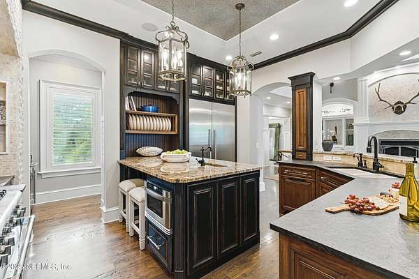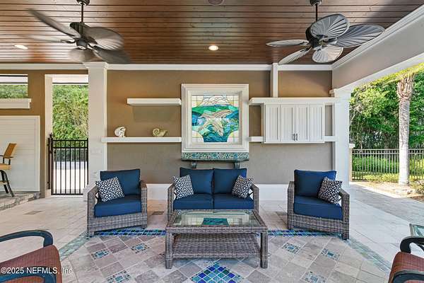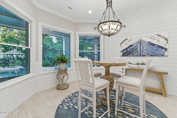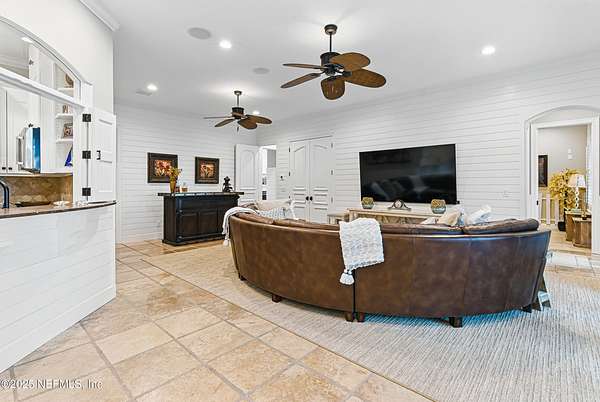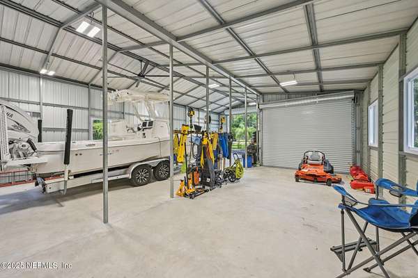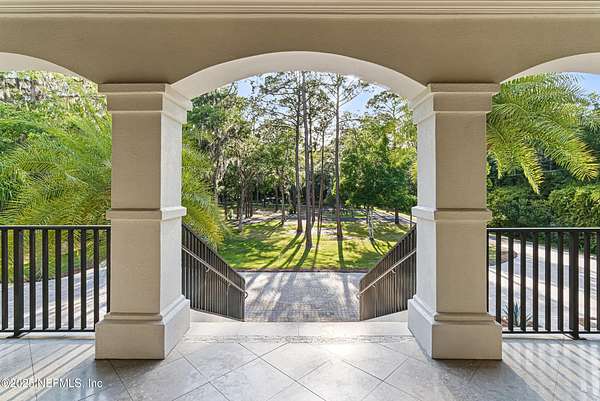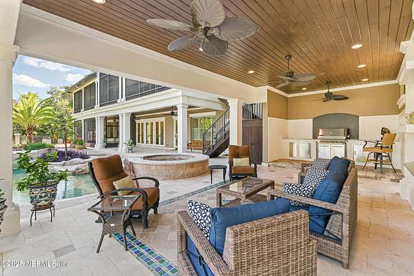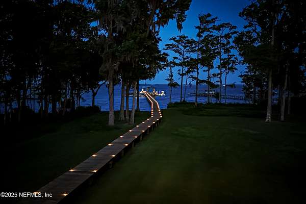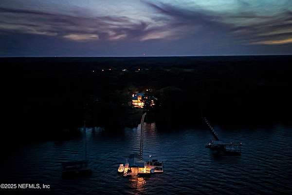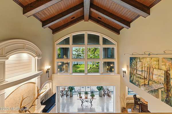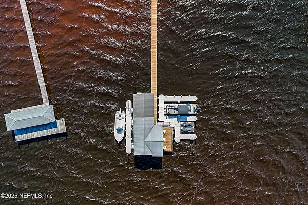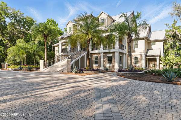Tucked along the tranquil banks of the St. Johns River, 140 Monterey Bay Lane is an extensively restored Riverfront Estate that is an exquisite blend of elegance and privacy. This custom-built home rests in a quiet sophistication between two rapidly expanding towns, and is just ten minutes from the newly opened First Coast Expressway, providing access to the historic charm of St. Augustine and the coastal beauty of Florida's beaches. An impressive three-story, 6-bedroom, 6-bath home with elevator access to all levels - spans 6,780 square feet and offers abundant storage throughout. Designed for entertaining, the resort-style amenities include a sprawling heated pool with a bridge and dual waterfalls, a brand-new summer kitchen, and a covered outdoor patio, all nestled on more than 3.8 beautifully landscaped acres. Complete with first floor apartment suite, a 2000+ sq ft RV and Boat Garage, and over 2000 sq ft of river dockage. Soaring 28-foot tongue-and-groove ceilings and shiplap walls highlight the entire home, while 16-foot wide fully retracting sliding glass doors plus a wall of windows above offer panoramic river views and seamless indoor-outdoor flow. Custom millwork, walnut hardwood flooring, integrated surround sound, floor electrical ports, and a floor-to-ceiling stone fireplace combine beauty and function. The chef's kitchen is designed for effortless entertaining with built-in Thermador and Miele appliances. An oversized-level 5 granite island anchors the space, surrounded by beautiful and functional custom cabinetry. A U-Line wine fridge at the built-in bar with wine rack and additional storage, along with a spacious walk-in pantry with counter plugs and adjustable shelving complete the ensemble. The luxurious owner's suite is a spa-like sanctuary, complete with a steam shower, Kohler 12 head full body shower system, overflow Kohler 12 jet hydrotherapy tub for two, Majestic LP gas fireplace, and a custom walk-in closet. Whole house is powered by an updated Crestron smart home system via mobile app and handheld remotes with custom room-by-room audio. Additional features include flawless Starlink internet, and three American Signature HVAC systems. Isonene insulation, a whole-home surge protector, and a 21kW Briggs & Stratton auto-on generator ensure efficiency and peace of mind.
