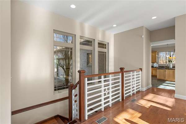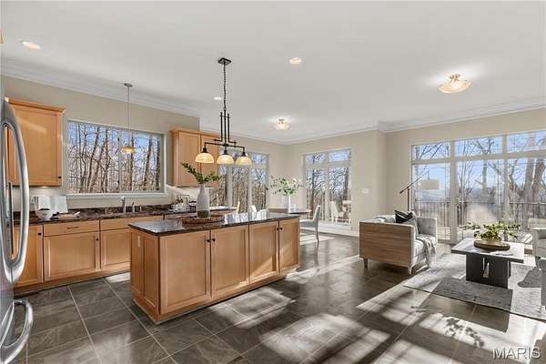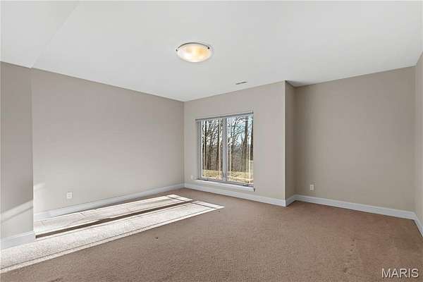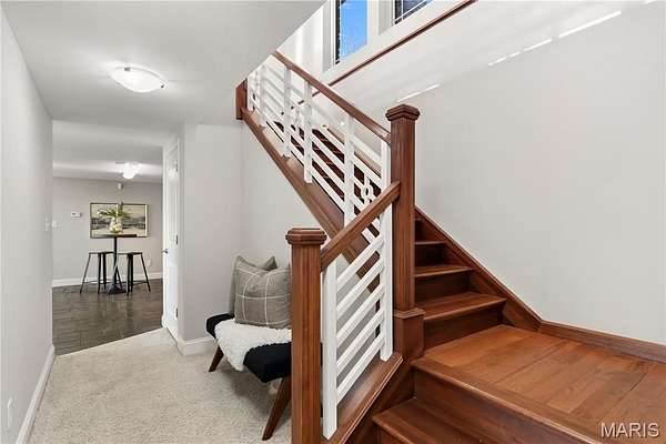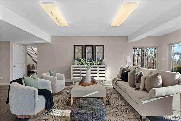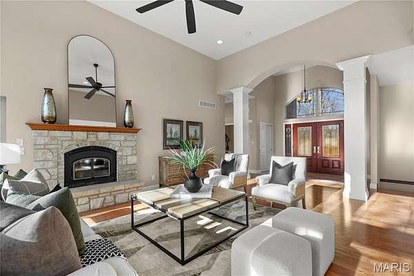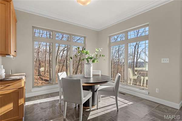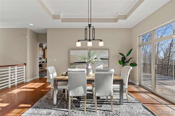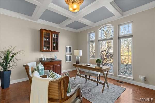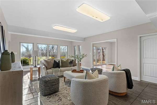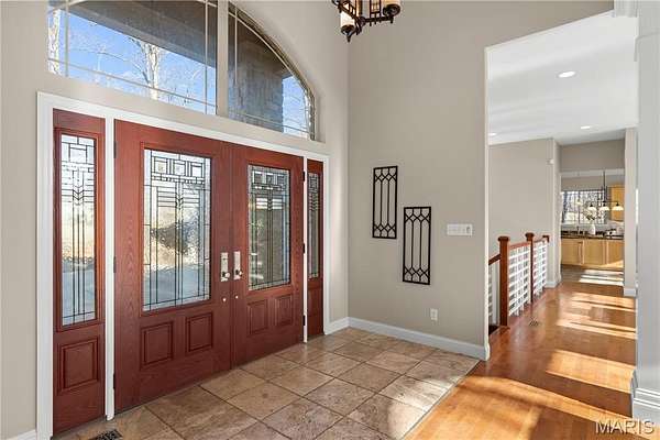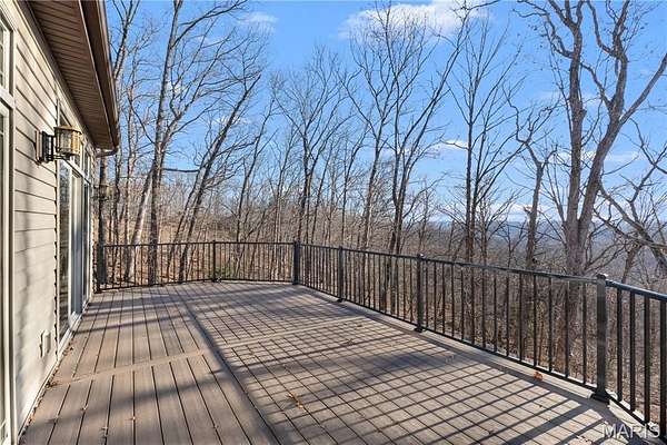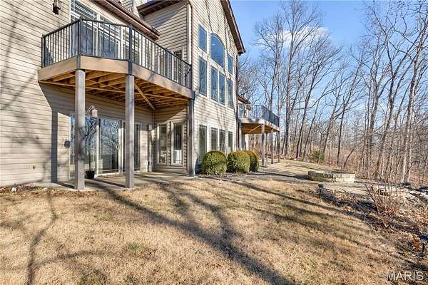 Experience refined living in this exceptional ranch home nestled in Defiance, within the highly acclaimed Francis Howell Schools. Thoughtfully designed for both elegance & comfort and freshly painted throughout, this residence showcases timeless travertine in the grand foyer & gleaming hardwood floors that flow through a sun-drenched living & dining space with soaring ceilings & a wood-burning fireplace, all framed by expansive windows capturing breathtaking wooded views. The chef's kitchen is a masterpiece, featuring custom maple cabinetry, wall oven, built-in microwave, island, pantry & a cozy breakfast room ideal for casual gatherings. Just off the kitchen, a powder room & a spacious laundry room add everyday convenience. Escape to your private library, featuring rich coffered ceilings & a wet bar--perfect for evening relaxation, with a nearby powder room for added ease. The main-level primary suite is a true sanctuary with new carpet, motorized shades for effortless light control and privacy, and private access to its own composite deck--perfect for quiet mornings or evening unwinding, along with a luxurious ensuite bath offering a jetted tub, walk-in shower, dual vanities & two walk-in closets, including a cedar closet. The walkout lower level expands your living options with two additional bedrooms, a full bath, a dedicated office & a generous recreation room. Outdoor living is elevated with a brand-new composite deck, stone patio & cozy firepit--all overlooking the tranquil landscape. This extraordinary home, featuring a new roof installed in July '25 and fresh, move-in-ready interiors, offers an unparalleled blend of luxury, serenity & sophistication. Welcome to your forever retreat!