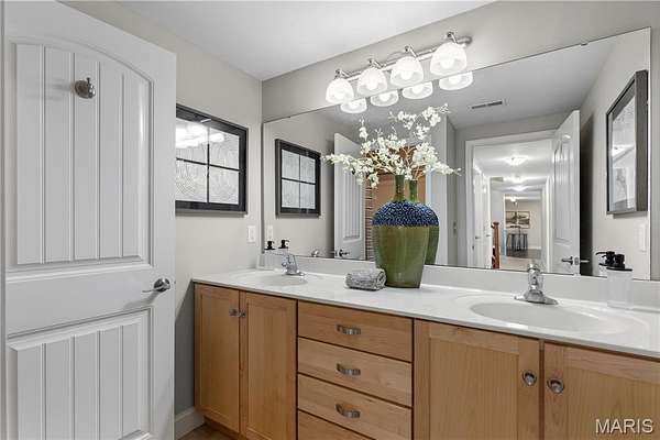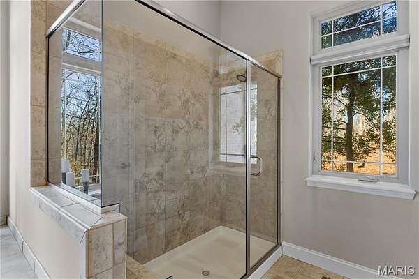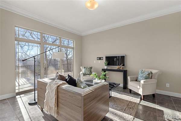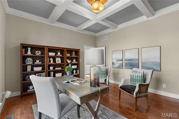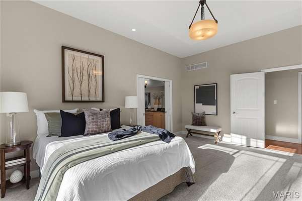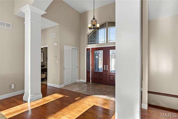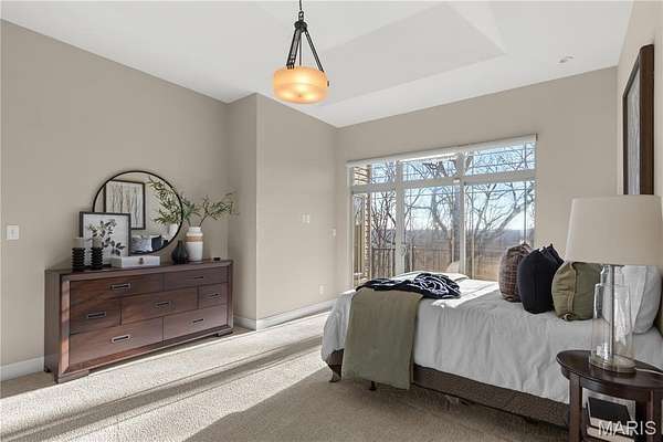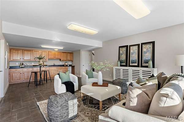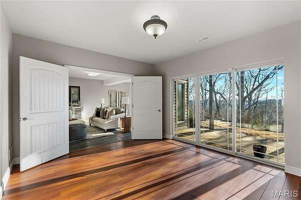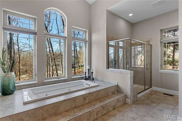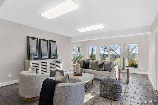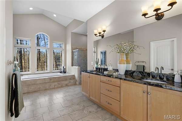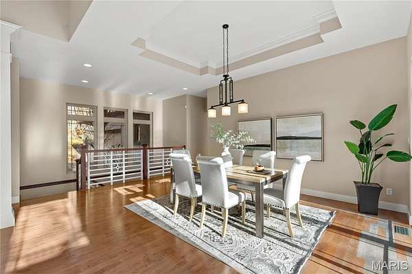 Experience refined living in this exceptional ranch home nestled in Defiance, within the highly acclaimed Francis Howell Schools. Thoughtfully designed for both elegance & comfort and freshly painted throughout, this residence showcases timeless travertine in the grand foyer & gleaming hardwood floors that flow through a sun-drenched living & dining space with soaring ceilings & a wood-burning fireplace, all framed by expansive windows capturing breathtaking wooded views. The chef's kitchen is a masterpiece, featuring custom maple cabinetry, wall oven, built-in microwave, island, pantry & a cozy breakfast room ideal for casual gatherings. Just off the kitchen, a powder room & a spacious laundry room add everyday convenience. Escape to your private library, featuring rich coffered ceilings & a wet bar--perfect for evening relaxation, with a nearby powder room for added ease. The main-level primary suite is a true sanctuary with new carpet, motorized shades for effortless light control and privacy, and private access to its own composite deck--perfect for quiet mornings or evening unwinding, along with a luxurious ensuite bath offering a jetted tub, walk-in shower, dual vanities & two walk-in closets, including a cedar closet. The walkout lower level expands your living options with two additional bedrooms, a full bath, a dedicated office & a generous recreation room. Outdoor living is elevated with a brand-new composite deck, stone patio & cozy firepit--all overlooking the tranquil landscape. This extraordinary home, featuring a new roof installed in July '25 and fresh, move-in-ready interiors, offers an unparalleled blend of luxury, serenity & sophistication. Welcome to your forever retreat!