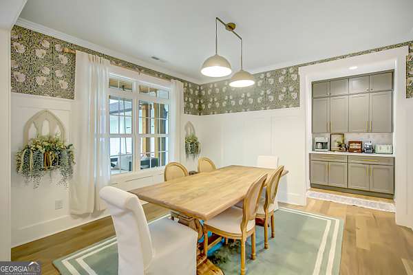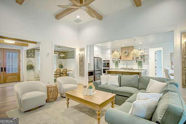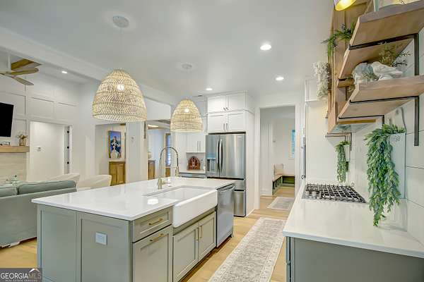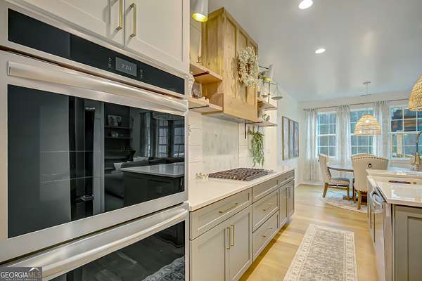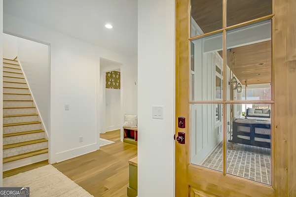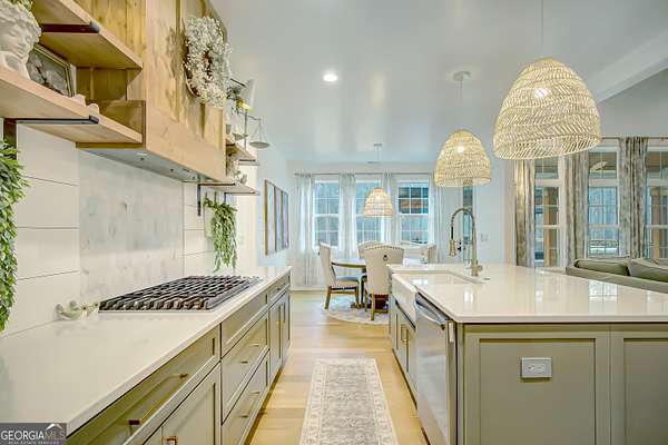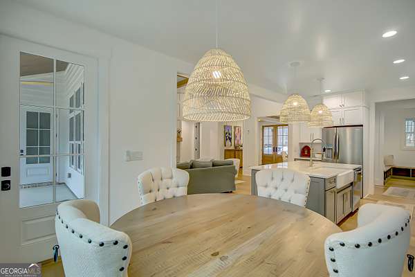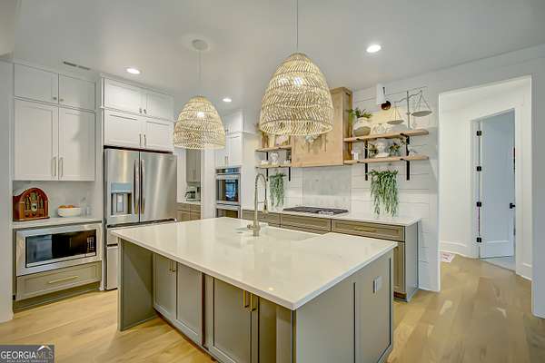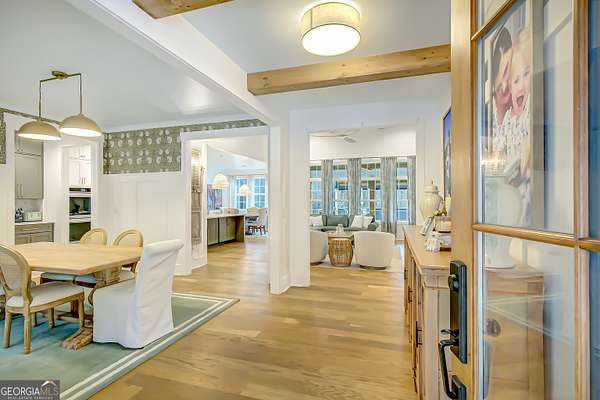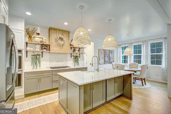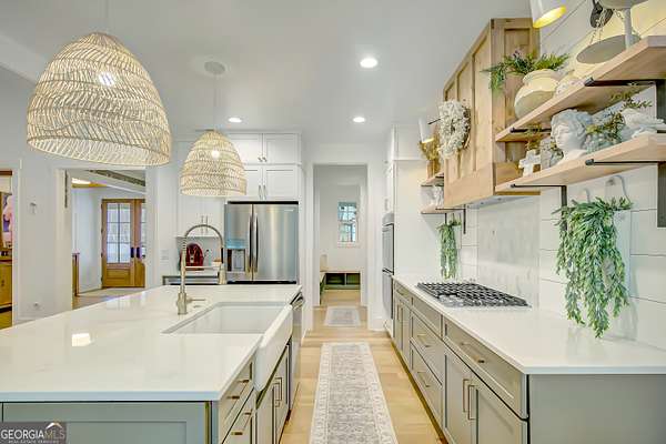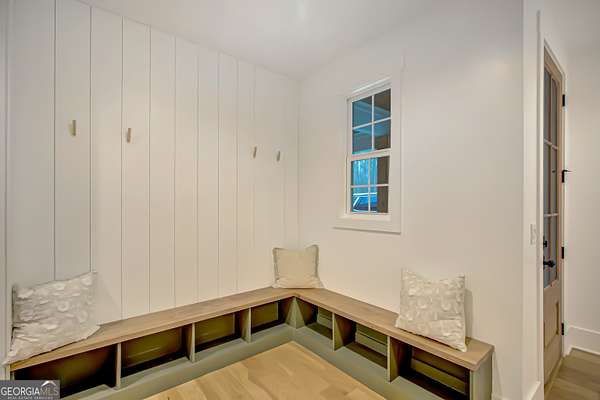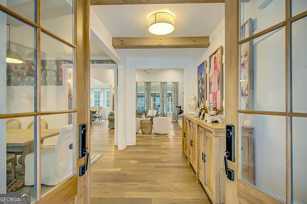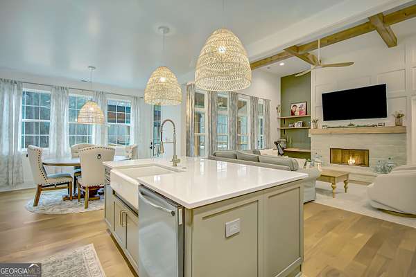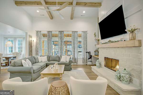 EXQUISITE & REFINED LIVING awaits in this nearly new 5-bedroom, 3.5-bath estate, perfectly positioned on 1.6+ private acres in the coveted Northgate school district. Just steps from the picturesque 300-acre Brown Reservoir, this residence blends upscale comfort with extraordinary craftsmanship and a resort-style outdoor experience. Step onto the charming front porch, finished in brick flooring and framed by dual daybed swings, creating the perfect spot to unwind. Gorgeous wooden double doors open into a home filled with natural light, elevated finishes, and an effortless, elegant flow. A sophisticated dining room trimmed with board and batten and designer wallpaper welcomes your guests before leading into the warm and inviting family room. Here you'll find a stunning stacked-stone fireplace, exposed beams, rich hardwood floors, and a stylish built-in workstation. The gourmet kitchen is a standout-expertly designed with a quartz-topped island, farmhouse sink, expansive cabinetry to the ceiling, a walk-in pantry plus a second scullery/pantry, a butler's pantry with coffee bar, and premium appliances including double ovens, a 5-burner gas cooktop, and a drawer microwave. A breakfast bar and inviting dining nook make this space both functional and beautiful. The main-level primary suite is intentionally serene, featuring a custom accent wall and a spa-inspired bathroom with a soaking tub, oversized glass-and-tile shower, and a beautifully organized custom closet. Two additional main-floor bedrooms share a full bath with thoughtful placement and design. Convenience continues with a large mudroom offering built-in seating and storage, along with an expansive laundry room featuring custom cabinetry and a utility sink. A private staircase leads to the upper level, where you'll find two more spacious bedrooms, a full bath, and a massive bonus room ideal for a home theater, recreation space, or creative studio. The oversized 2.5-car garage features an epoxy floor and EV charging station, plus an additional charger located off the driveway. The backyard is a true highlight-your own outdoor sanctuary. Enjoy a covered outdoor kitchen with granite counters, built-in Blackstone grill, sink, and dedicated firewood storage. An inviting dining terrace, cozy fire pit area, and additional covered patio create endless spaces to relax or entertain. All this, with no HOA to limit your lifestyle. Enjoy boating and fishing at the nearby reservoir and the convenience of being minutes to the new Publix shopping center and I-85. This property delivers luxury, functionality, and an unmatched lifestyle-a rare offering and absolutely one you must experience in person.