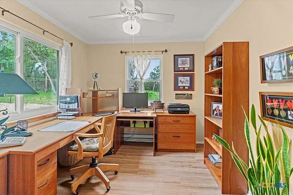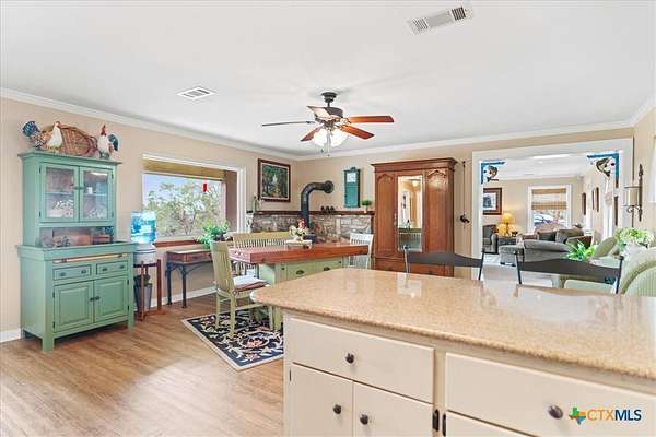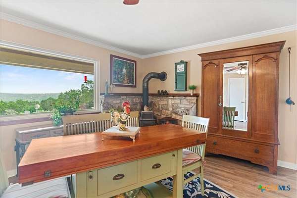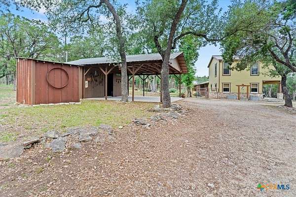 Enjoy breathtaking long-distance views right from your front porch in this inviting Hill Country retreat! Situated on beautifully maintained grounds, this home offers privacy, natural beauty, and comfort throughout. Picturesque windows flood every room with natural light and perfectly frame the scenic surroundings. NOTE: The wood stove does not function at this time. The flexible floor plan features two bedrooms and a full bath on the main level, while the spacious primary suite occupies the second floor for added privacy. Step outside to a fenced backyard ideal for pets or gardening. A two-vehicle carport includes a rear-attached workshop-perfect for hobbies or extra storage. Just minutes from the heart of Wimberley, this home offers the perfect blend of peaceful living and convenient access to town.