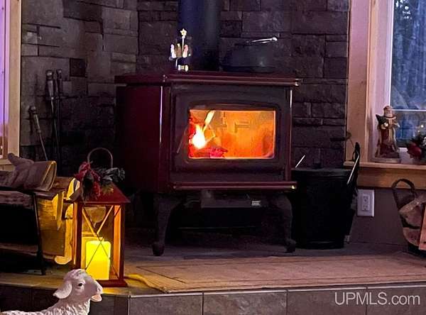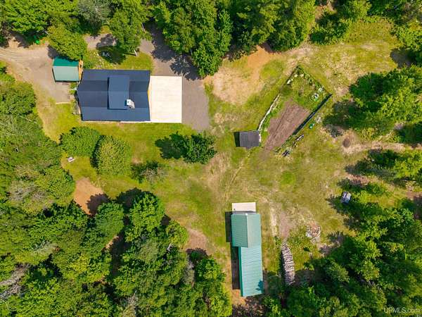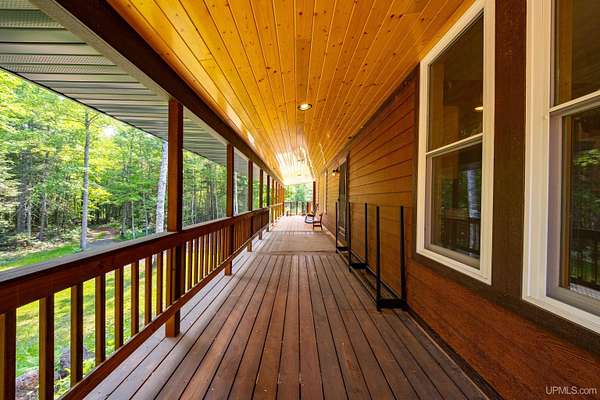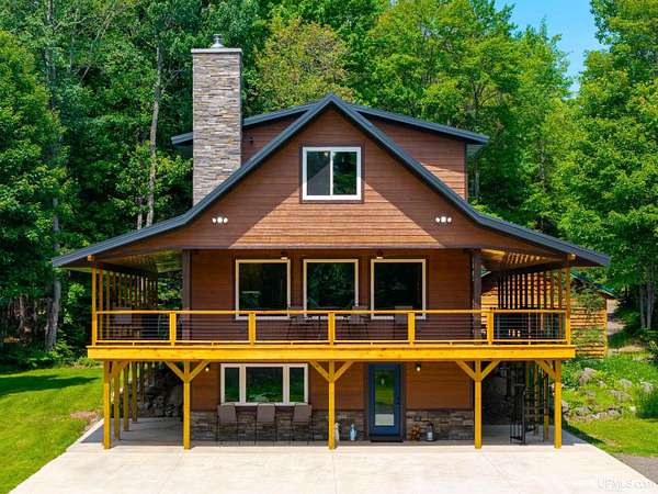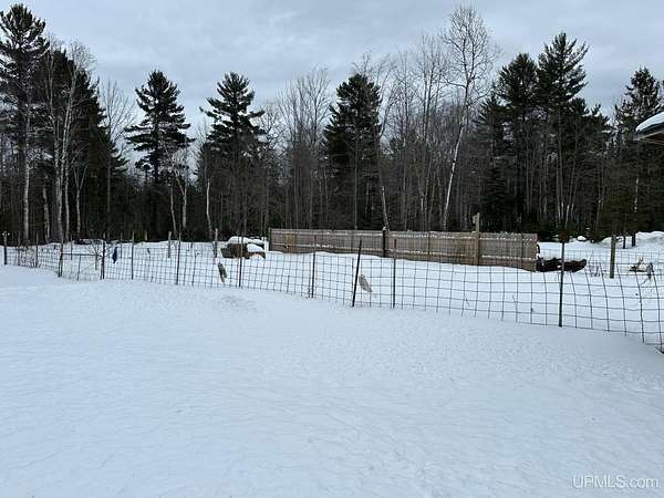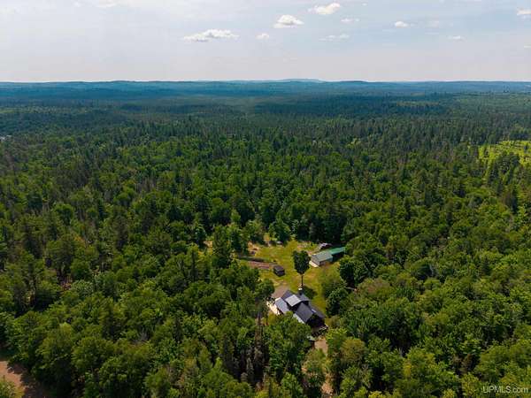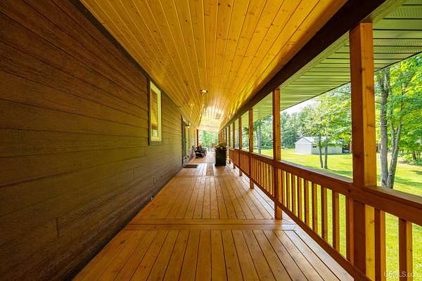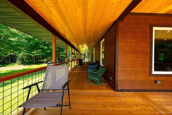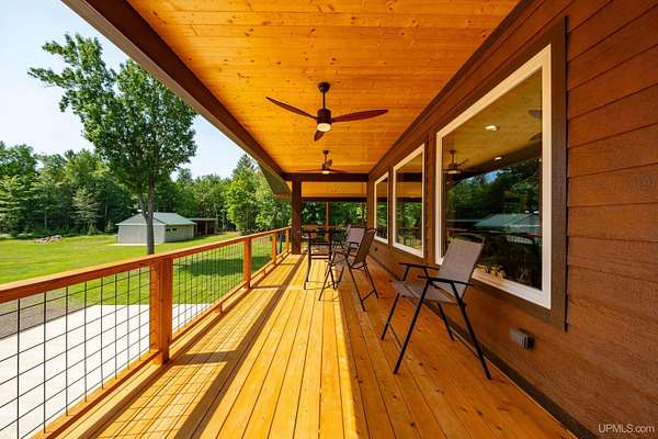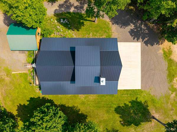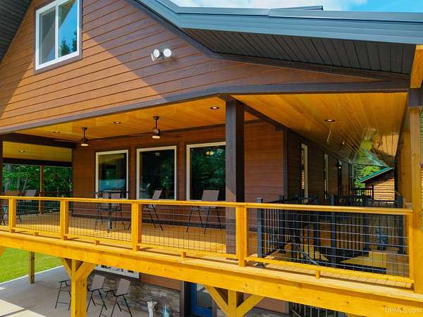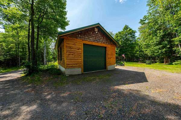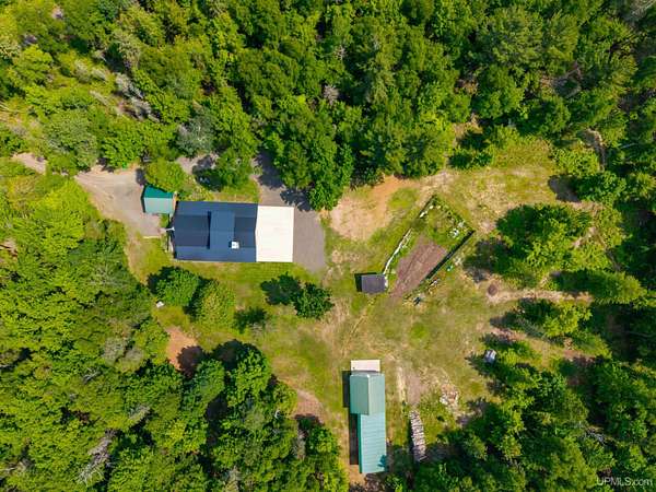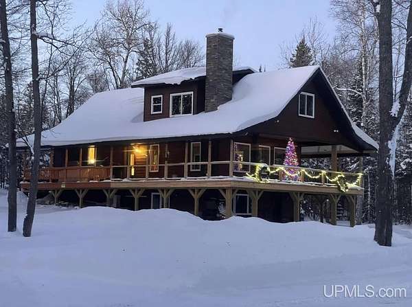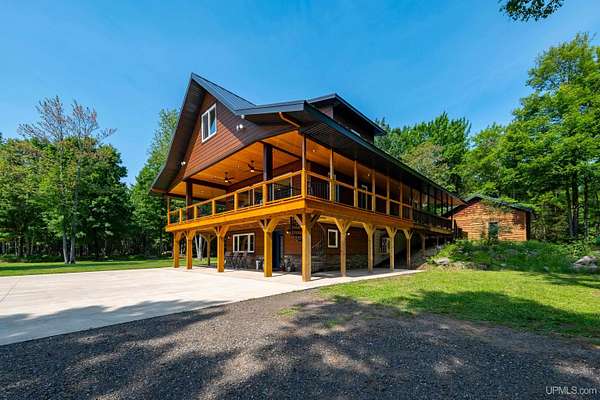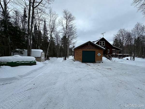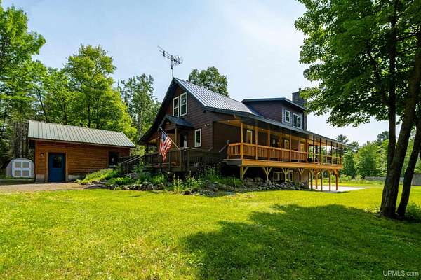 Stunning 4/5 bedroom, 2.5-bath home with 2-full kitchens was originally built in 2001 & extensively renovated and expanded. Located just 15 minutes from Ishpeming & adjacent to the Hoist Basin. This beautiful wooded 10-acre non-association property offers ATV/walking trails, and exceptional privacy surrounded by maple, birch & massive white pines. High-grade material construction and fixtures are showcased throughout (see virtual & video tours). A wide concrete apron leads to an expansive cedar wraparound deck, about 3/4 covered, accented by tongue-and-groove ceilings and a charming spiral staircase. Nearly every room offers serene, wooded views. Outdoors also feature a large, fenced garden and a versatile shed (previously a chicken coop) equipped with electricity and running water. Outbuildings include a 20'x19' detached, heated garage with 9' ceilings, a 24'x30' pole barn with poured concrete floors, electric, and water, and three high-ceiling 16'x16' lean-to bays for storing recreational gear or equipment. Mechanical systems are high-efficiency: a new NTI propane boiler with six heating zones, PEX plumbing, on-demand hot water, and a backup Hardy stainless steel outdoor wood boiler that heats the house, garage, and water. The entire home is outfitted with radiant in-floor heating and central A/C via a heat pump rated for subzero temps. Foam insulation in the roof, walls, and floors ensures optimal efficiency, paired with a hidden-fastener metal roof and low-E, argon-filled safety-rated windows. Interior flooring features Swedish "Valinge" 1/2 " real oak throughout. The walk-out lower level is ideal for a guest suite, Airbnb, or in-law suite, offering a full second kitchen with quartz countertops and custom birch cabinets, a tiled barrier-free full bath, laundry hook-ups, an office/bedroom, a mechanical room, and a large den for relaxation & entertaining. The main level showcases 9' ceilings and a spacious Great Room with three oversized picture windows that frame views of the surrounding forest and garden. A Pacific Energy high-efficiency enamel wood stove offers excellent supplemental heat. The open-concept main kitchen is fully outfitted with GE Cafe appliances, solid maple custom cabinetry, granite countertops, a large eat-in island, and ceramic tile flooring. This level also features a half bath and a versatile bedroom that can serve as an office or den. Three entry doors provide direct access to the wraparound deck, creating seamless indoor-outdoor living. Upstairs, you'll find 2/3 additional bedrooms, including a private master suite with scenic views, a walk-in closet, and a luxurious bath featuring a soaking tub and a digital four-head walk-in tile shower. The upper level also includes a second spacious bedroom and a large laundry room that doubles as a craft or hobby space. This is a rare opportunity to own a thoughtfully, energy-smart, move-in-ready retreat in a peaceful and private setting, perfect for those seeking comfort & adventure!