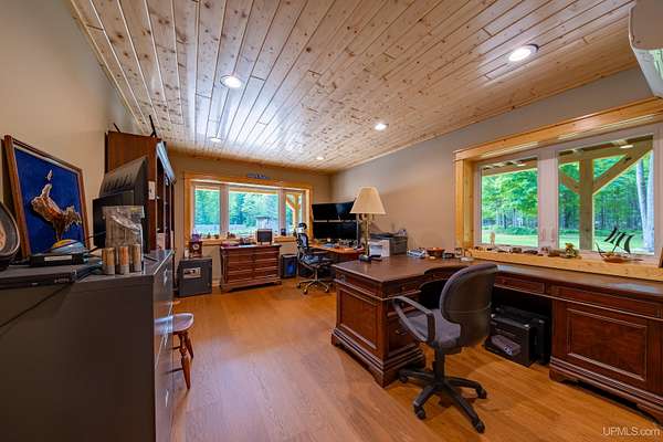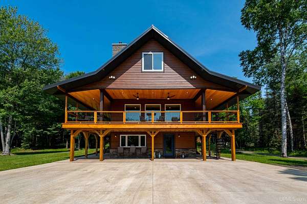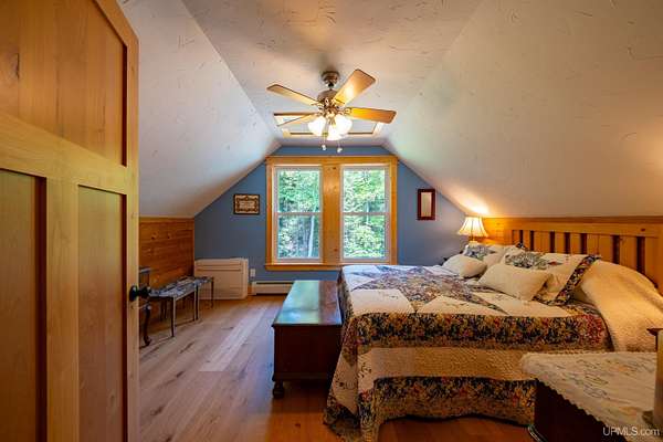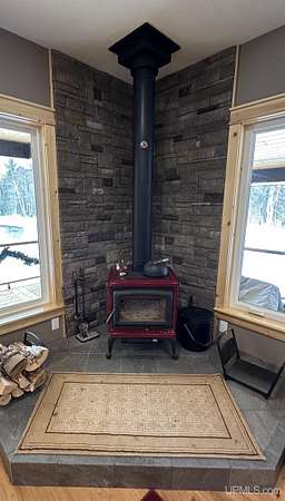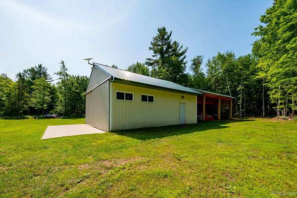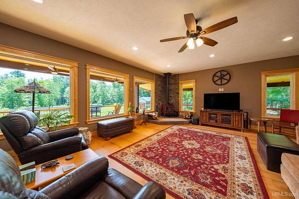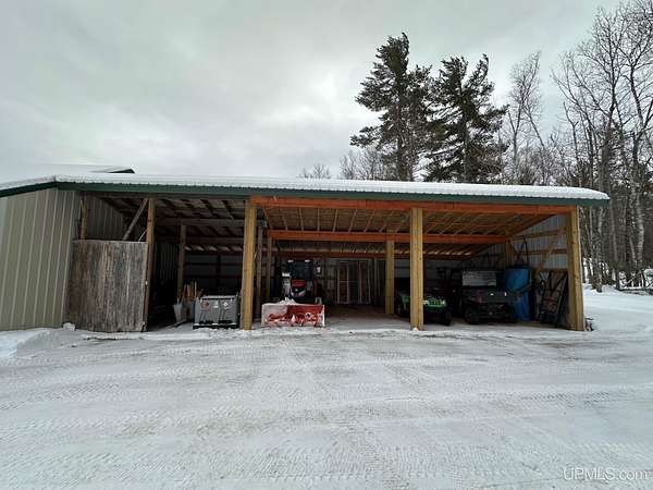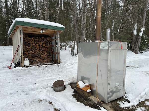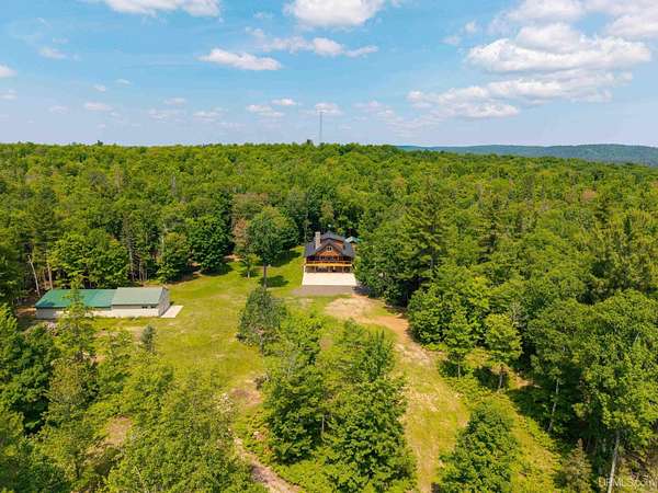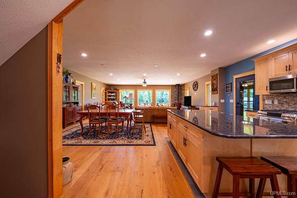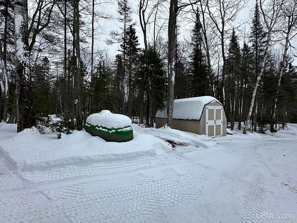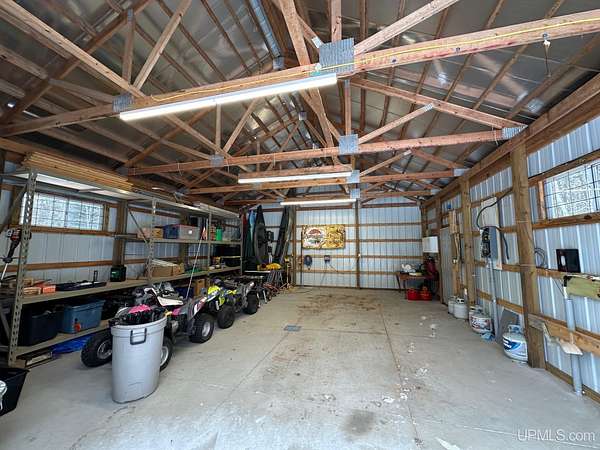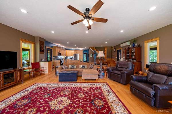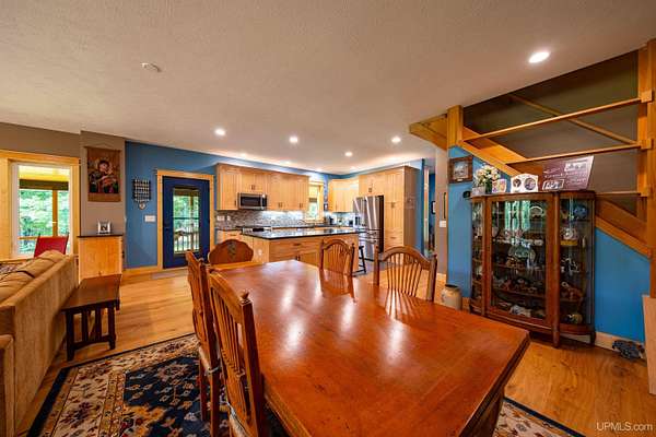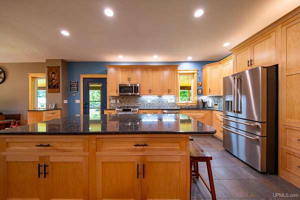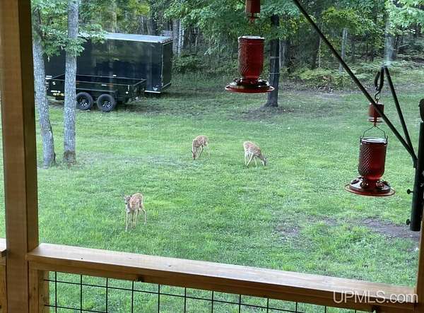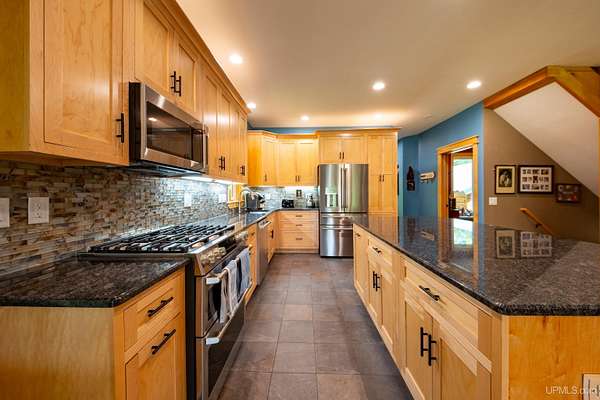 Stunning 4/5 bedroom, 2.5-bath home with 2-full kitchens was originally built in 2001 & extensively renovated and expanded. Located just 15 minutes from Ishpeming & adjacent to the Hoist Basin. This beautiful wooded 10-acre non-association property offers ATV/walking trails, and exceptional privacy surrounded by maple, birch & massive white pines. High-grade material construction and fixtures are showcased throughout (see virtual & video tours). A wide concrete apron leads to an expansive cedar wraparound deck, about 3/4 covered, accented by tongue-and-groove ceilings and a charming spiral staircase. Nearly every room offers serene, wooded views. Outdoors also feature a large, fenced garden and a versatile shed (previously a chicken coop) equipped with electricity and running water. Outbuildings include a 20'x19' detached, heated garage with 9' ceilings, a 24'x30' pole barn with poured concrete floors, electric, and water, and three high-ceiling 16'x16' lean-to bays for storing recreational gear or equipment. Mechanical systems are high-efficiency: a new NTI propane boiler with six heating zones, PEX plumbing, on-demand hot water, and a backup Hardy stainless steel outdoor wood boiler that heats the house, garage, and water. The entire home is outfitted with radiant in-floor heating and central A/C via a heat pump rated for subzero temps. Foam insulation in the roof, walls, and floors ensures optimal efficiency, paired with a hidden-fastener metal roof and low-E, argon-filled safety-rated windows. Interior flooring features Swedish "Valinge" 1/2 " real oak throughout. The walk-out lower level is ideal for a guest suite, Airbnb, or in-law suite, offering a full second kitchen with quartz countertops and custom birch cabinets, a tiled barrier-free full bath, laundry hook-ups, an office/bedroom, a mechanical room, and a large den for relaxation & entertaining. The main level showcases 9' ceilings and a spacious Great Room with three oversized picture windows that frame views of the surrounding forest and garden. A Pacific Energy high-efficiency enamel wood stove offers excellent supplemental heat. The open-concept main kitchen is fully outfitted with GE Cafe appliances, solid maple custom cabinetry, granite countertops, a large eat-in island, and ceramic tile flooring. This level also features a half bath and a versatile bedroom that can serve as an office or den. Three entry doors provide direct access to the wraparound deck, creating seamless indoor-outdoor living. Upstairs, you'll find 2/3 additional bedrooms, including a private master suite with scenic views, a walk-in closet, and a luxurious bath featuring a soaking tub and a digital four-head walk-in tile shower. The upper level also includes a second spacious bedroom and a large laundry room that doubles as a craft or hobby space. This is a rare opportunity to own a thoughtfully, energy-smart, move-in-ready retreat in a peaceful and private setting, perfect for those seeking comfort & adventure!
