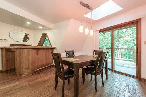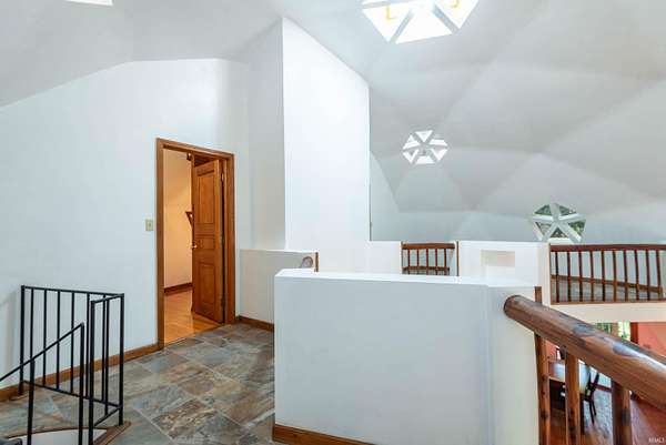Commune with nature in a park like setting in this beautiful geodesic home on Bloomington's north side. This stunning architectural home has four bedrooms, two lofts and 2 1/2 bathrooms. Surround yourself with mature trees and custom stone terraces, stairs and patios in this home that lives like a resort. Fresh updates to this home enhance the beauty of the space. The private lane that leads to this home creates a feeling of tranquility as you decompress. Extensive plant varieties, a babbling brook and at least 20 varieties of ferns have created an ecosystem here that is unmatched. The open entertaining spaces are great for large gatherings. Great location and access to Indiana University, northside access to Indianapolis commuters and ideal location for access to Bloomington's downtown shops and restaurants.