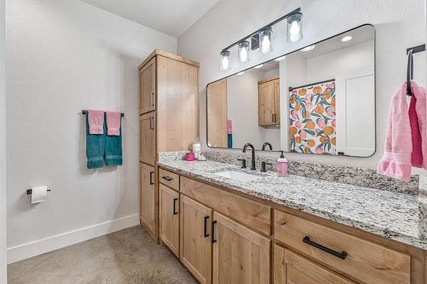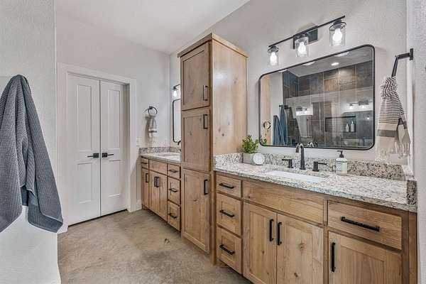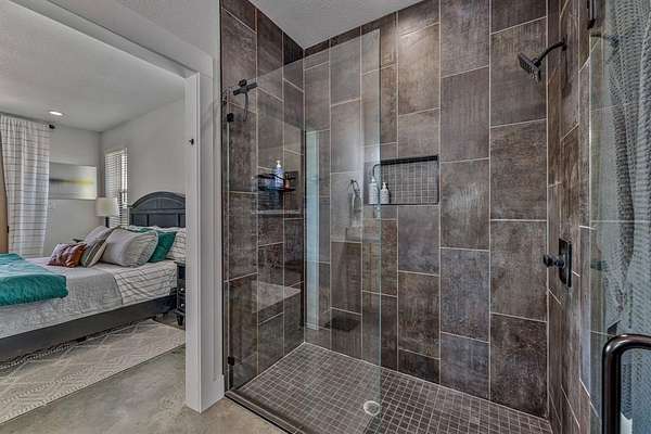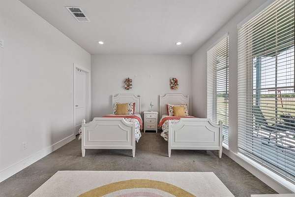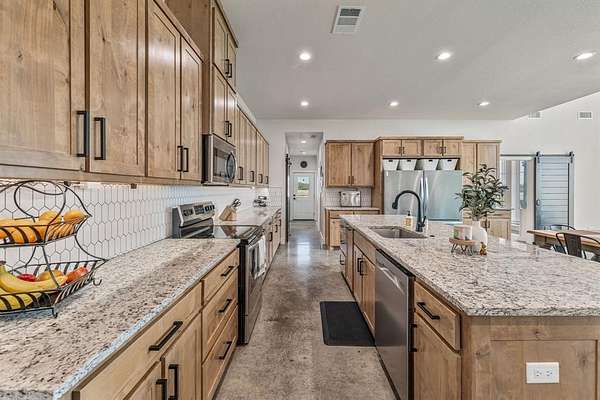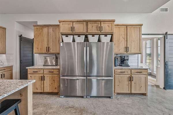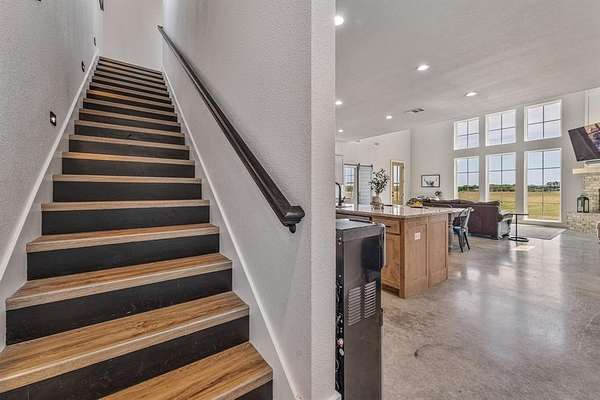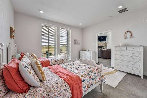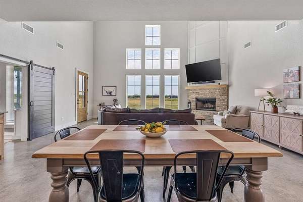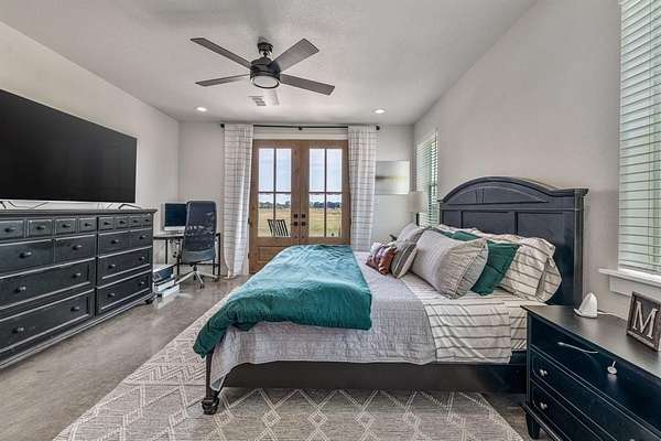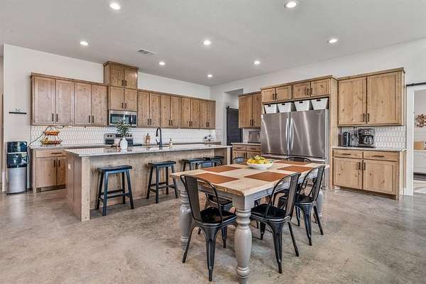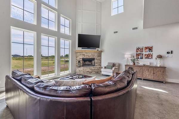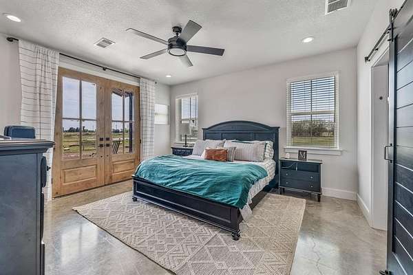 Step inside to a 25-foot vaulted living room ceiling with custom stained concrete floors and an open-concept design perfect for entertaining. Kitchen features an oversized walk-in pantry, large island, double fridge-freezers and ample cabinetry space. The luxurious master suite features French doors opening to a private patio, spacious walk in closet, and a large walk-in shower for a spa-like experience. Enjoy mornings or evenings on the patio overlooking a three-quarter acre pond freshly stocked with bluegill and bass.