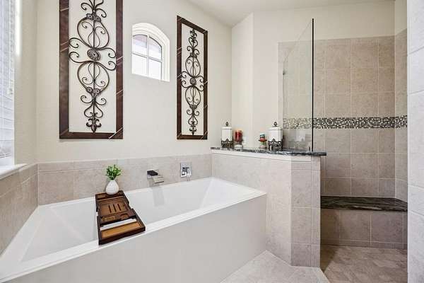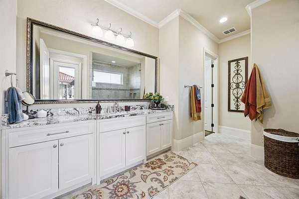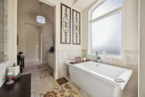 The primary suite is a true sanctuary with a generous bedroom, sitting area, and versatile workout or bonus room, along with a spa-like en suite bath complete with a double shower and stand-alone soaking tub. Additional bedrooms each feature private baths and ample closet space, offering both comfort and privacy for family and guests.