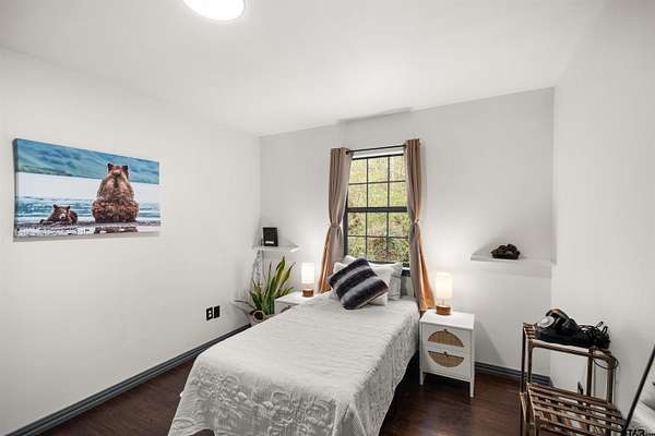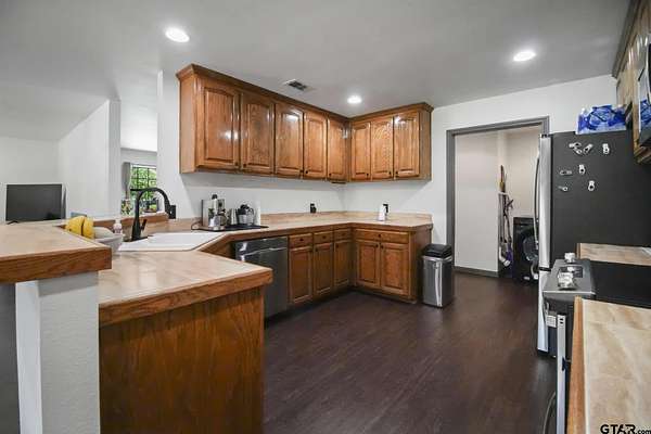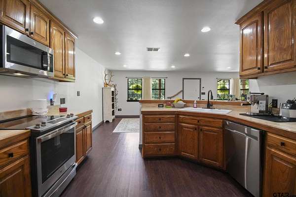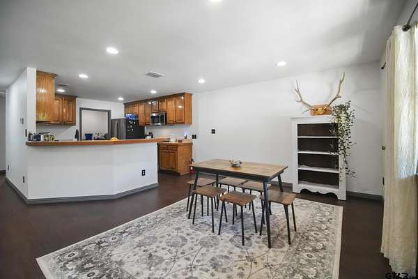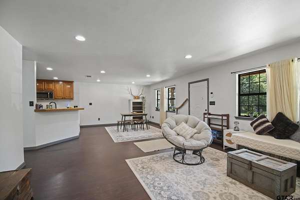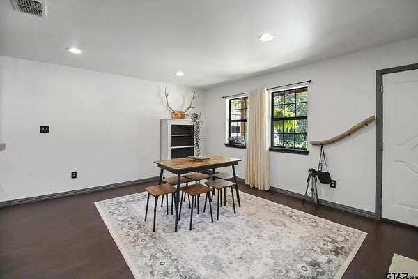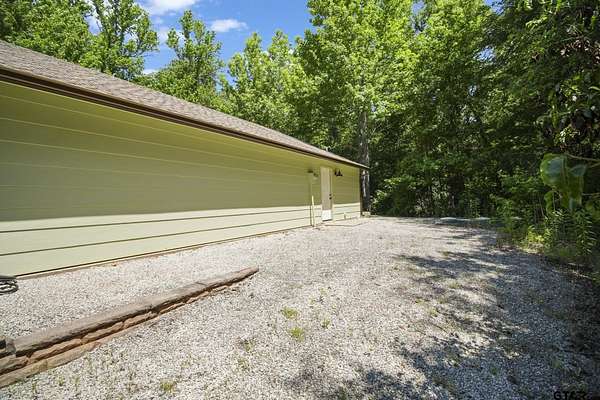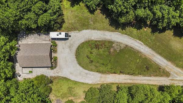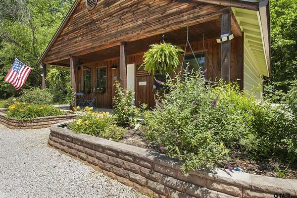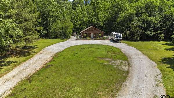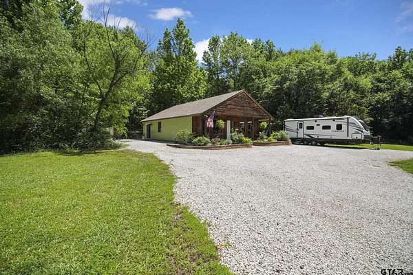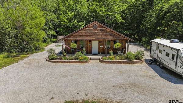 A rare opportunity to own a one of a kind East Texas retreat set on over 8.7 acres of peaceful countryside. Tucked behind a gated entry and tree lined asphalt drive, the property opens to a large clearing with a circular gravel drive and a charming cabin style home privately set back among the trees. The surrounding acreage provides exceptional privacy, room to roam, and the quiet beauty of nature that is becoming harder to find this close to town. Built in 2010, the home now functions as a comfortable 2 bedroom cabin style residence, perfect for those seeking a slower pace and a connection to nature. Inside, the open layout features high ceilings and abundant natural light flowing through the living, dining, and kitchen areas, creating a warm and inviting atmosphere. The kitchen offers solid oak cabinetry, porcelain countertops, and plenty of prep and storage space. One bedroom offers a walk in closet and sliding glass door overlooking the wooded landscape, while the second bedroom provides flexibility for guests or a home office. The oversized bathroom features a tiled walk in shower with zero threshold entry. A spacious laundry room leads to the attic, which is fully floored and spray foam insulated for additional storage or future expansion. Just over 4 acres of the property are usable non flood land while the remaining acreage is wooded greenbelt, creating a natural buffer filled with shade and wildlife. The setting captures a peaceful cabin lifestyle rarely found this close to Tyler. The property also features over 650 feet of frontage along Highway 31W with convenient access to Toll 49, Loop 323, and Interstate 20, creating a rare opportunity where a private residential retreat also offers long term commercial or mixed use potential. call for you showing today!