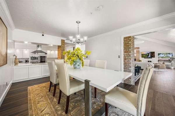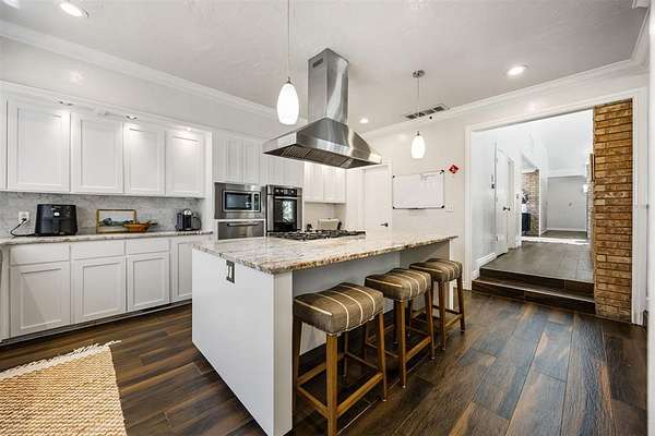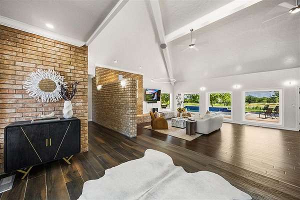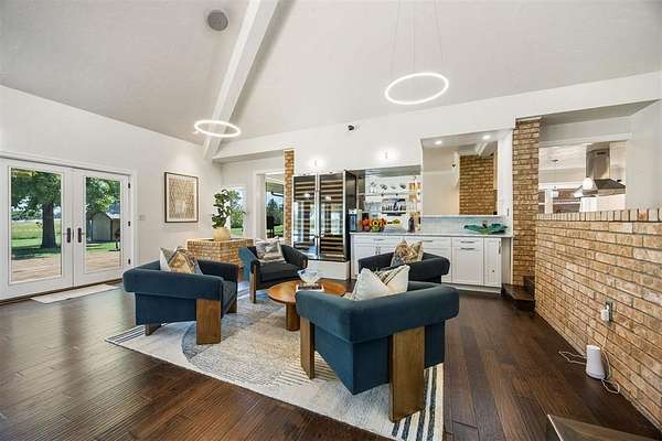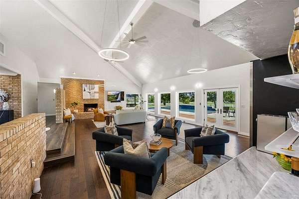 Step inside to discover a home with midcentury modern character: vaulted ceilings, skylights, and exposed brick create a warm yet stylish vibe. With two living areas surrounded by windows looking out to the pool and peaceful property, a bar and a powder bath that serves the main living areas with ease. The kitchen is made for both everyday living and entertaining with granite counters, a gas stove, and double ovens.