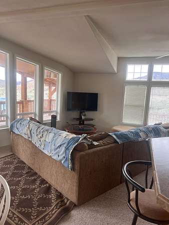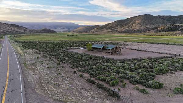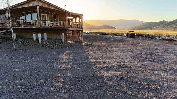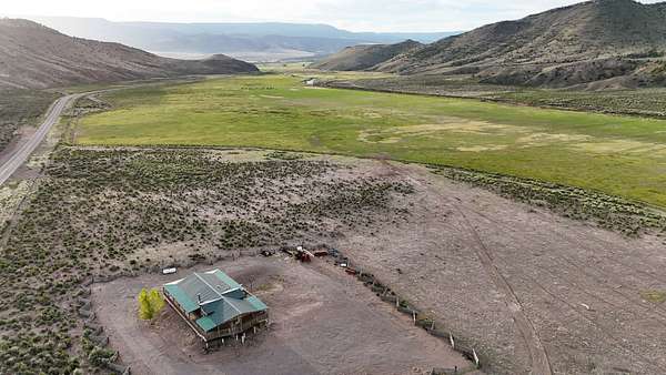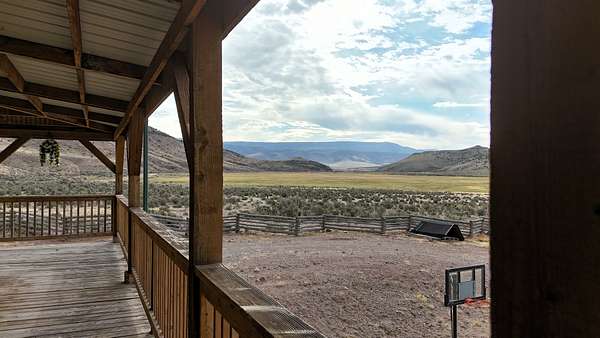 The primary residence sits on an elevated location overlooking portions of the river bottom and surrounding mountains. The home measures approximately 1,674 square feet and includes three bedrooms and two bathrooms. It is positioned above a garage and features a covered wraparound porch that offers views of the river corridor and nearby mountain ranges. The home is serviced by electrical power, a culinary water well, septic system, and propane.