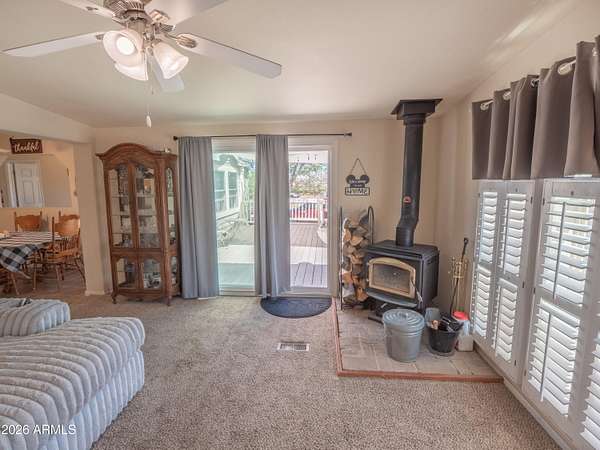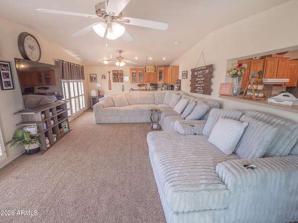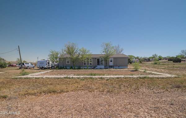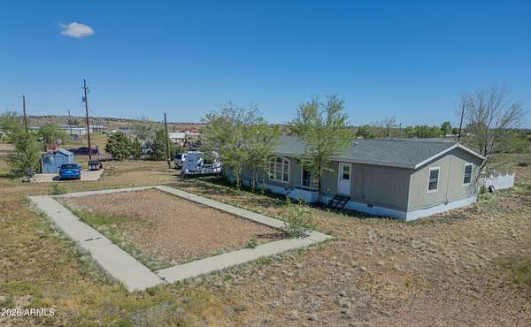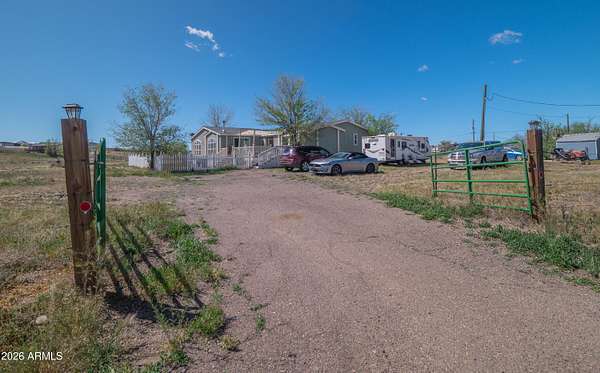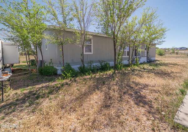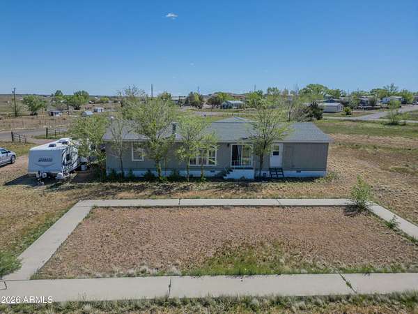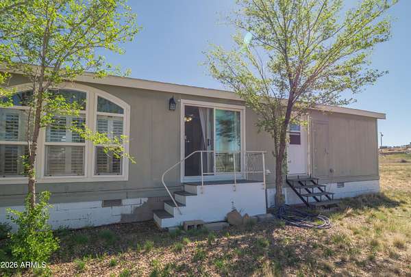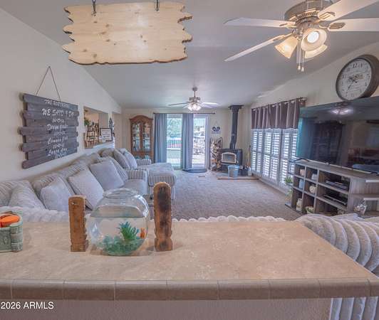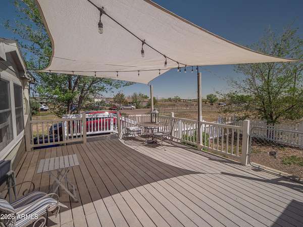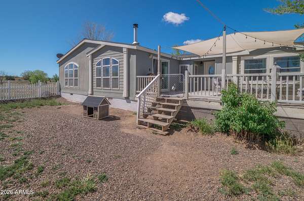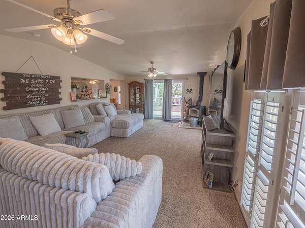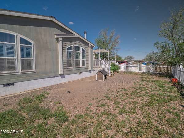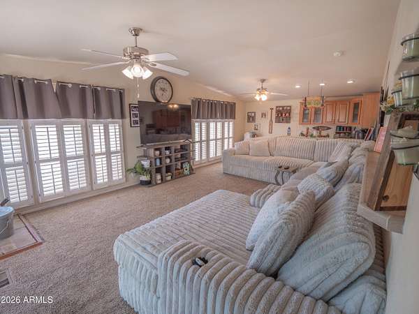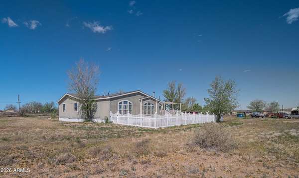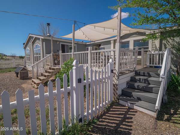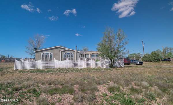 Roomy triple-wide manufactured home set on over 2.5 acres in Taylor, Arizona. The well-thought-out floor plan offers both a formal living room with a fireplace and a separate family room featuring a wood stove and wet bar--offering two distinct spaces to relax or entertain. Plantation shutters in both living areas add a clean, finished look. The kitchen is built for function, with extensive cabinetry, generous counter space, and an island with breakfast bar seating. The primary suite is oversized, offering dual closets and a roomy bathroom with a garden tub, separate shower, and double vanity Outside, the property is fully fenced with RV parking and plenty of space for horses, livestock, or additional equipment. A large Trex front deck provides a solid outdoor living area, complemented by attractive white yard fencing. A concrete slab is already in place for a future garage or shop. Furnishings available on separate bill of sale