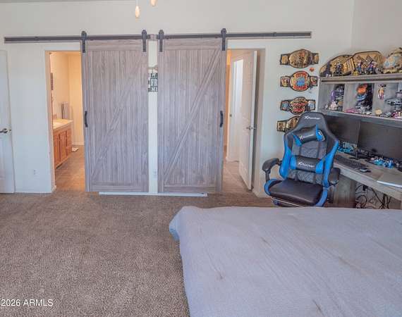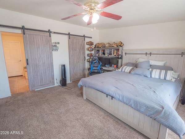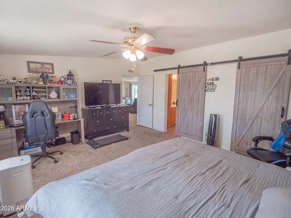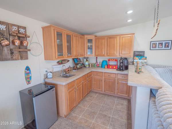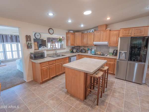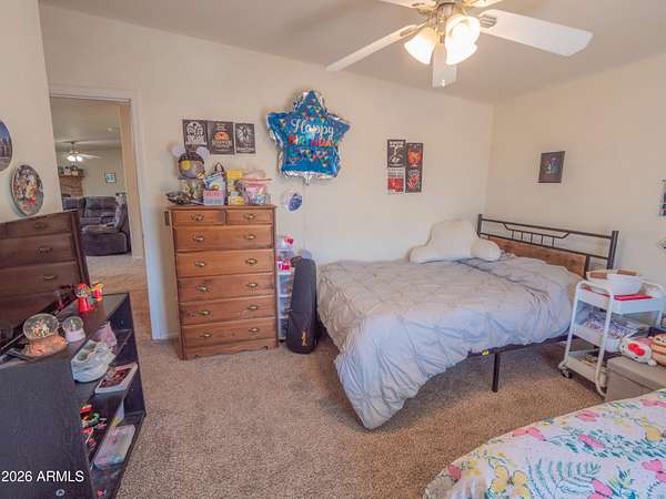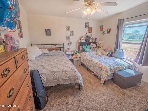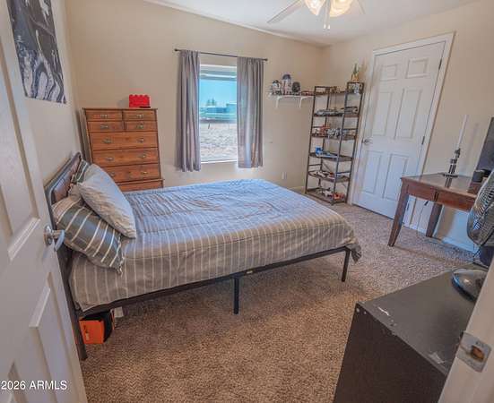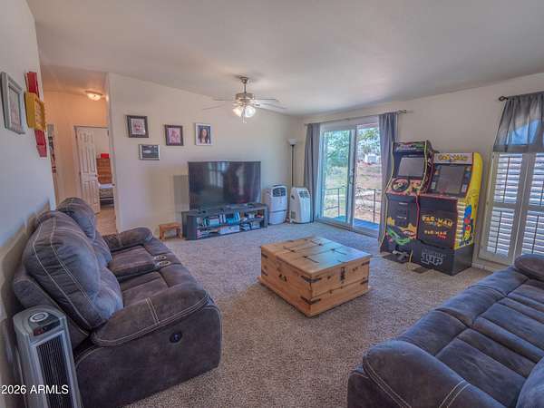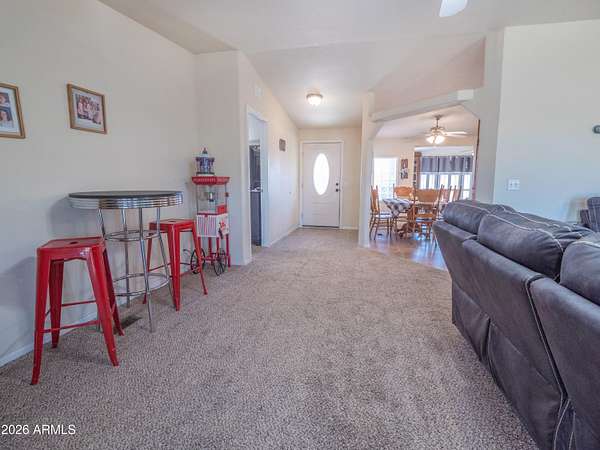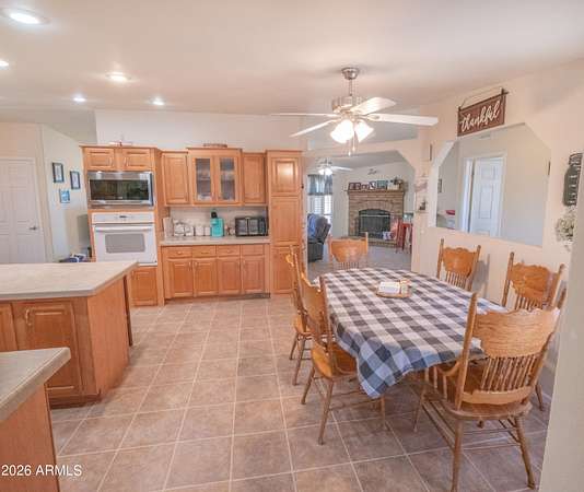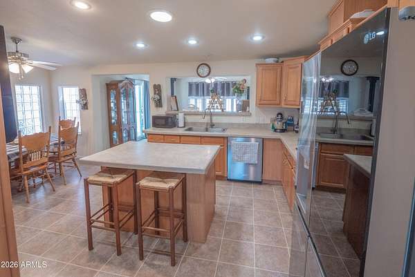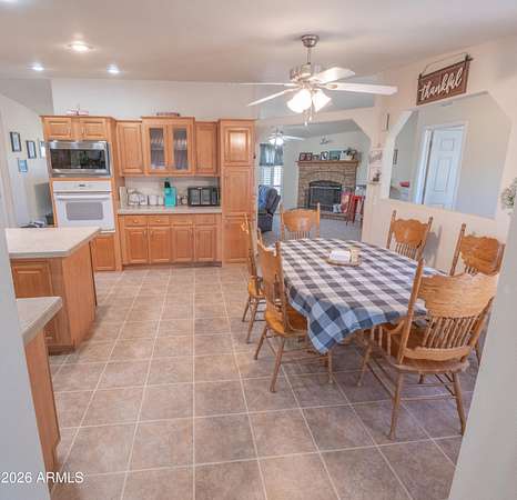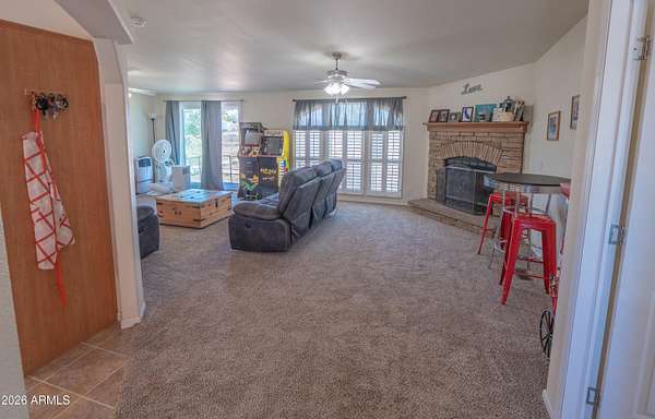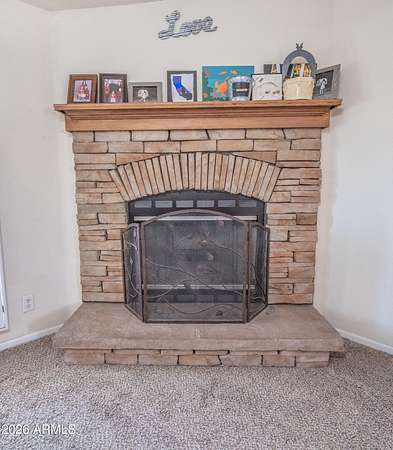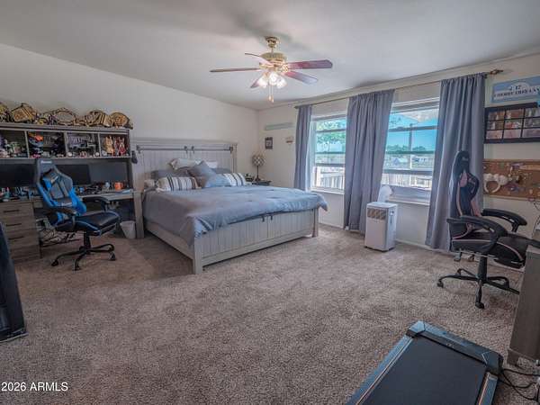 Roomy triple-wide manufactured home set on over 2.5 acres in Taylor, Arizona. The well-thought-out floor plan offers both a formal living room with a fireplace and a separate family room featuring a wood stove and wet bar--offering two distinct spaces to relax or entertain. Plantation shutters in both living areas add a clean, finished look. The kitchen is built for function, with extensive cabinetry, generous counter space, and an island with breakfast bar seating. The primary suite is oversized, offering dual closets and a roomy bathroom with a garden tub, separate shower, and double vanity Outside, the property is fully fenced with RV parking and plenty of space for horses, livestock, or additional equipment. A large Trex front deck provides a solid outdoor living area, complemented by attractive white yard fencing. A concrete slab is already in place for a future garage or shop. Furnishings available on separate bill of sale
