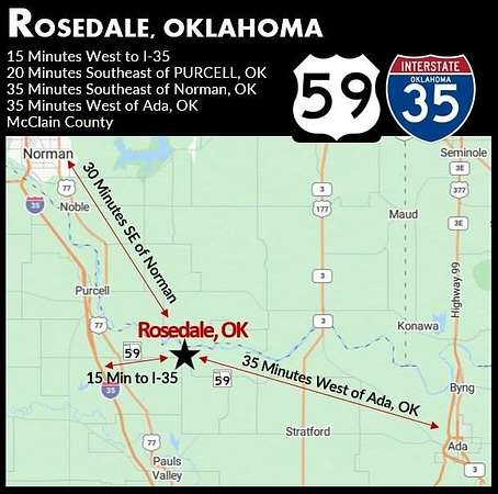 Interstate 35 go East on Hwy 59 toward Wayne, OK; continue on Hwy 59 for 6 miles and turn left/North on Lake Road Ave (just before Rosedale, OK). 2nd parcel on East side of road.